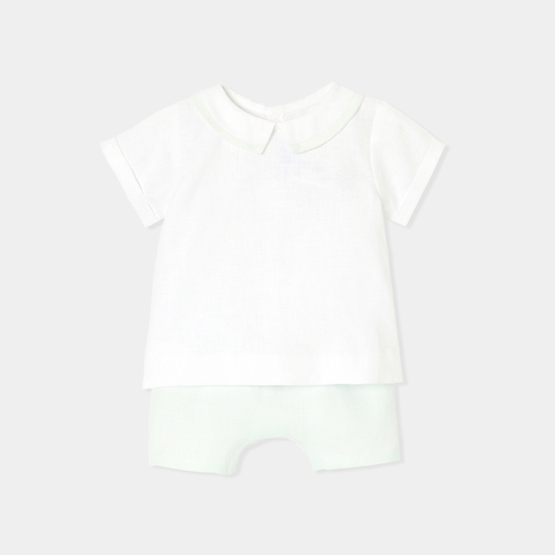 Per completare l'outfit del tuo bambino, considera gli accessori coordinati. Una corona di fiori, un cardigan in cotone o un gilet in lino possono aggiungere un tocco finale elegante. I body e i pigiami, disponibili in vari colori, assicurano una continuità stilistica offrendo al contempo il massimo comfort.