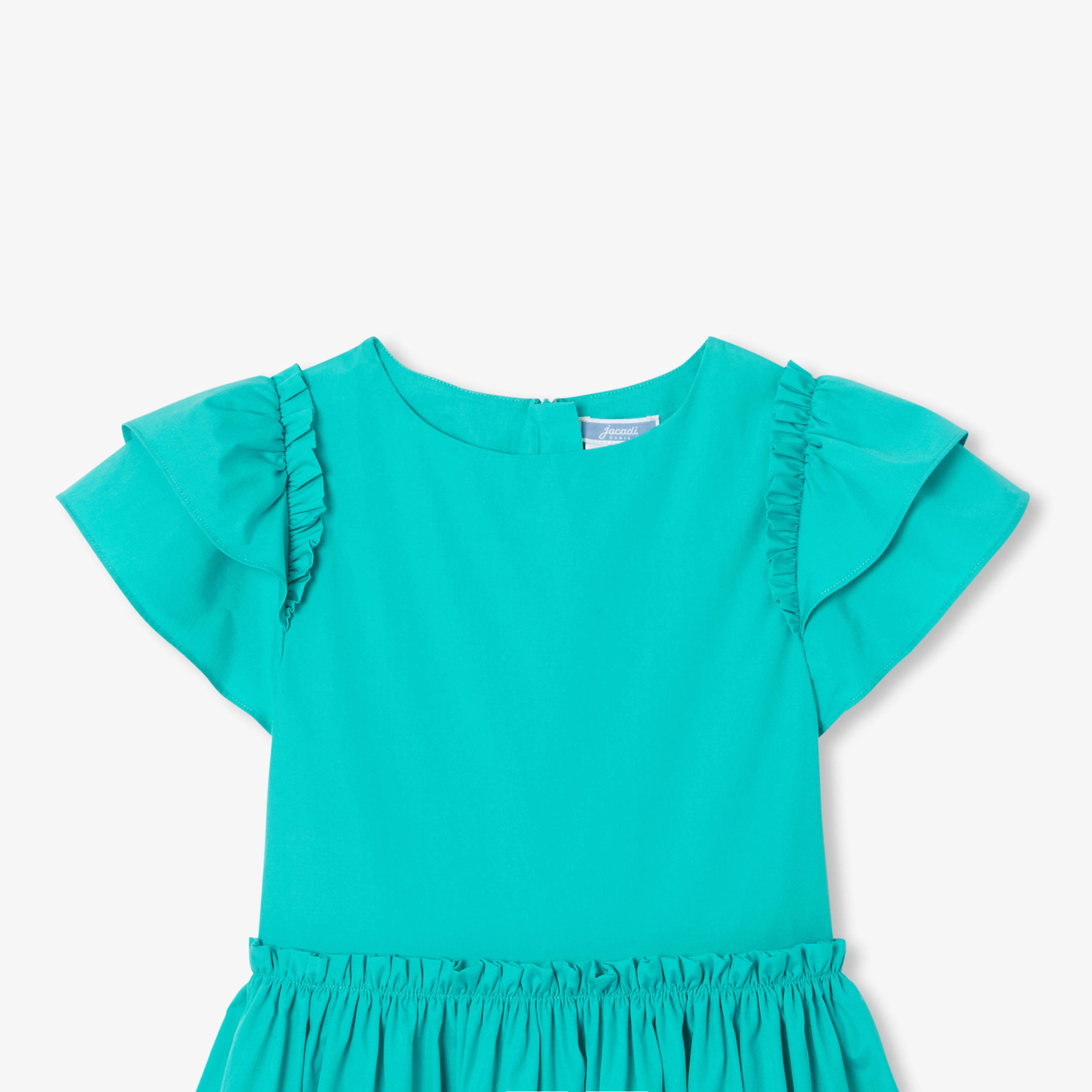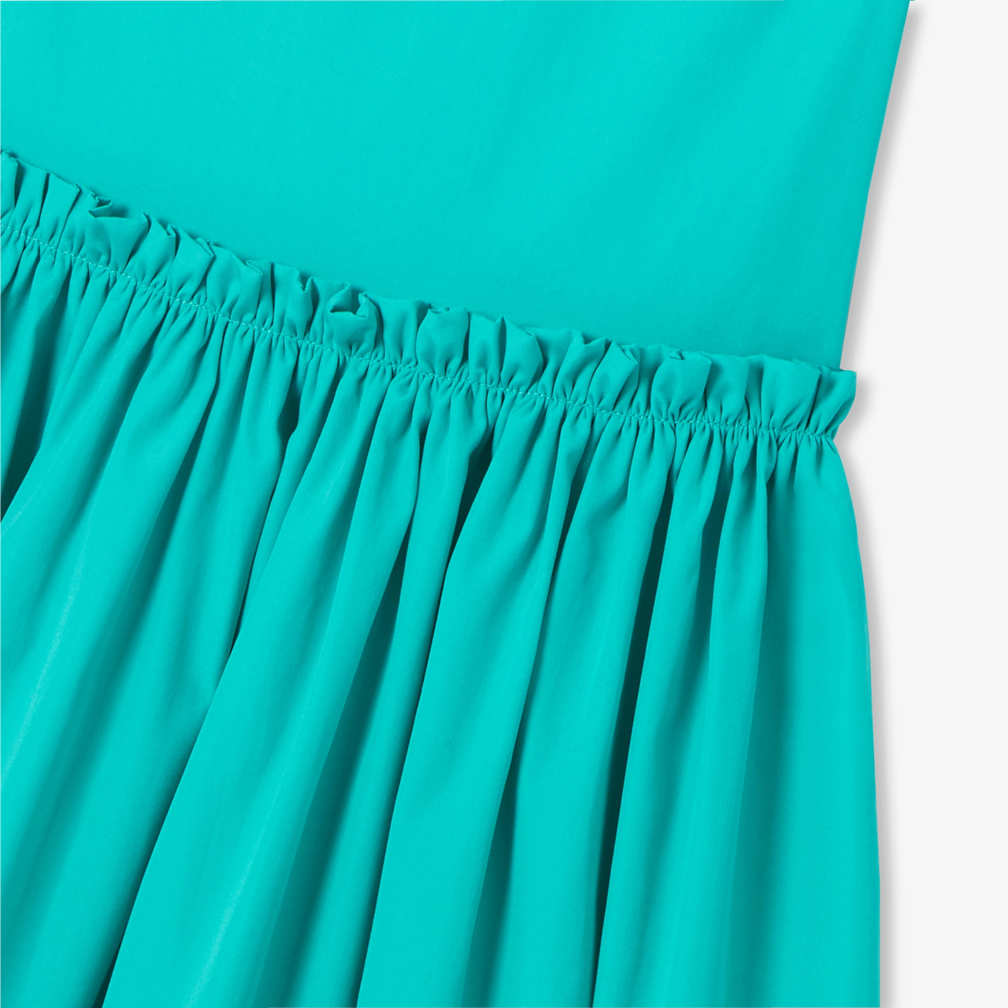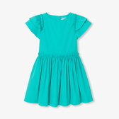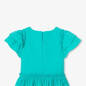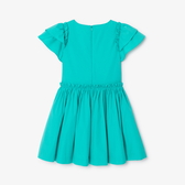 L'abito bambina di questa primavera è ricco di dettagli grafici. In popeline di cotone e colorato di un verde smeraldo profondo, maniche con volant e dettagli arricciati offrono un tocco di stile a questo capo romantico perfetto per la bella stagione.