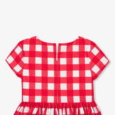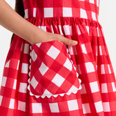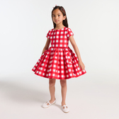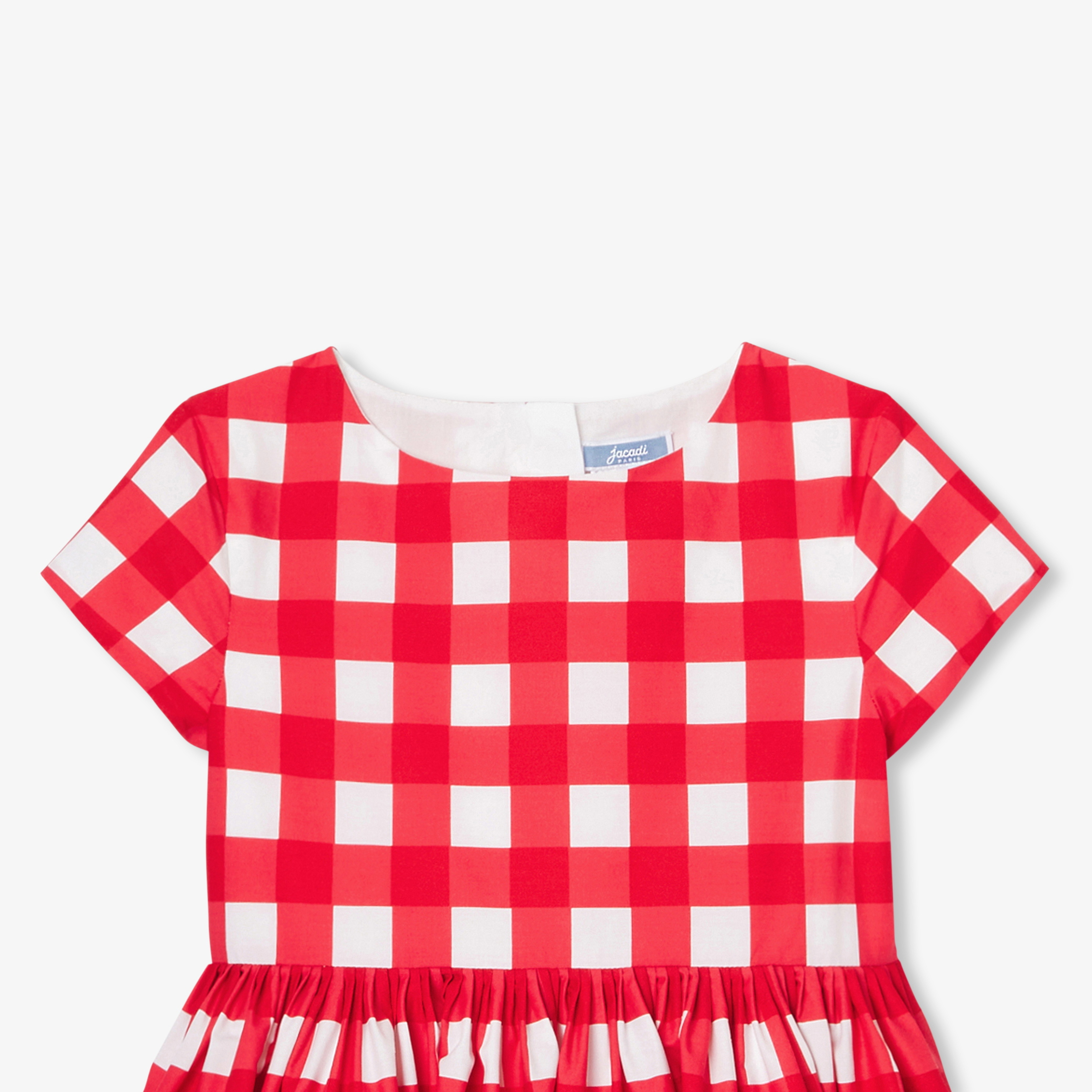 L'iconico motivo vichy è proposto in versione maxi in questo abito bambina per un look più moderno. In popeline di cotone, con maniche corte e arricciature in vita, è impreziosito da tasche applicate con una passamaneria a serpentina a contrasto. Foderato e facile da indossare, da abbinare a un paio di scarpe con cinturino a T per un tocco chic e francese al nuovo anno scolastico.
