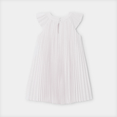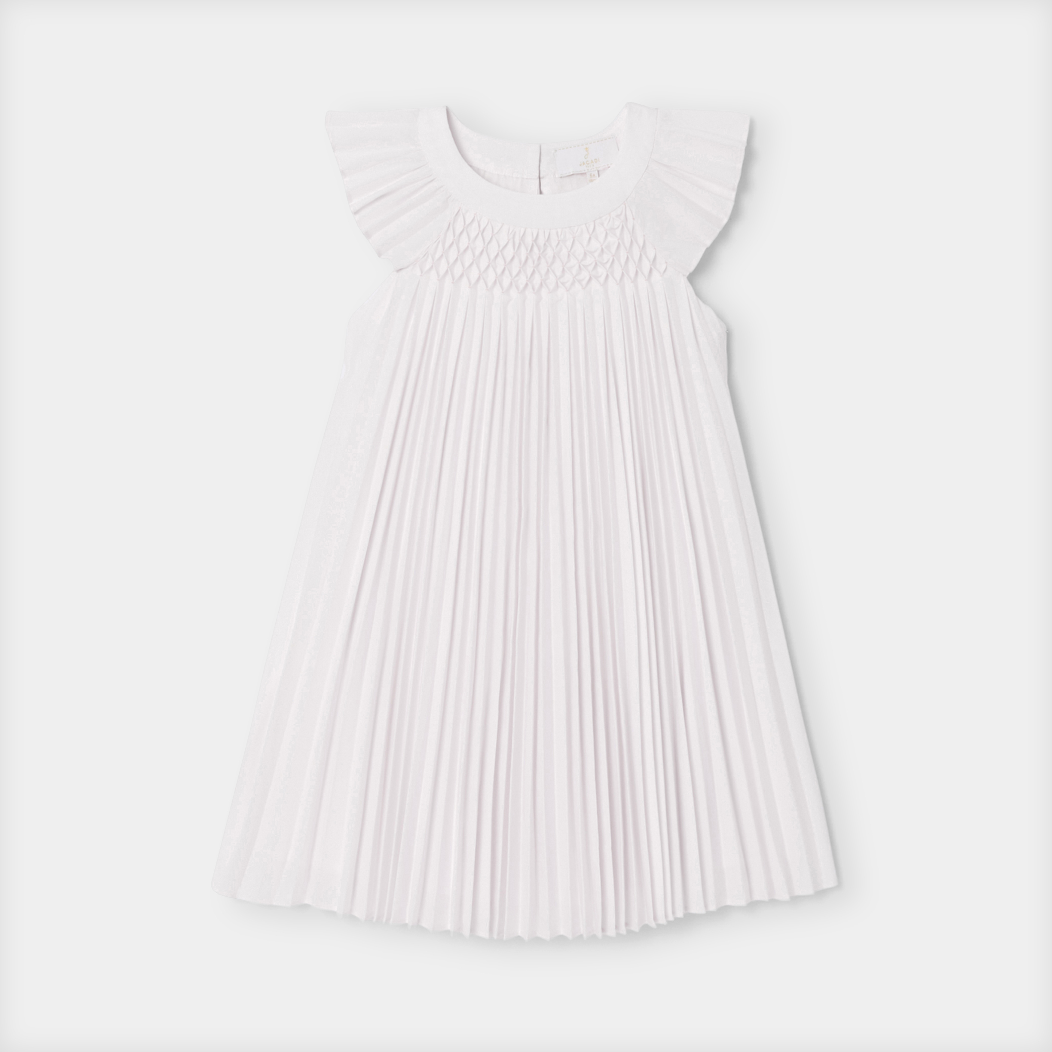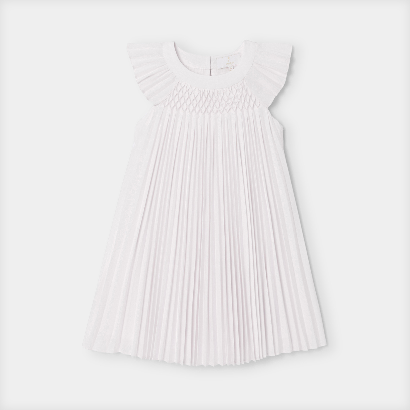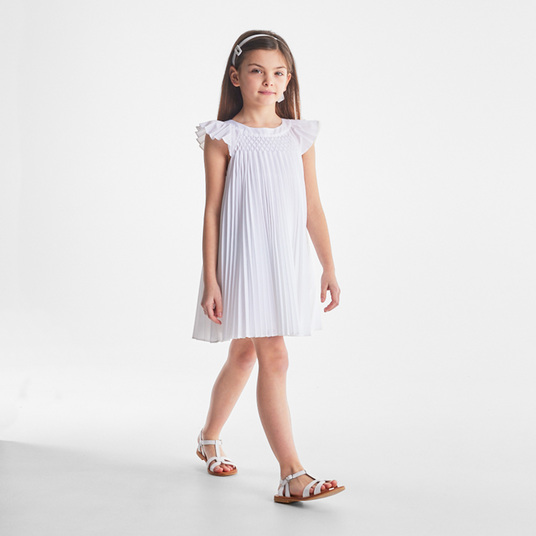 Elegante e ultra contemporaneo, l'abito bambina di questa stagione è in popeline di cotone e completamente foderato. Abbellito da pieghe permanenti ricamate sullo scollo e da maniche con volant, abbinalo a un bolero e a graziosi sandali per comporre un abito da cerimonia.