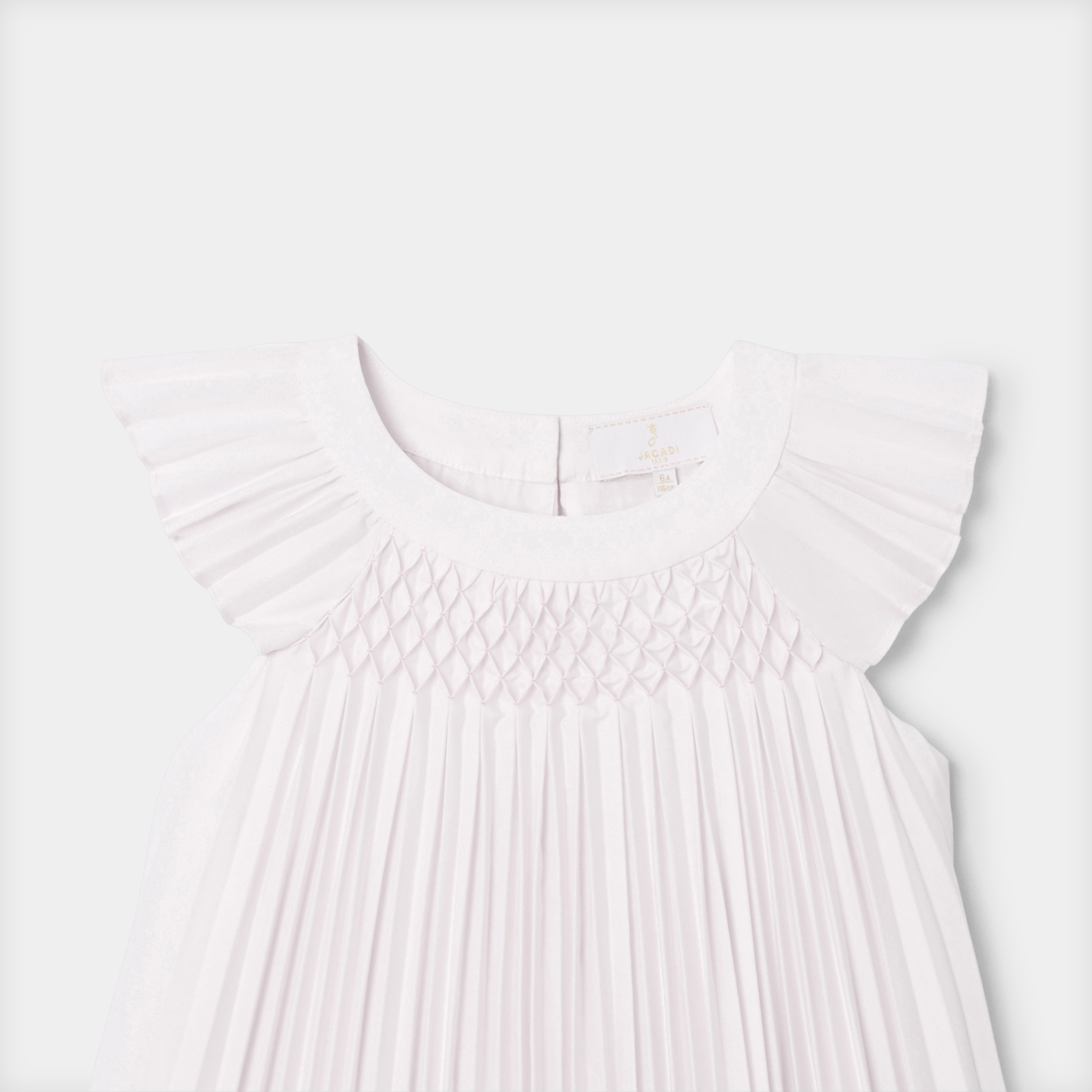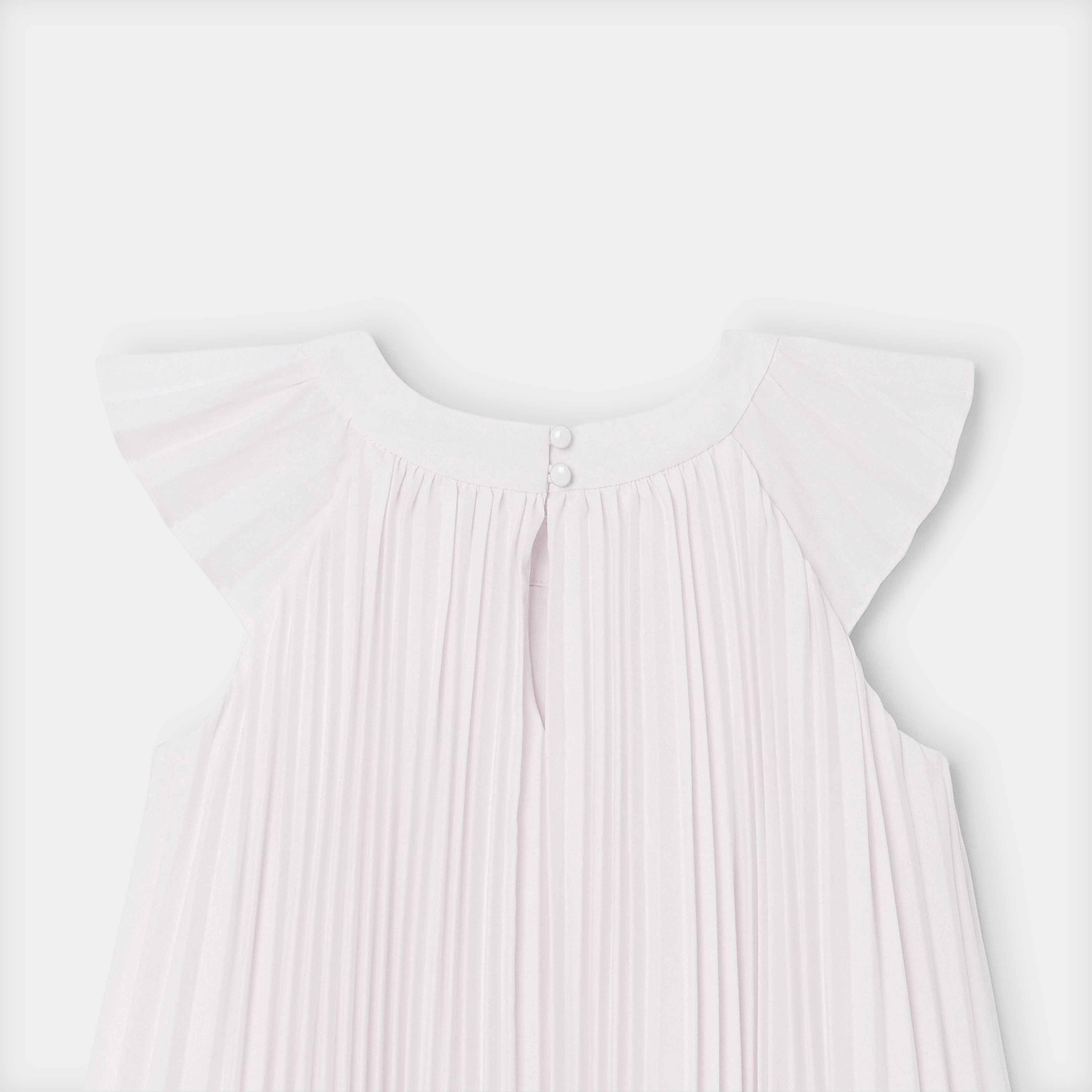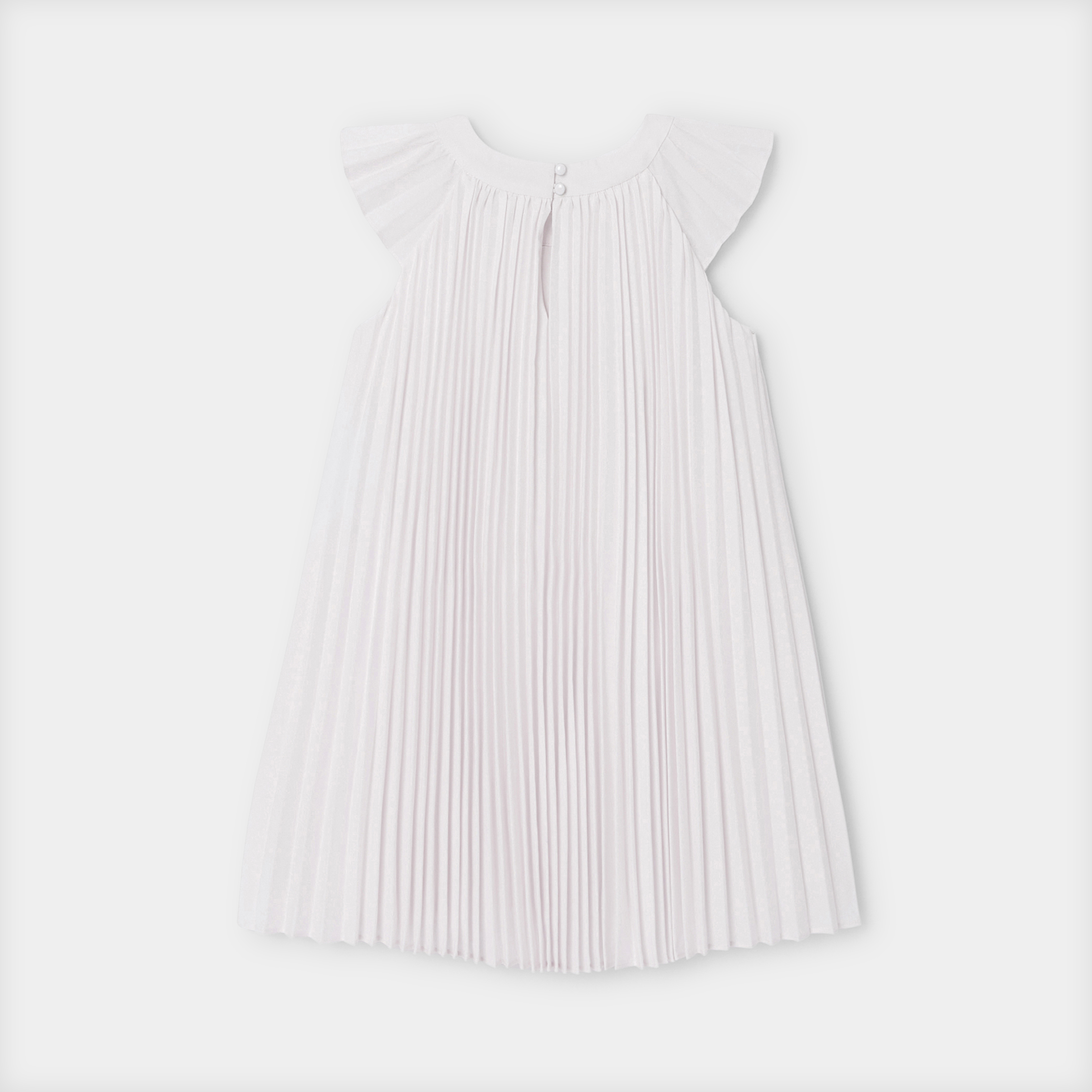 Elegante e ultra contemporaneo, l'abito bambina di questa stagione è in popeline di cotone e completamente foderato. Abbellito da pieghe permanenti ricamate sullo scollo e da maniche con volant, abbinalo a un bolero e a graziosi sandali per comporre un abito da cerimonia.