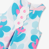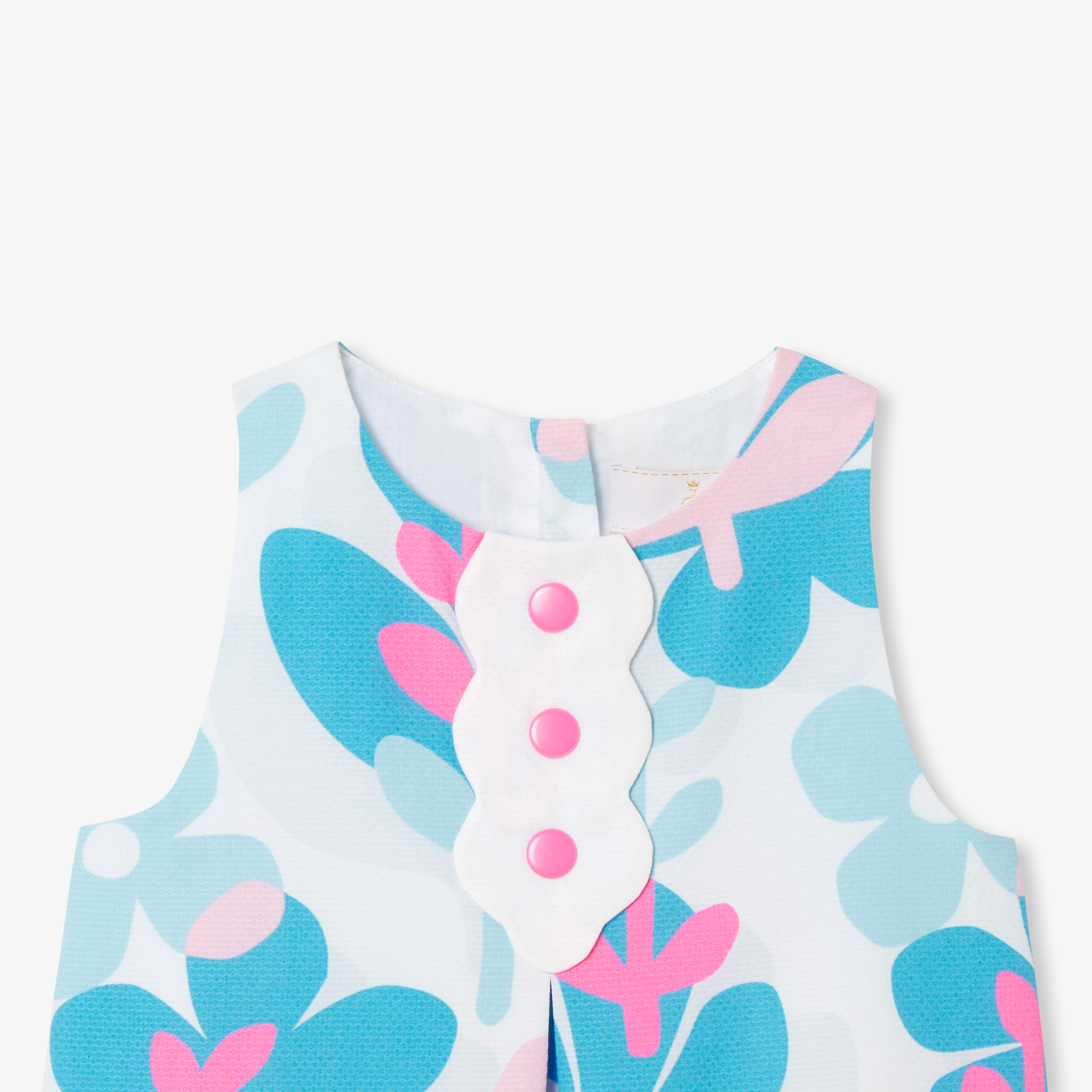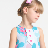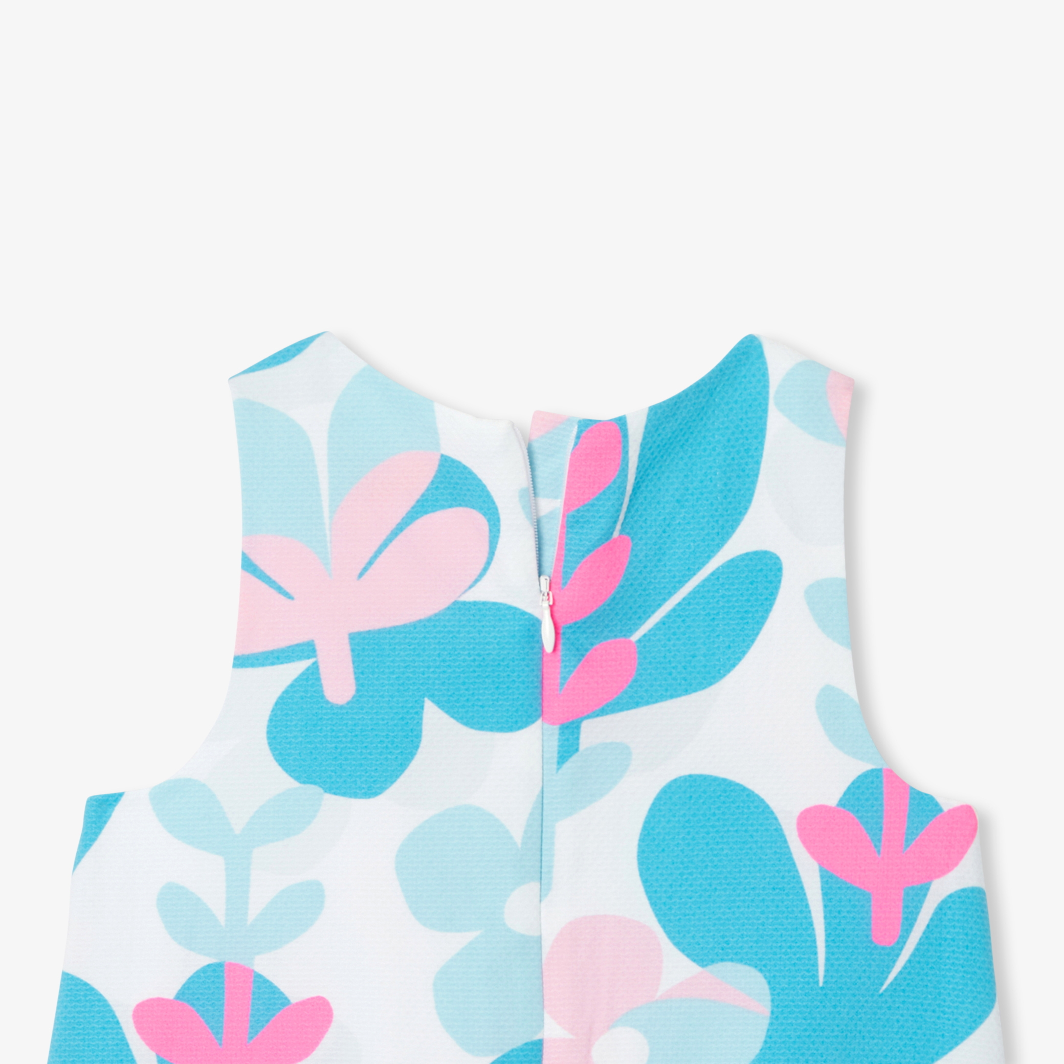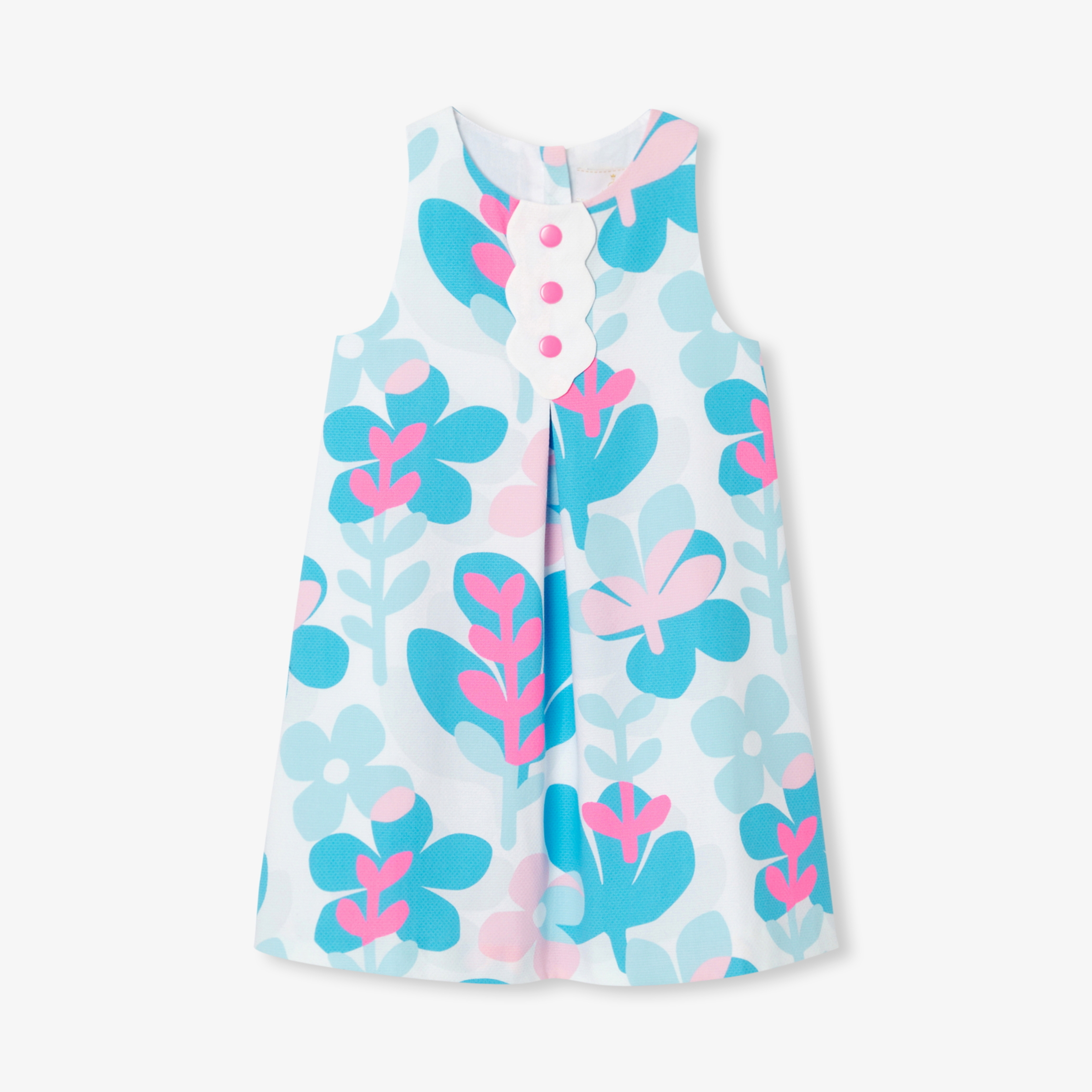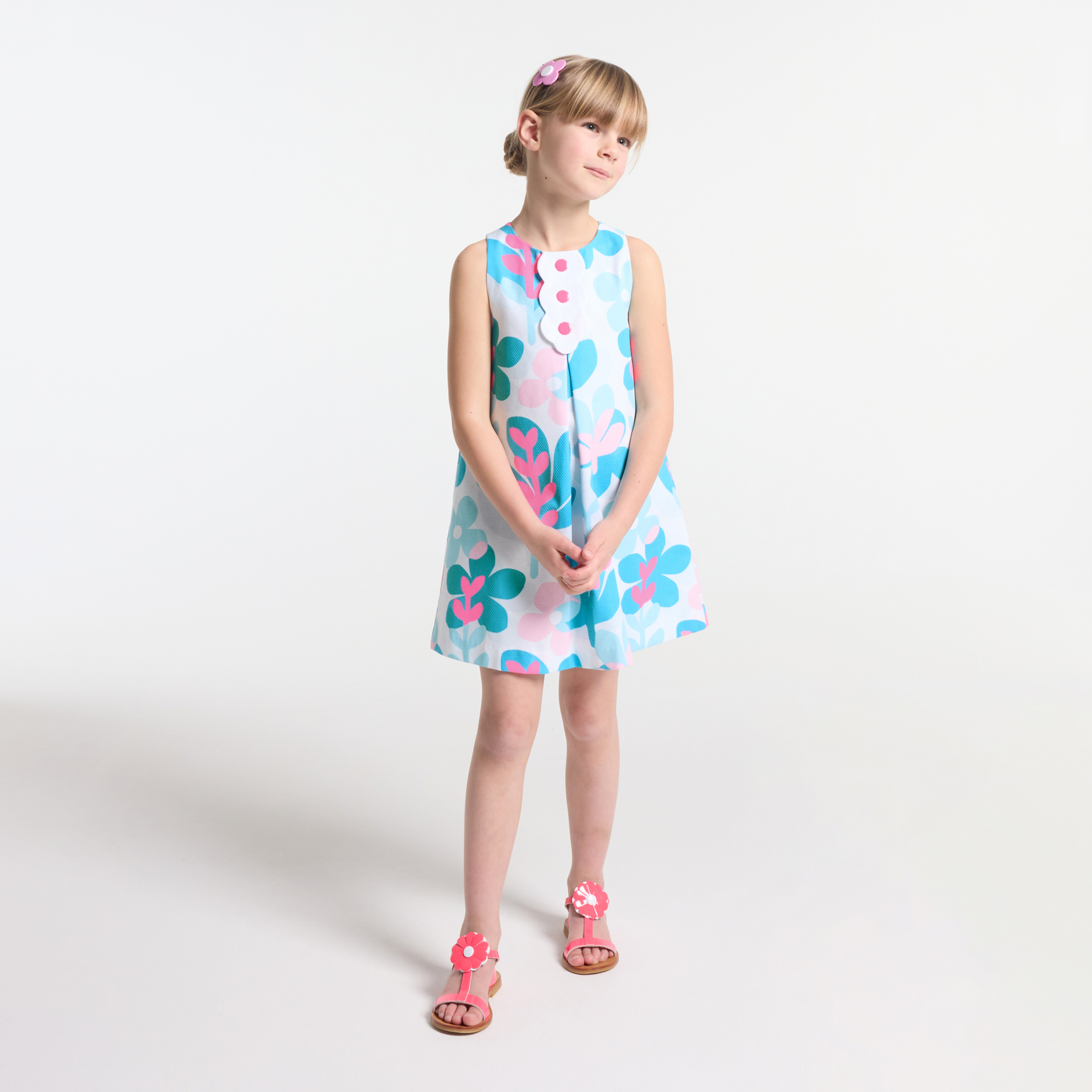 L'abito bambina di questa stagione si immerge nel cuore di un universo grafico e colorato. In cotone a nido d'ape e foderato, una patta fantasia smerlata sullo scollo, una piega sul davanti e un motivo vegetale oversize dinamizzano questo capo contemporaneo da abbinare a sandali o scarpe con cinturino a T e a un cappello per una cerimonia estiva.