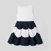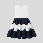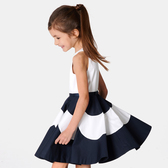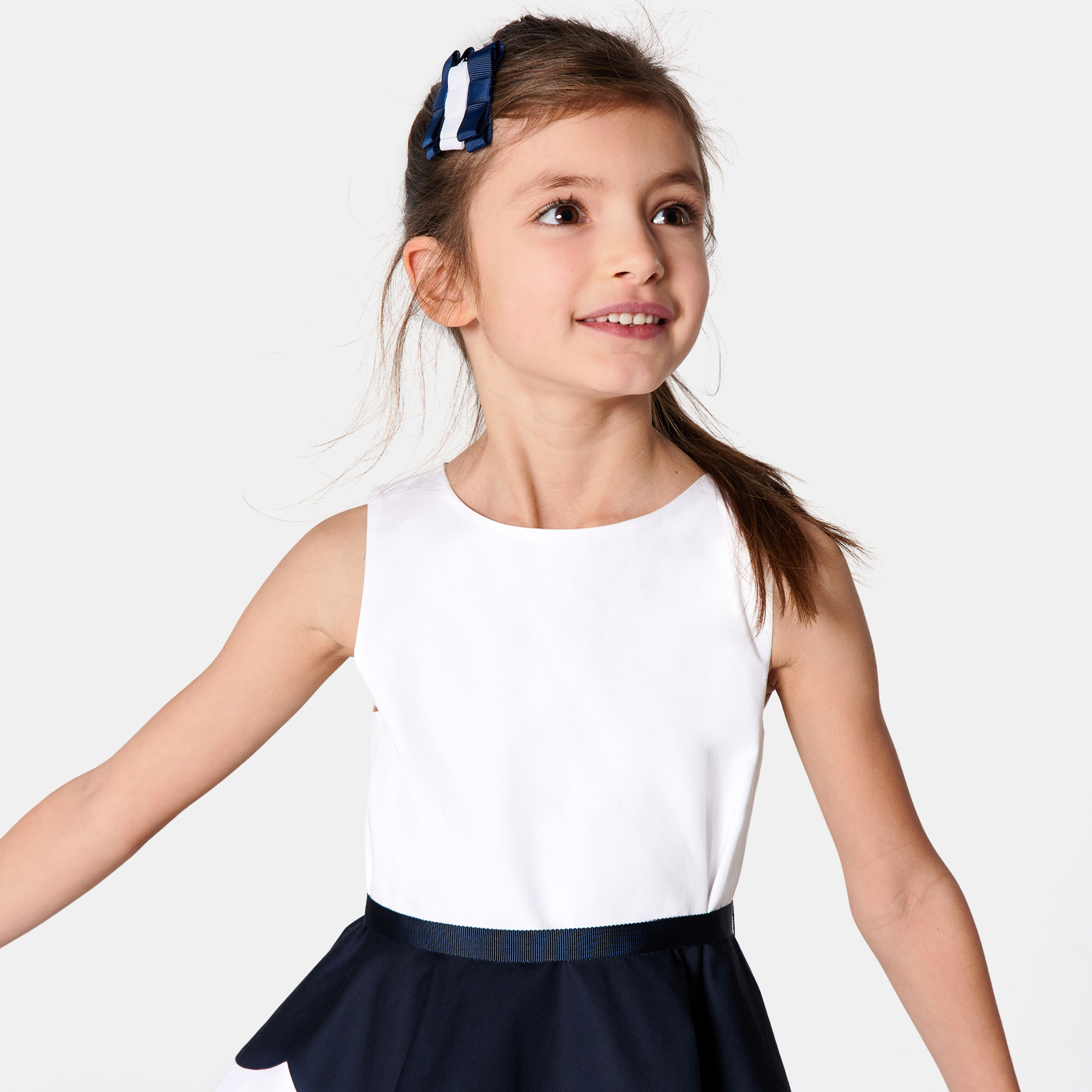 Con il suo look grafico e chic quest'incantevole abito bambina è ideale per una cerimonia. In raso di cotone biologico, inserti smerlati a contrasto sul fondo dinamizzano questo modello color block da abbinare a un cappello e a un paio di sandali per una grande occasione.