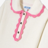 - Colletto tondo, patta con bottoni e cintura con punto conchiglia a contrasto