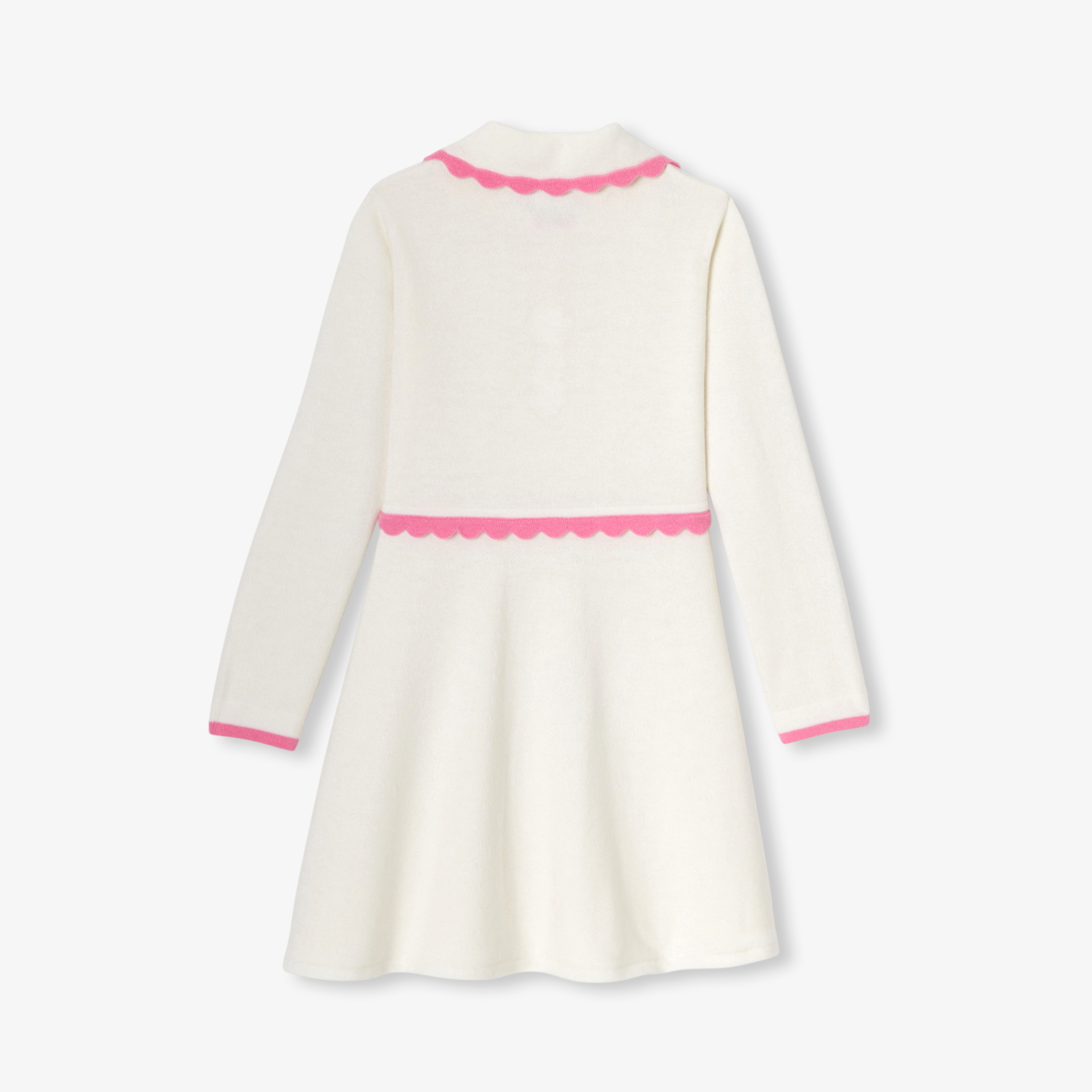 L'abito bambina di questa stagione unisce il fascino di un taglio rétro alla modernità di tocchi rosa pop.  In lana e cashmere responsabile, con colletto tondo, abbottonatura e cintura con punto a conchiglia a contrasto, questo capo autentico si abbina con un cappotto rosa e delle scarpe con cinturino a T per un look chic e parigino.