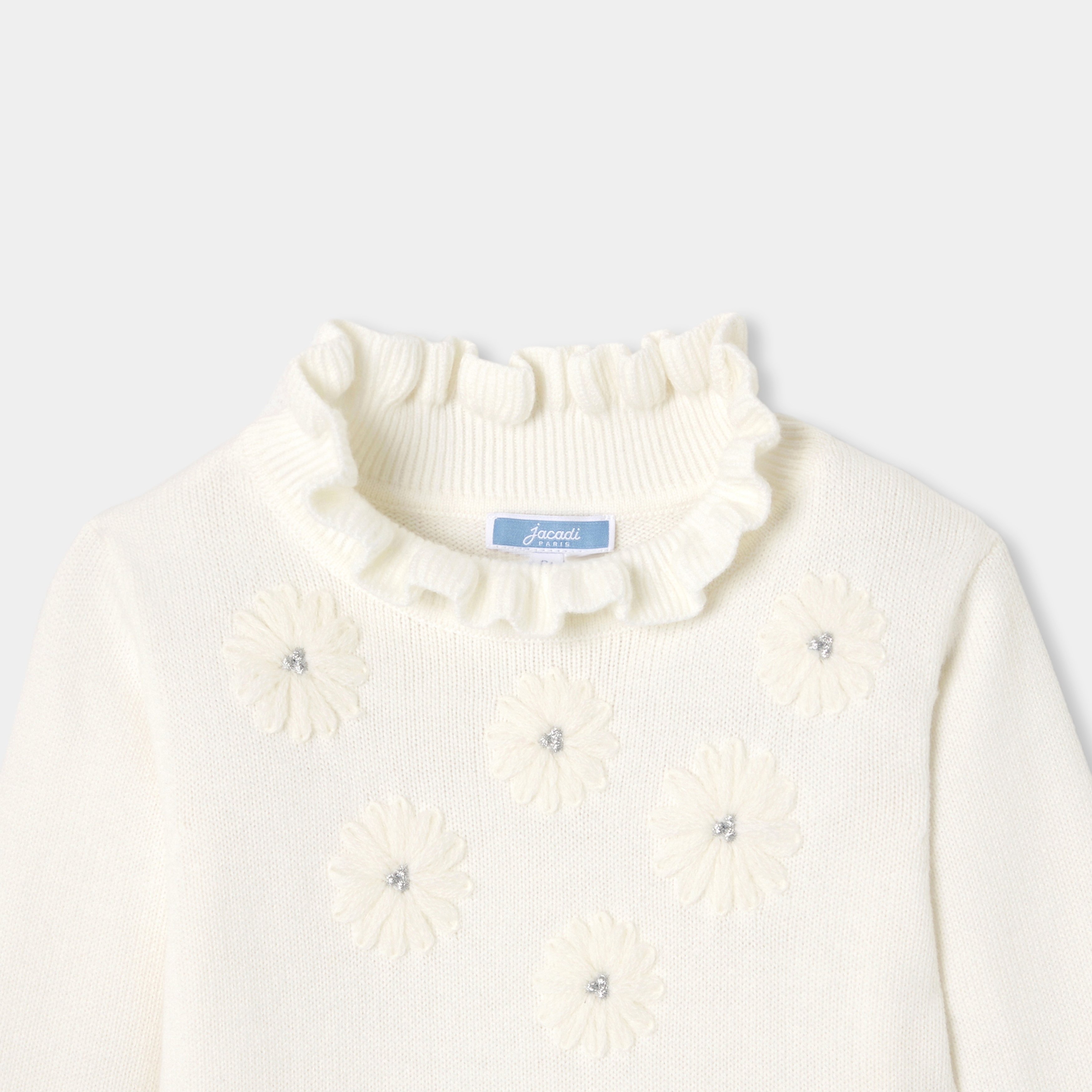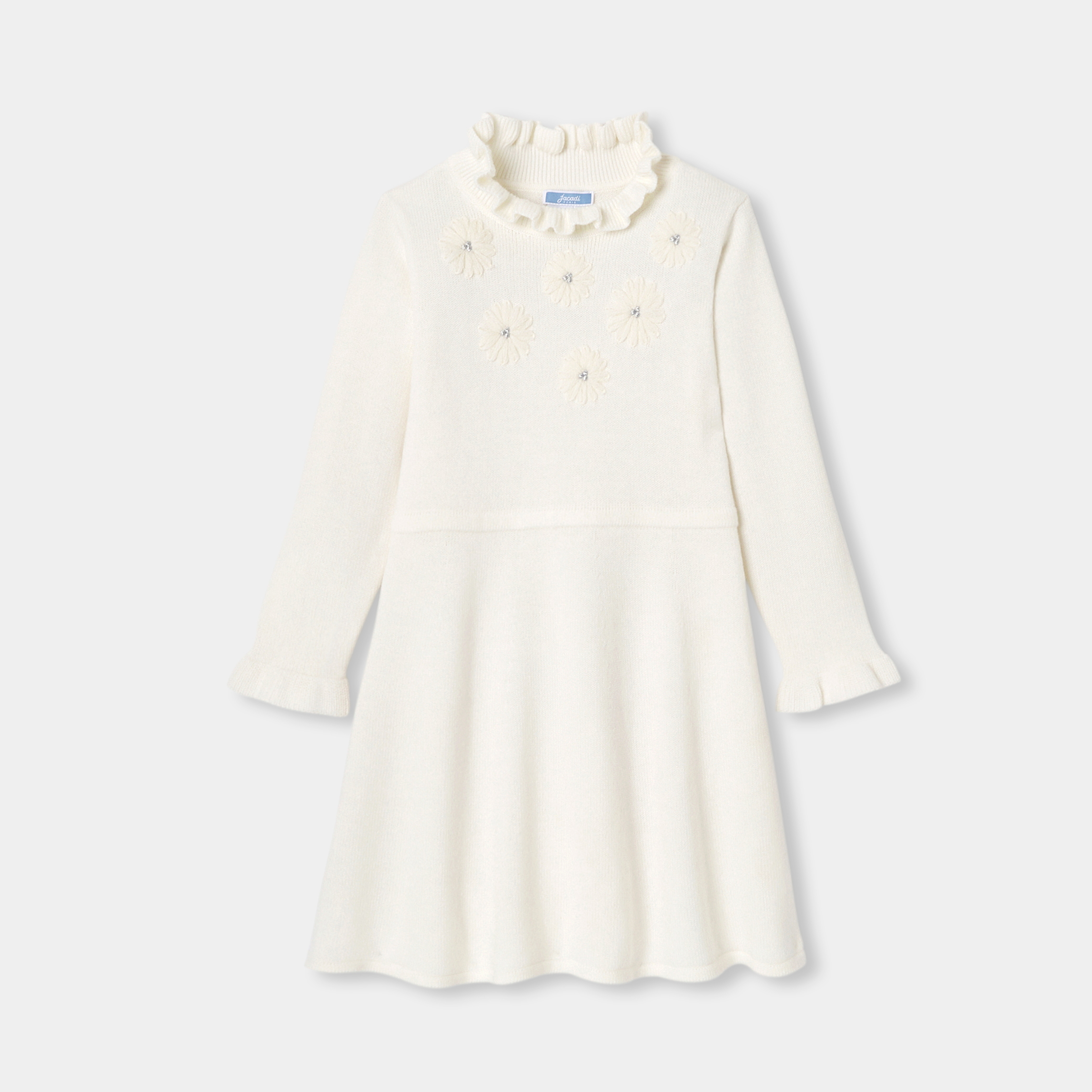 Questo delizioso abito bambina annuncia un inverno elegante e grafico. Realizzato in lana sostenibile e cashmere, questo capo accogliente è caratterizzato da un collo alto con volant, fiori ricamati intarsiati con dettagli argentati e una vita marcata. Da indossare con collant e un piumino reversibile per tutti i giorni, o con graziose scarpe con cinturino a T per un look ideale per le feste.