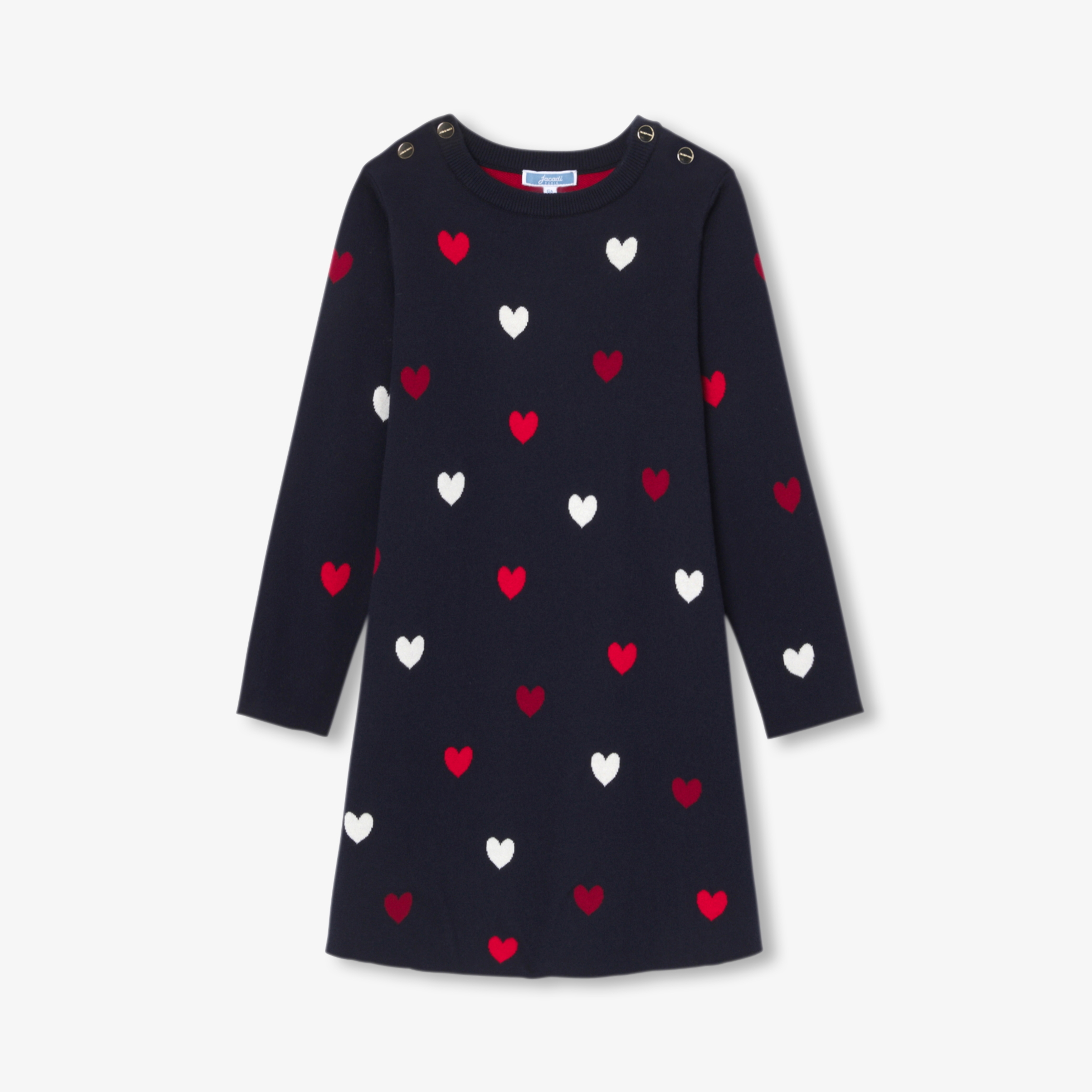 Tanto chic quanto contemporaneo, questo abito bambina è pensato per essere indossato tutti i giorni ed è realizzato in una maglia di jersey morbida e confortevole. Valorizzato da un cuore in jacquard e facile da infilare grazie ai bottoni automatici sulle spalle, le bambine ameranno indossarlo per il rientro a scuola con collant e un paio di Mary Jane o stivaletti.