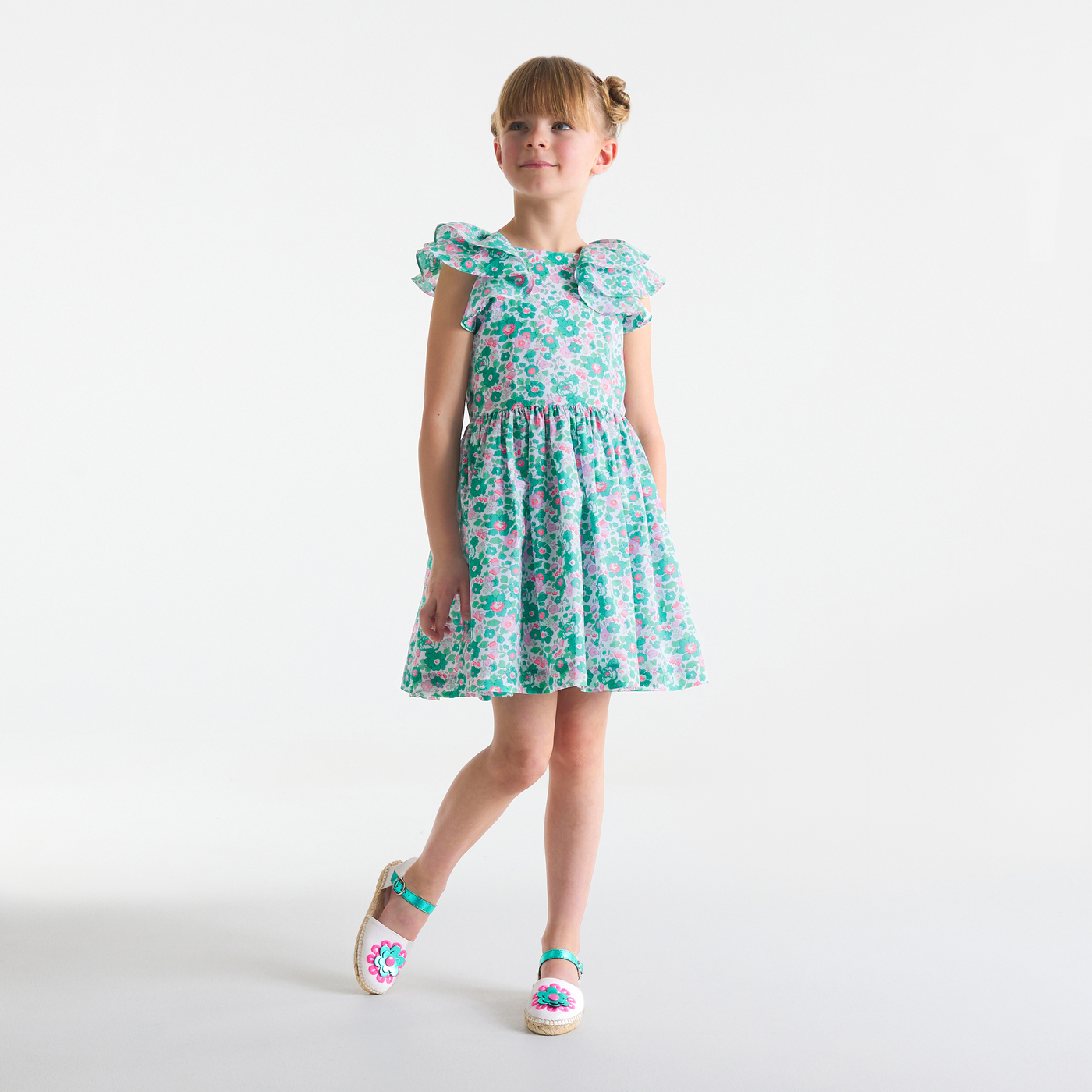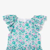 Impreziosito da maniche con volant, quest'abito bambina dall'eleganza romantica ci trasporta in un magico universo floreale. In tessuto Liberty morbido e leggero, arricciato in vita e foderato, si abbinerà a meraviglia a mollette coordinate e a graziosi sandali per l'estate.