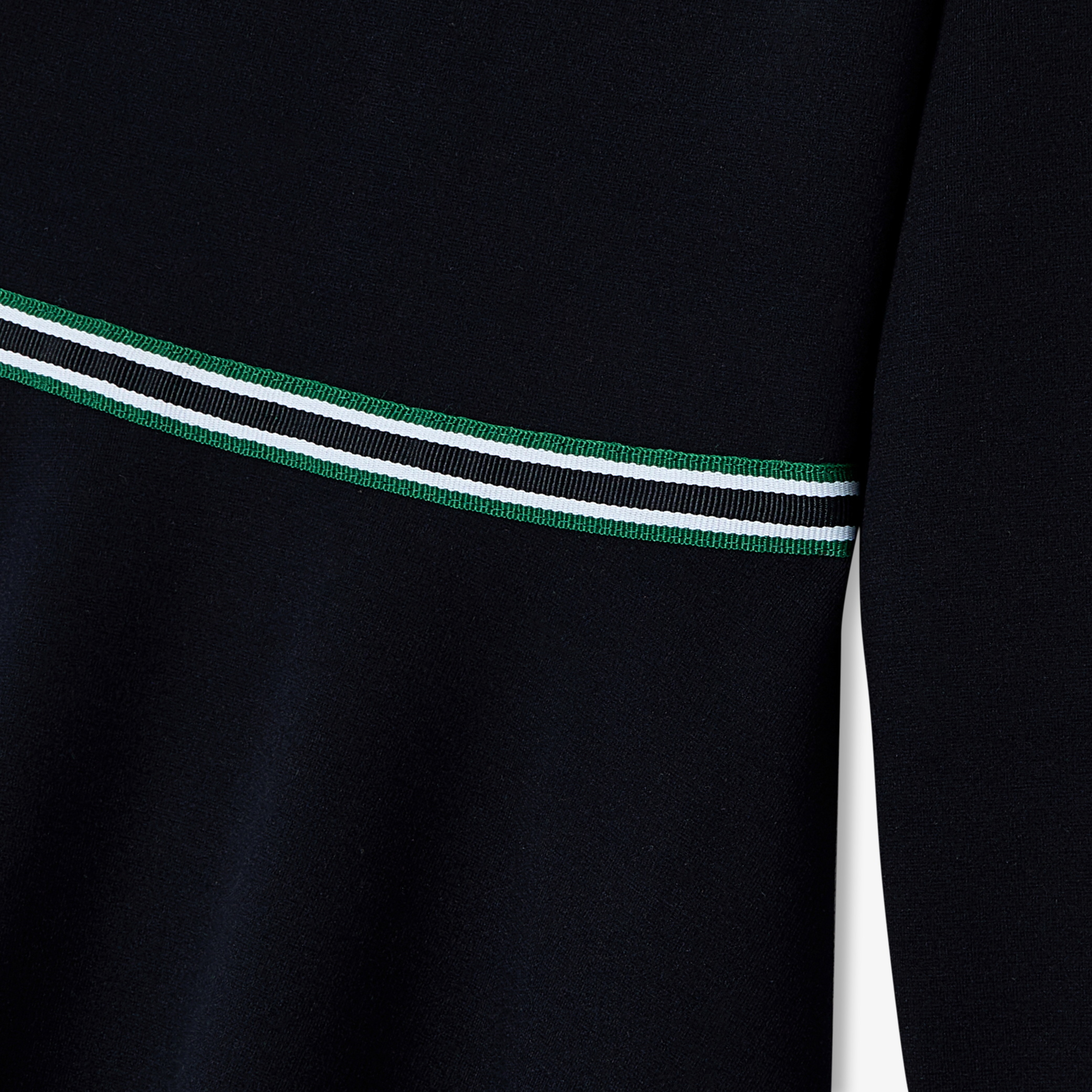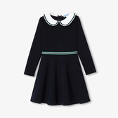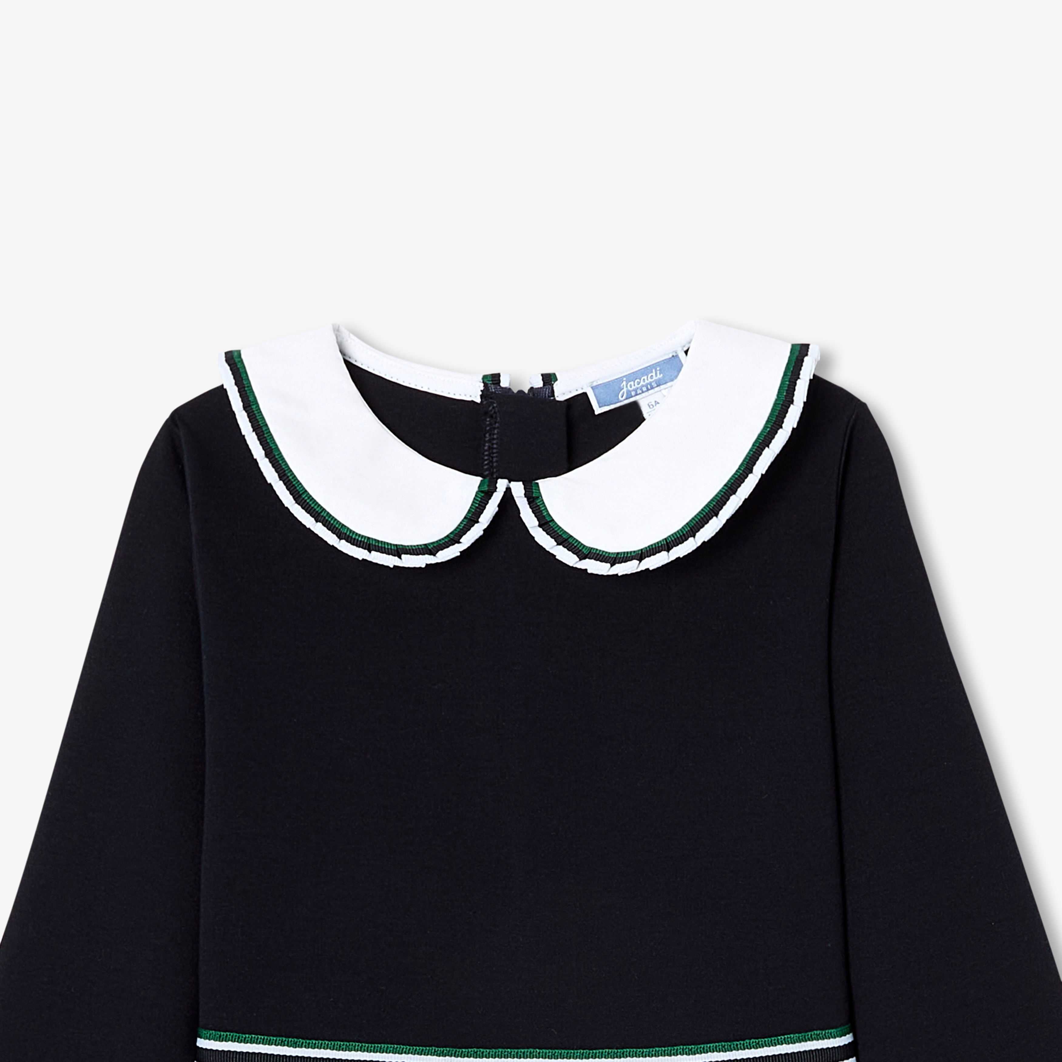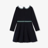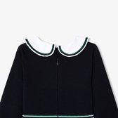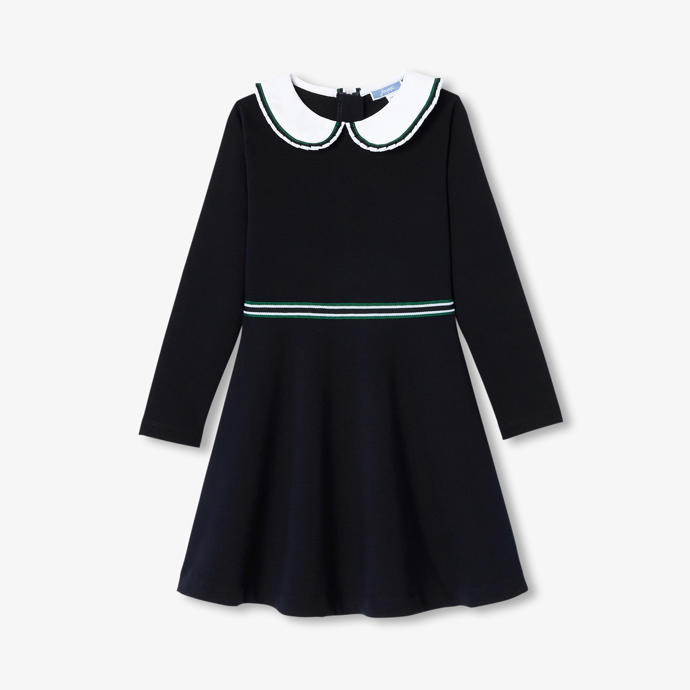 Dettagli curati e taglio preppy-chic per questo elegante abito bambina. In tessuto punto Milano, è impreziosito da un colletto tondo con ruches e arricchito da una cintura integrata in gros-grain a righe. Indossato con un trench coat per il ritorno a scuola, questo capo non può mancare nel suo guardaroba.