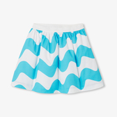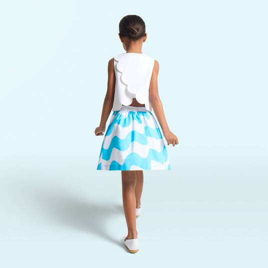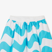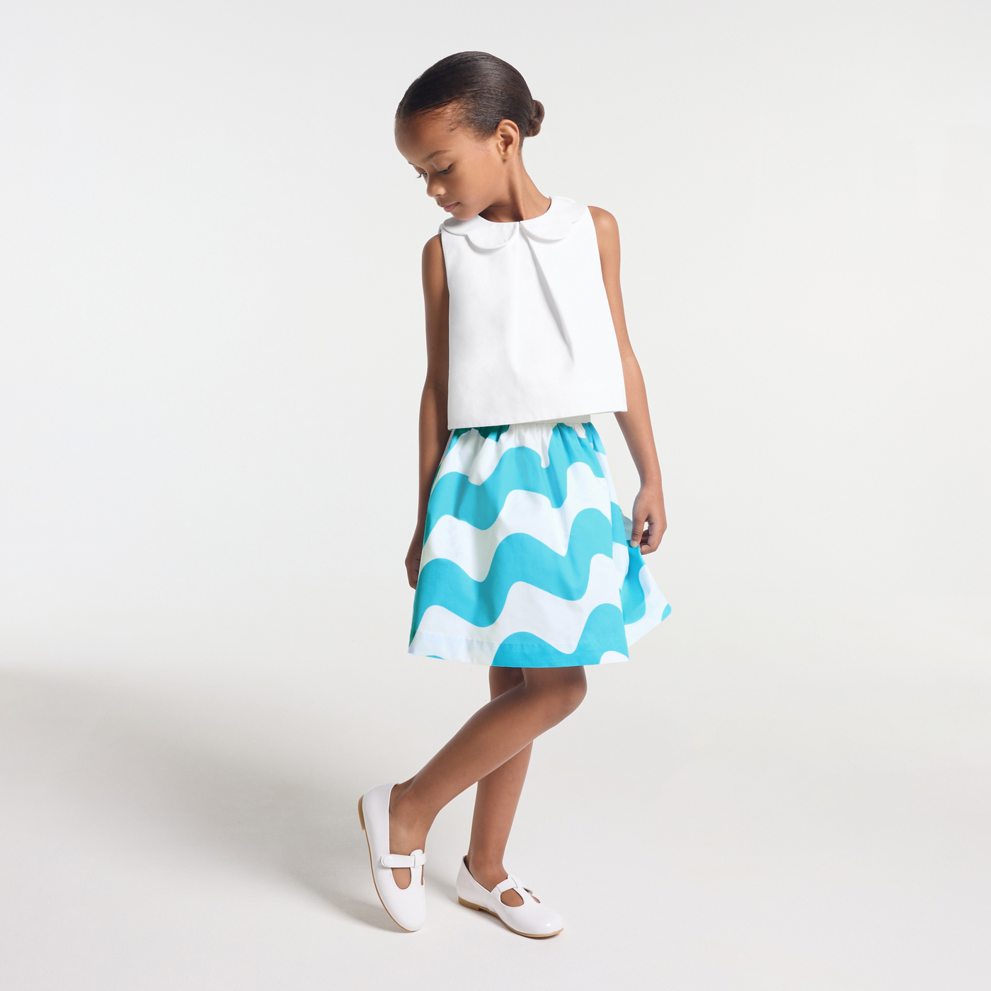 Elegante e contemporanea, la gonna bambina di questa stagione è realizzata in uno splendido raso di cotone. Dinamizzato da un ipnotico motivo di onda, arricciato in vita e foderata, questo elegantissimo capo, da abbinare a un top con schiena scoperta e a graziosi sandali, potrà essere indossato in piena estate per una cerimonia.
