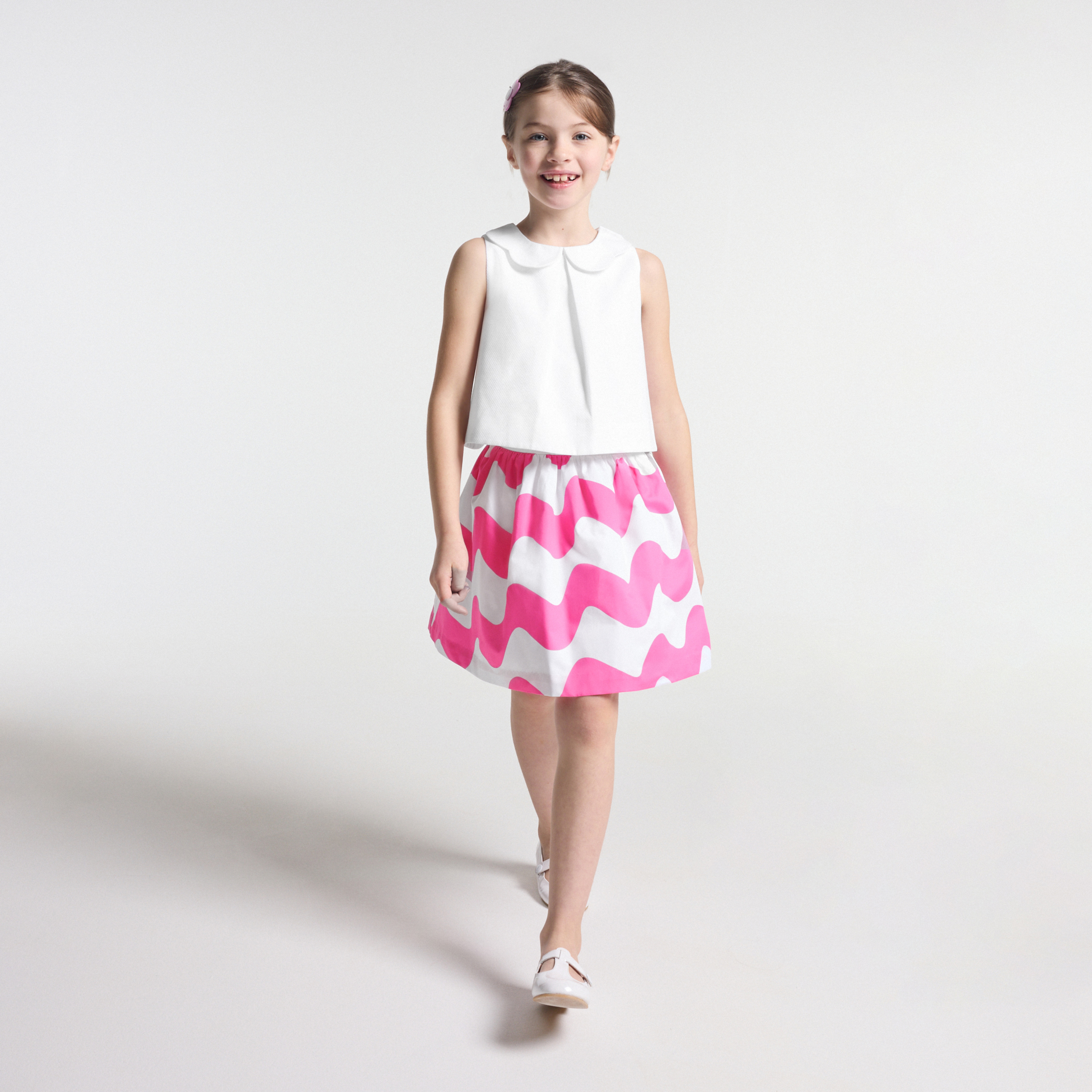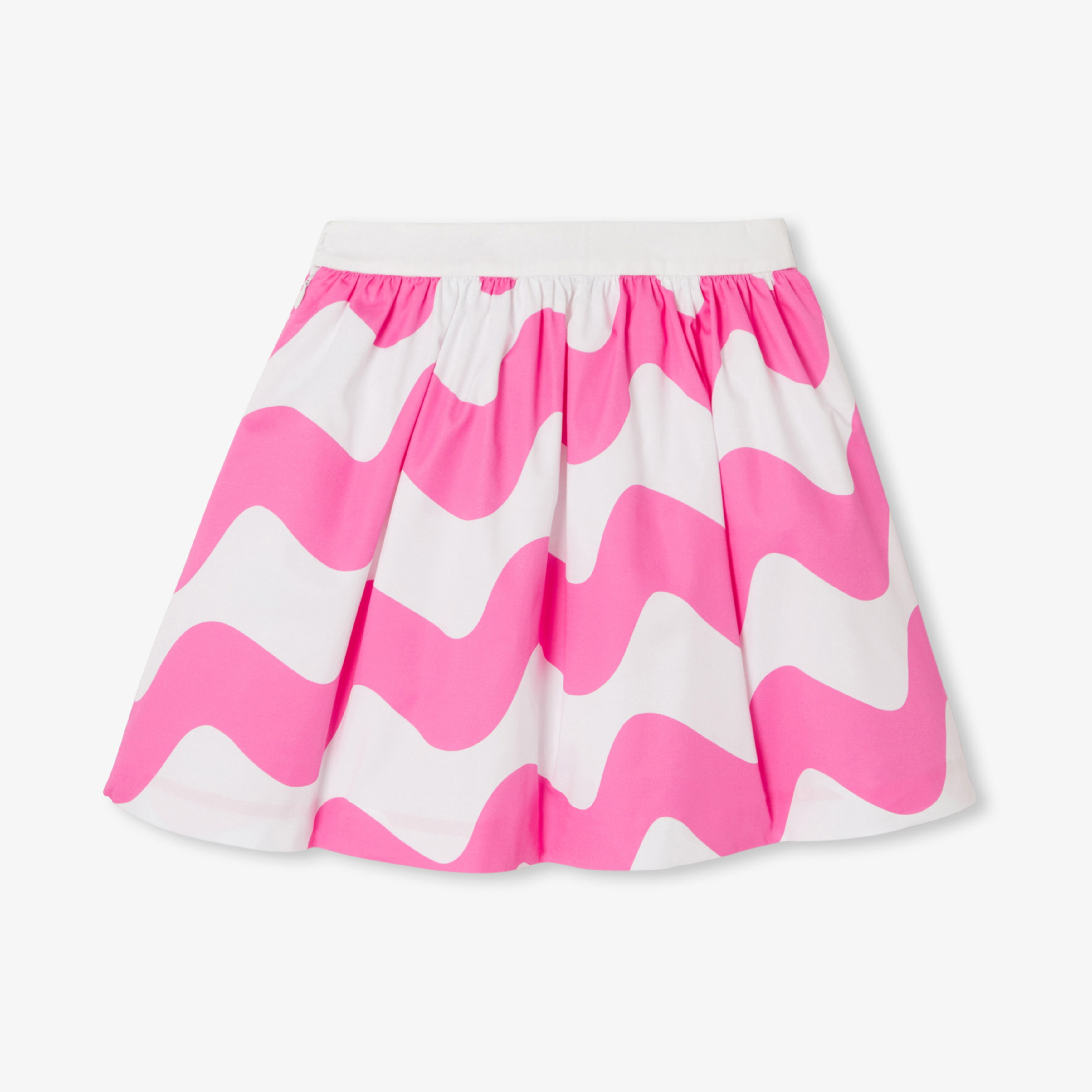 Elegante e contemporanea, la gonna bambina di questa stagione è realizzata in uno splendido raso di cotone. Dinamizzato da un ipnotico motivo di onda, arricciato in vita e foderata, questo elegantissimo capo, da abbinare a un top con schiena scoperta e a graziosi sandali, potrà essere indossato in piena estate per una cerimonia.
