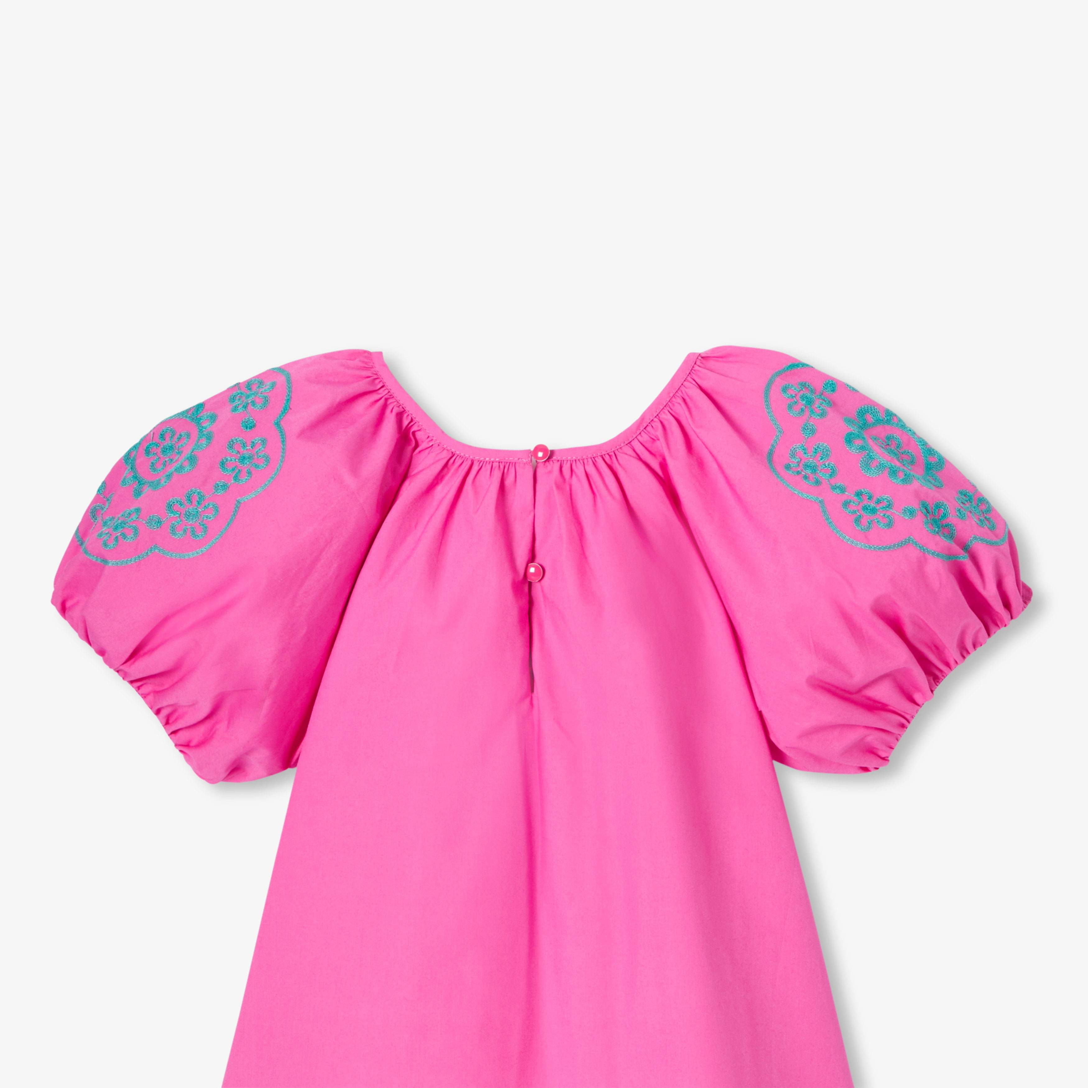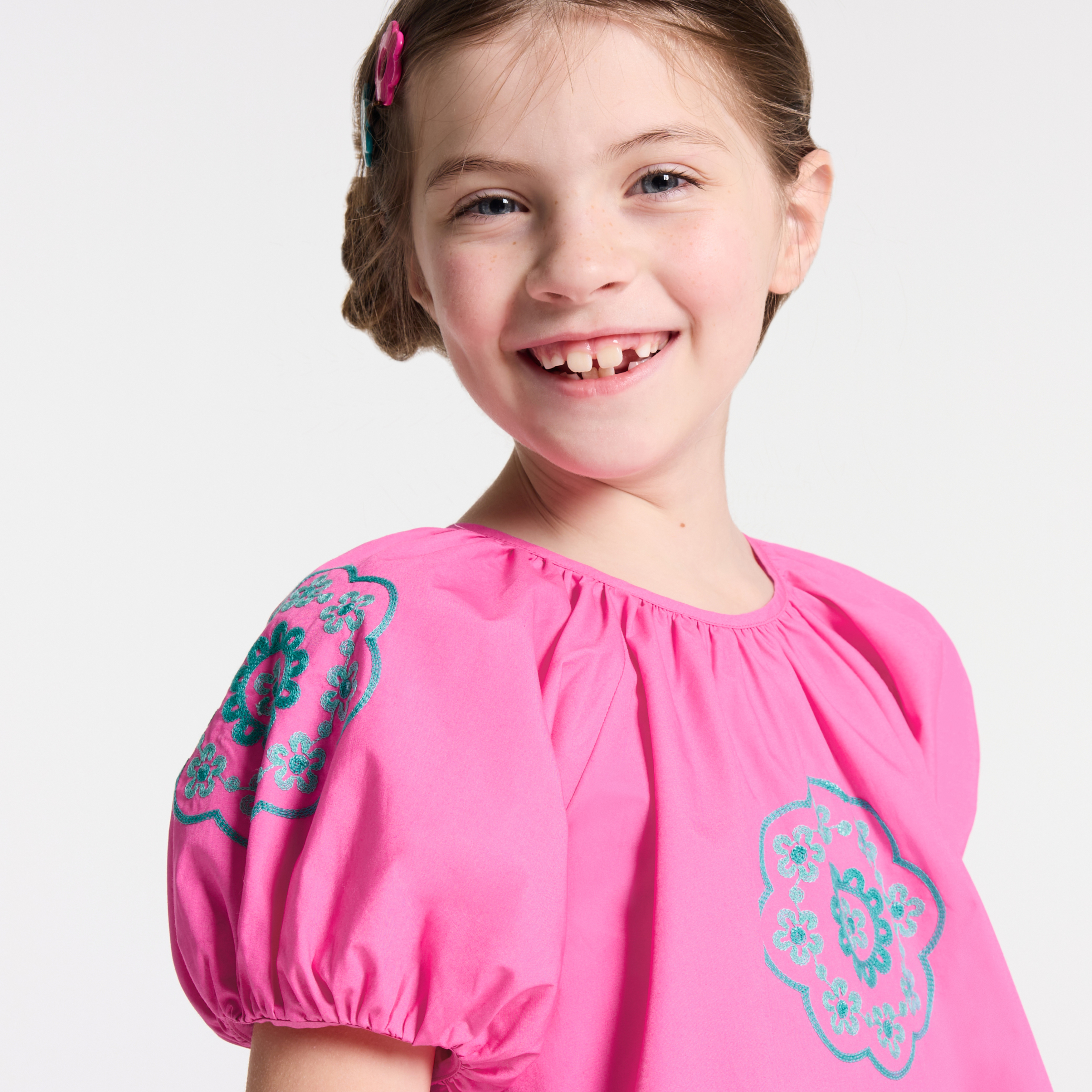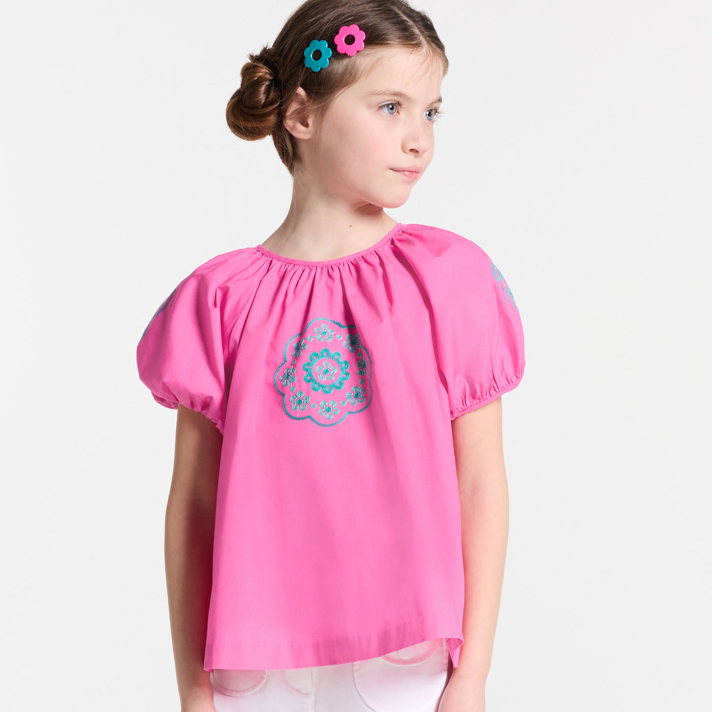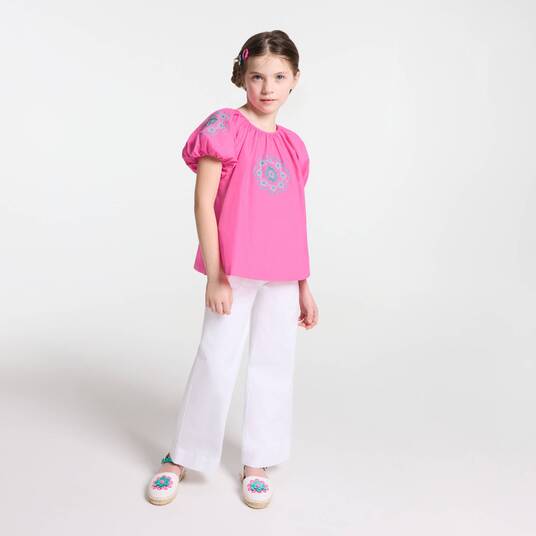 Arriva la primavera accompagnata da quest'irresistibile blusa in popeline. Maniche a palloncino e rosoni ricamati oversize per un look irresistibile, questo capo dal fascino folk potrà essere indossato con pantaloni ampi bianchi o graziosi jeans e scarpe con cinturino a T rosa per un look romantico e contemporaneo.