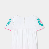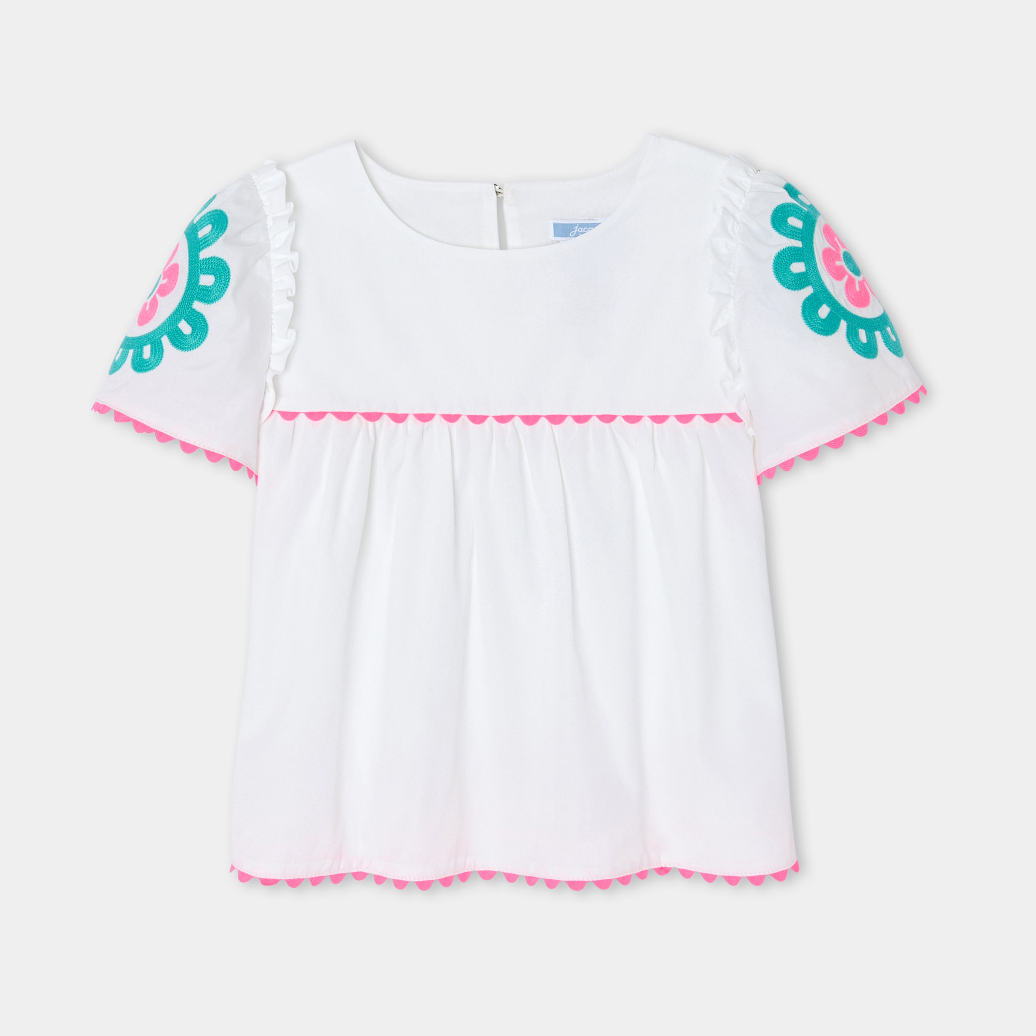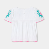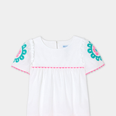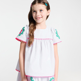 Capo immancabile nel guardaroba primaverile, l'intramontabile blusa bianca trasporterà i look delle bambine in un universo folk e colorato. Arricchita da volant sulle spalle, da rosoni ricamati e da nastri a serpentina fucsia, le bambine la apprezzeranno per tutti questi dettagli moda.