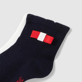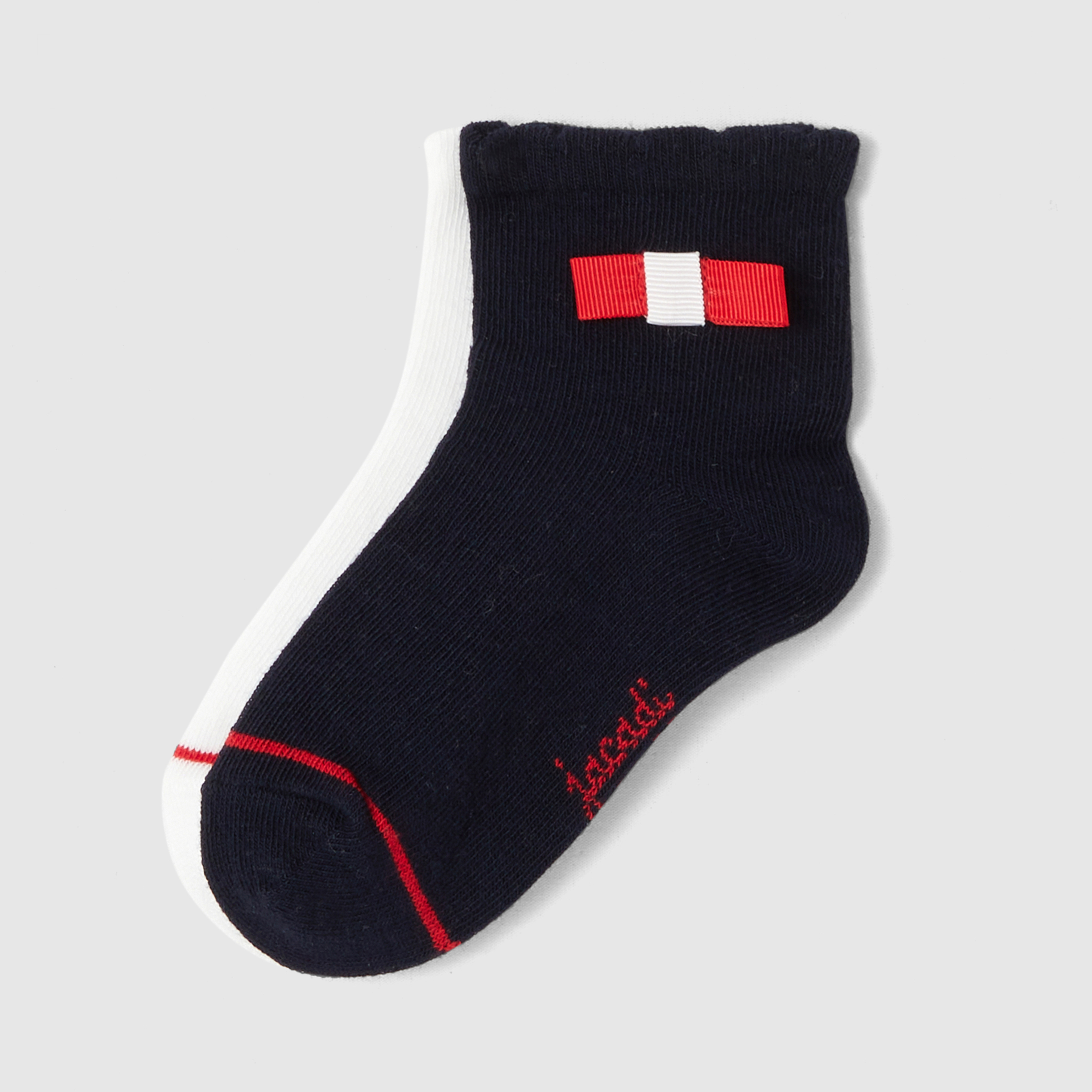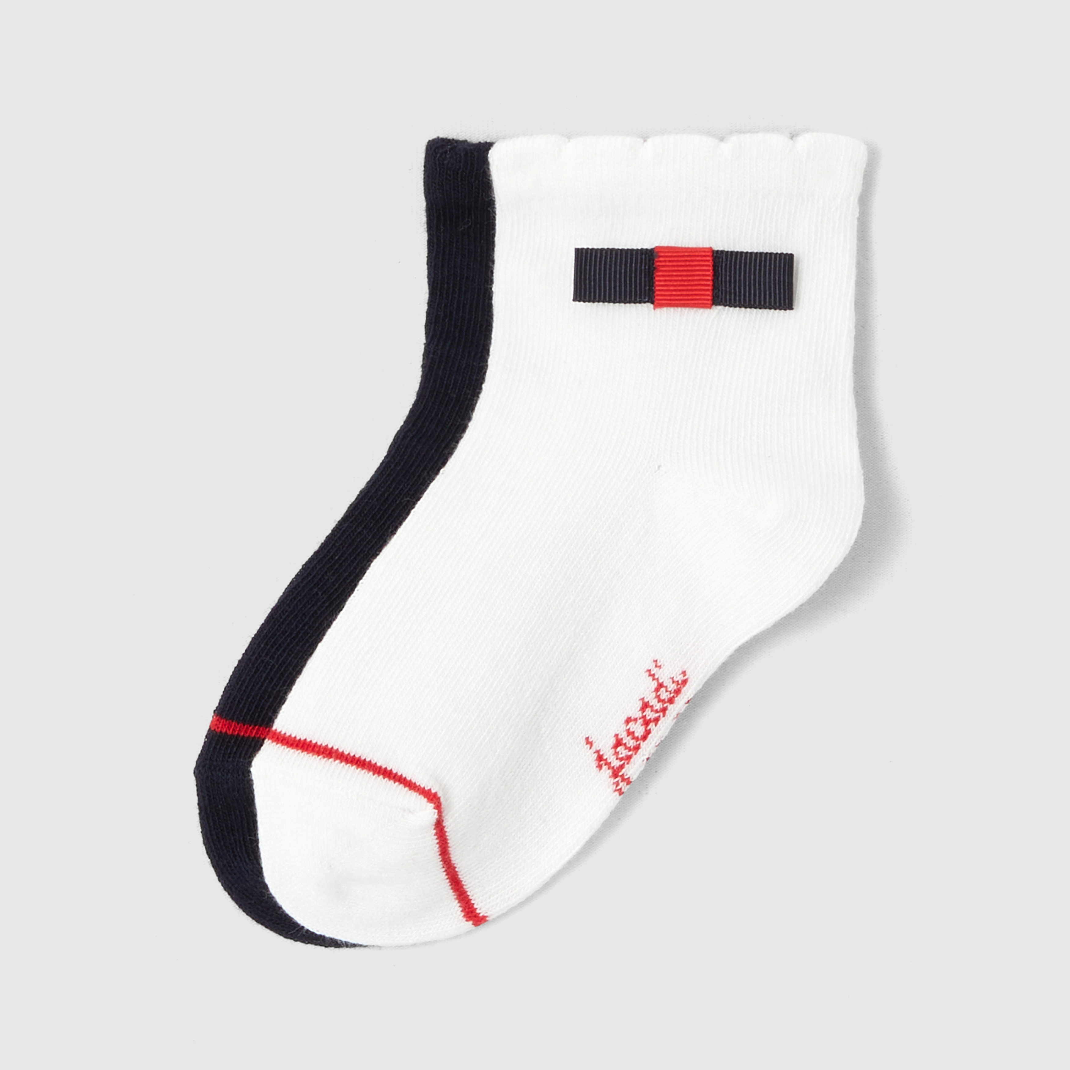 Fiocchi applicati in gros-grain, smerli e bordini a contrasto dinamizzano questi calzini bambina da indossare per il ritorno a scuola. Facili da infilare, le bambine potranno abbinarli ai capi della stessa collezione.
