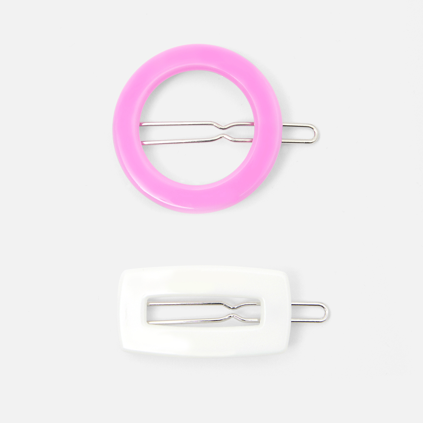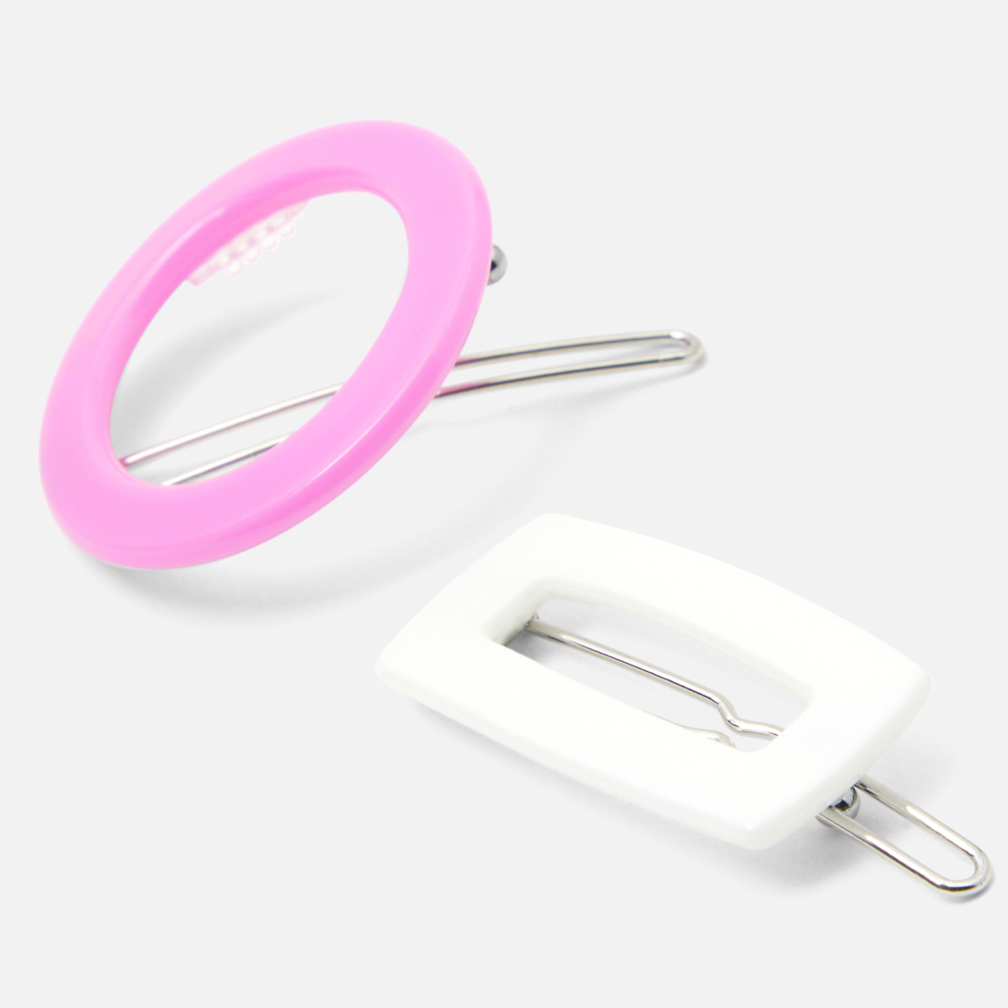 Un rettangolo bianco e un cerchio rosa, da indossare da sole o insieme, le mollette bambina di questa stagione sono elegantissime. Facili da attaccare, abbelliranno ogni giorno le acconciature delle bambine.