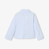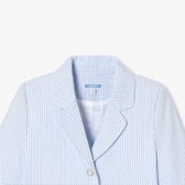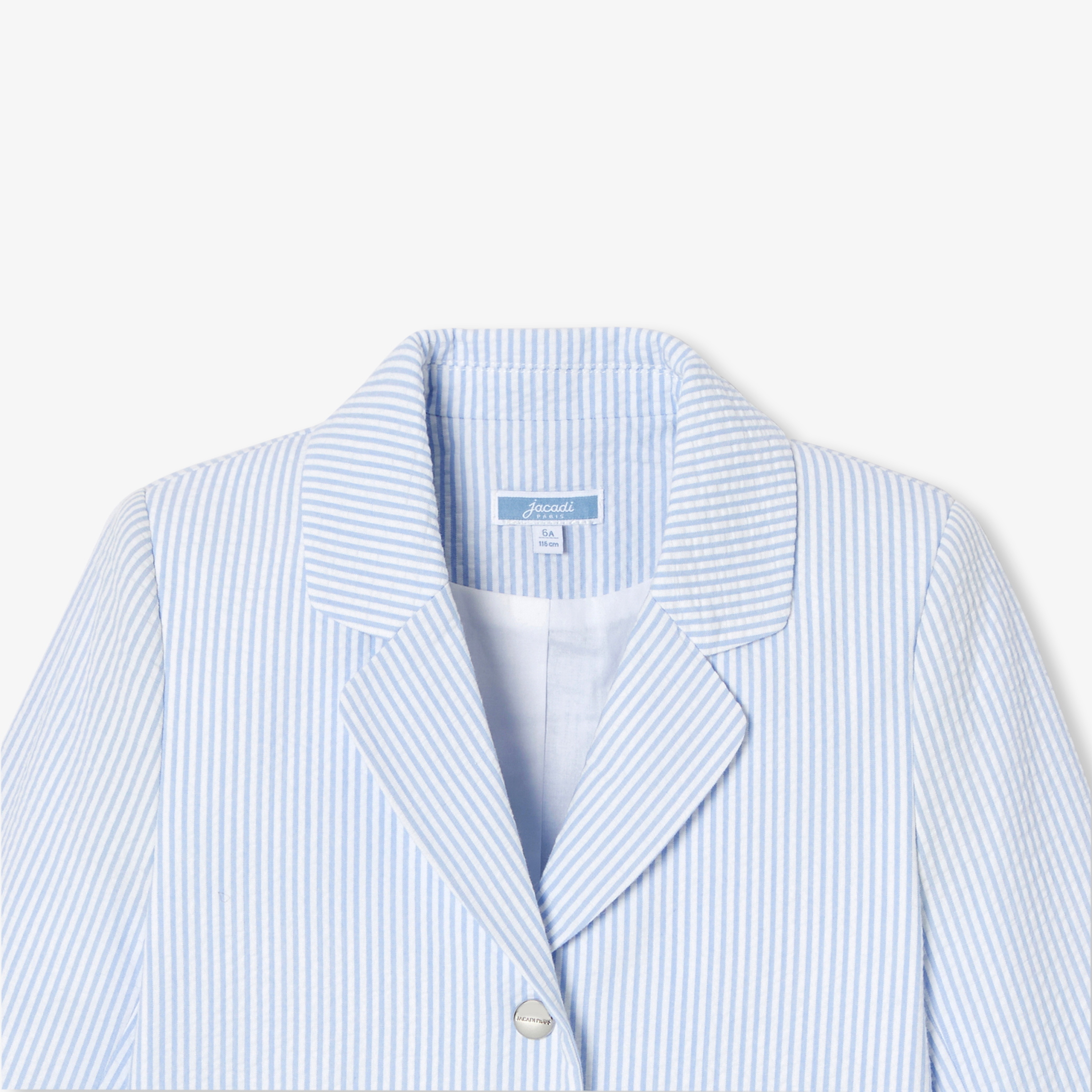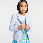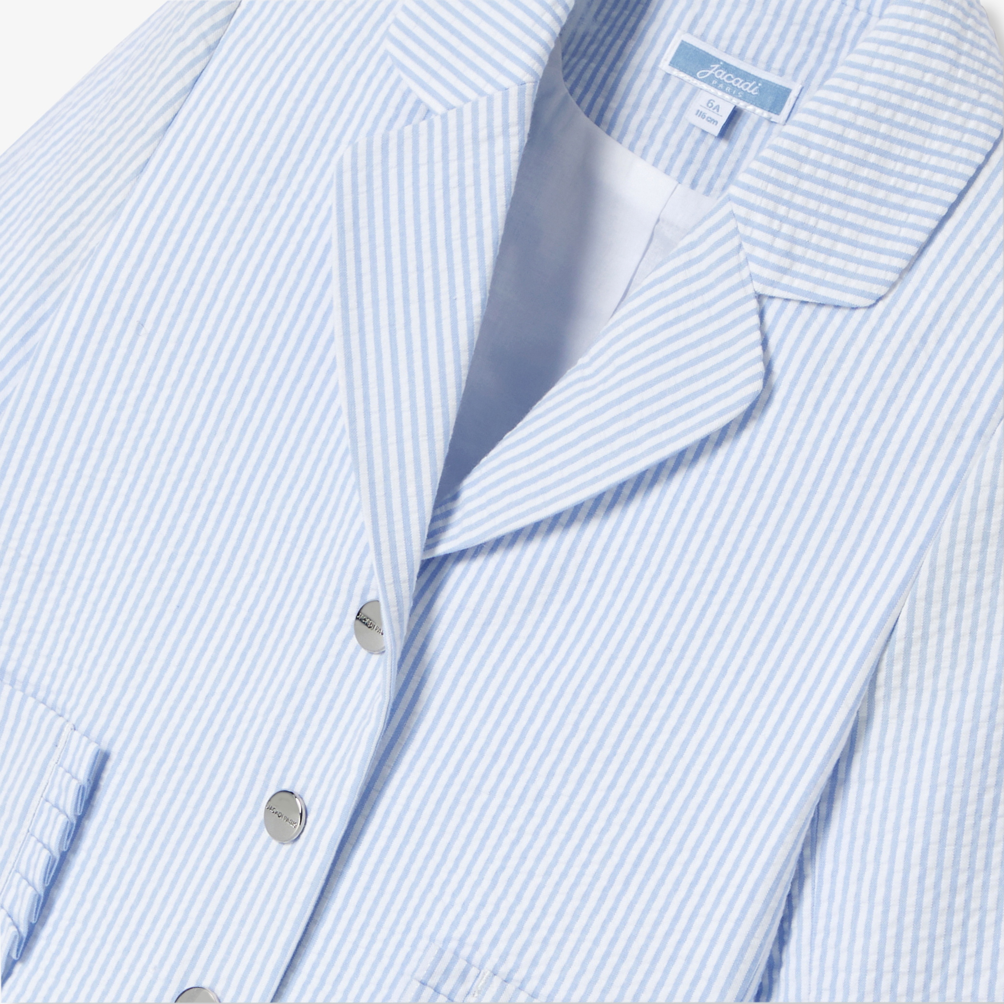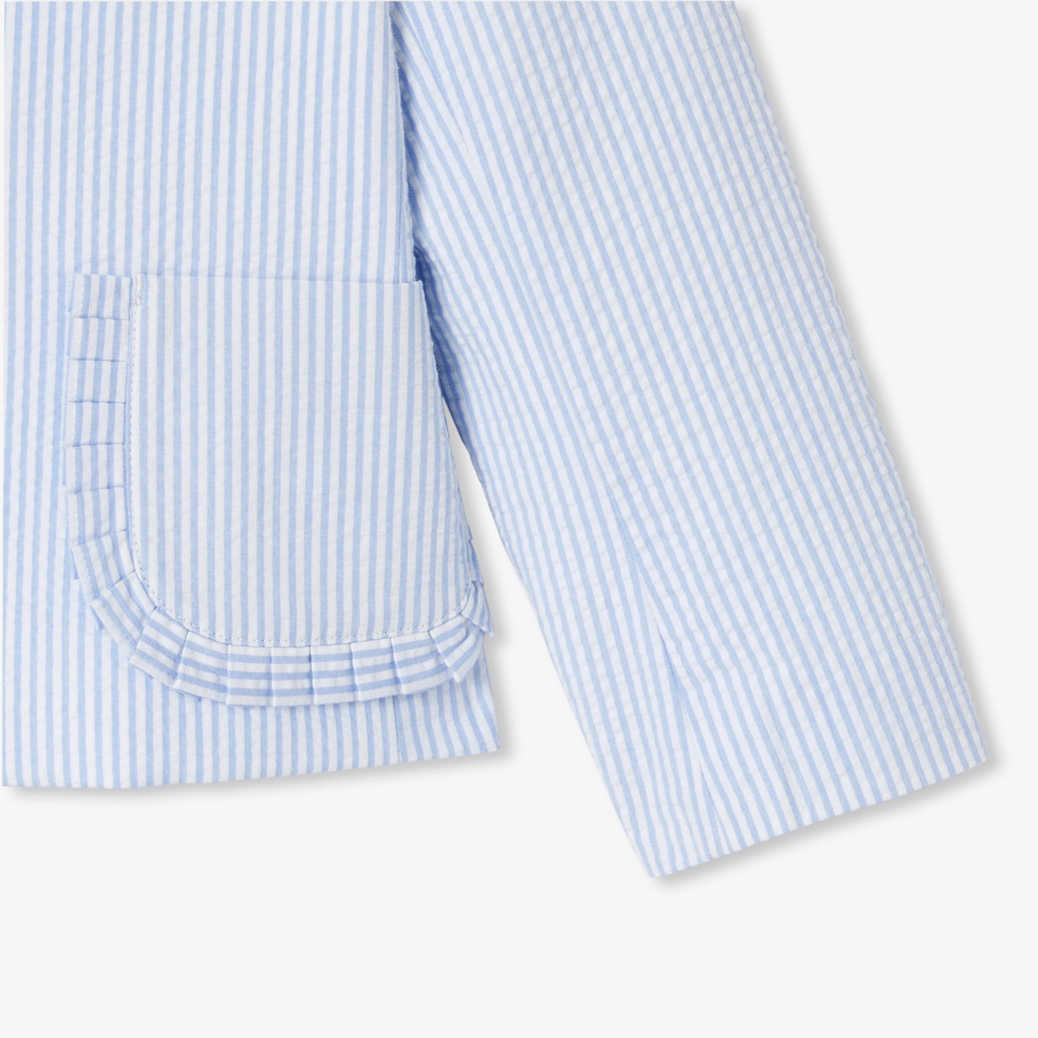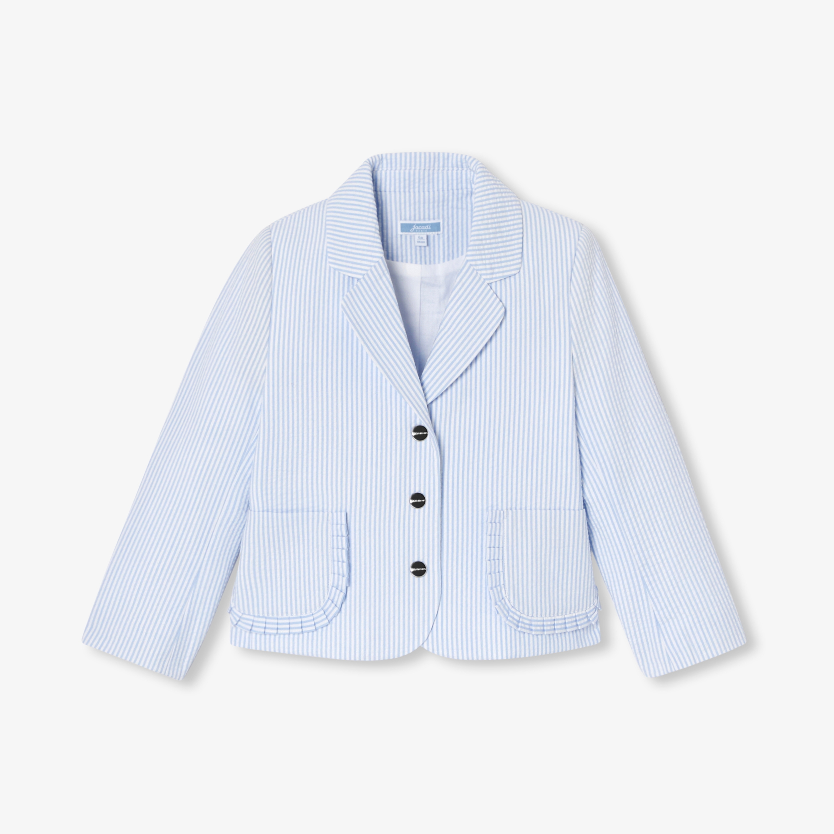 Modello inedito da indossare in primavera, la giacca bambina di questa stagione è impreziosita da un elegante tessuto in seersucker. Arricchito da tasche applicate con dettagli di ruches, fodera a contrasto e chiusura con automatici argentati completano questo blazer da indossare in total look con gli shorts coordinati o con un abito da tennis per un look preppy-chic impeccabile.