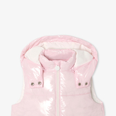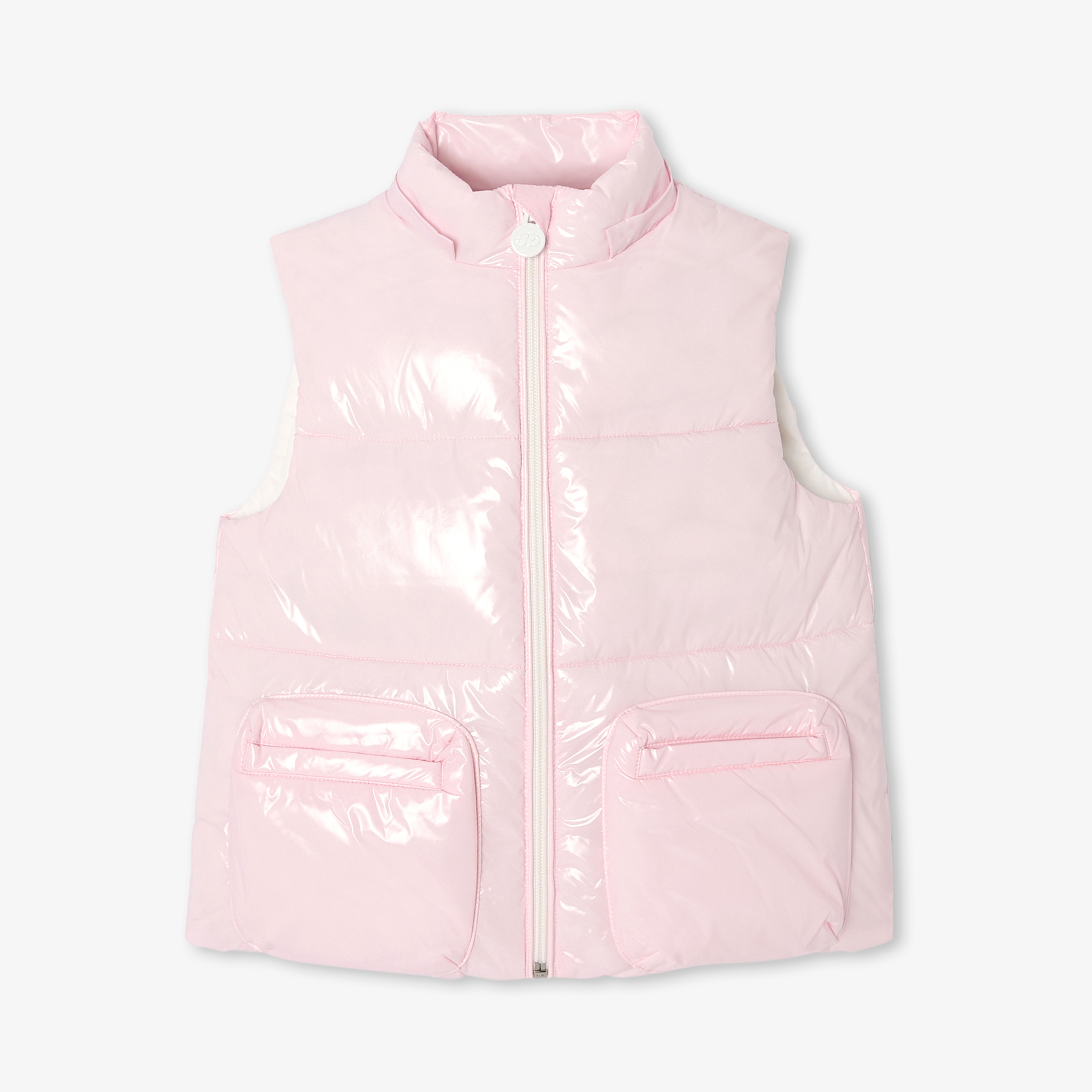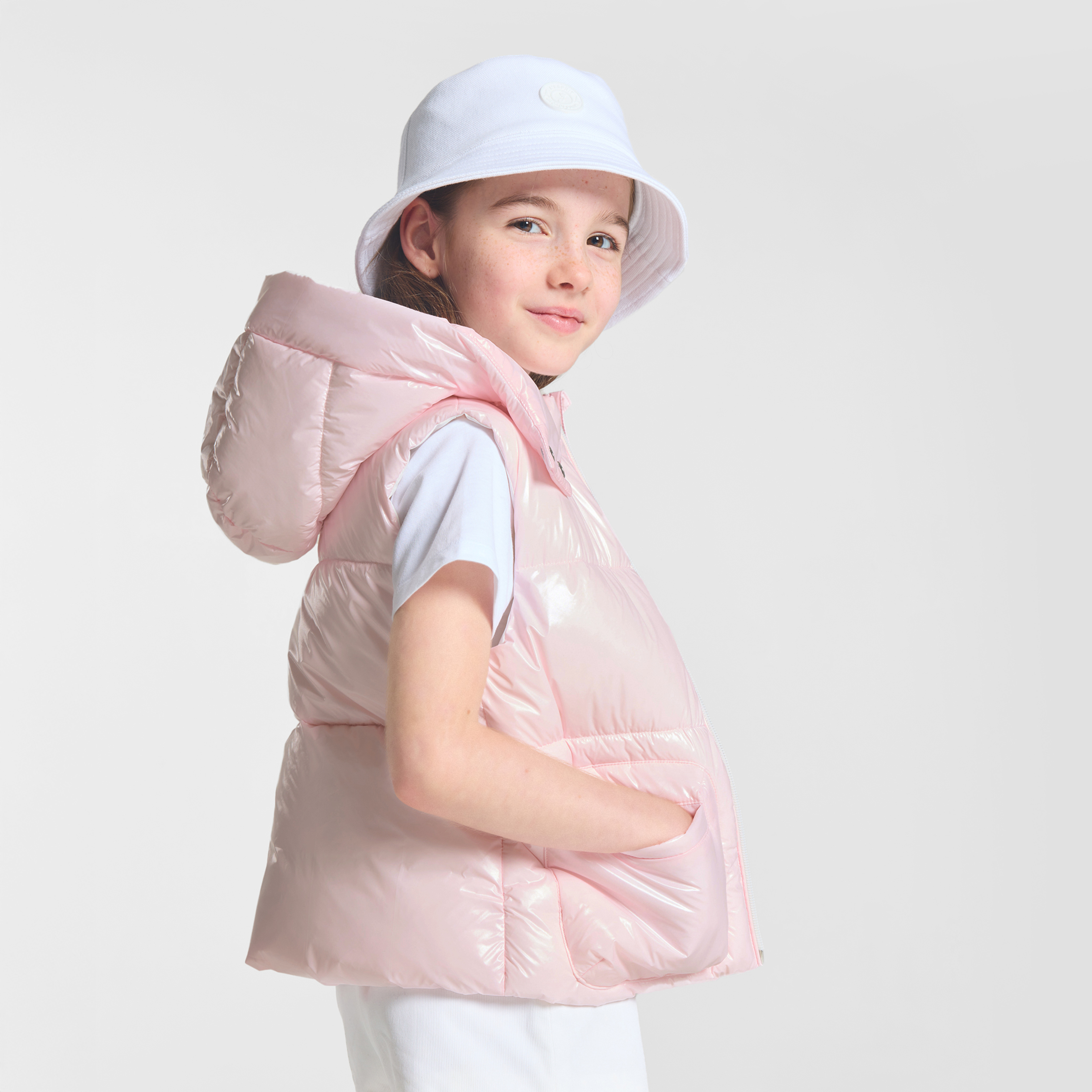 Ispirato al guardaroba degli anni '60 con il suo taglio grafico e le tasche oversize, l'immancabile piumino smanicato bambina presenta un inedito effetto laccato. Abbinato a una felpa o a un pullover con jeans ampi e scarpe con cinturino a T, le bambine lo indosseranno per tutta la stagione.