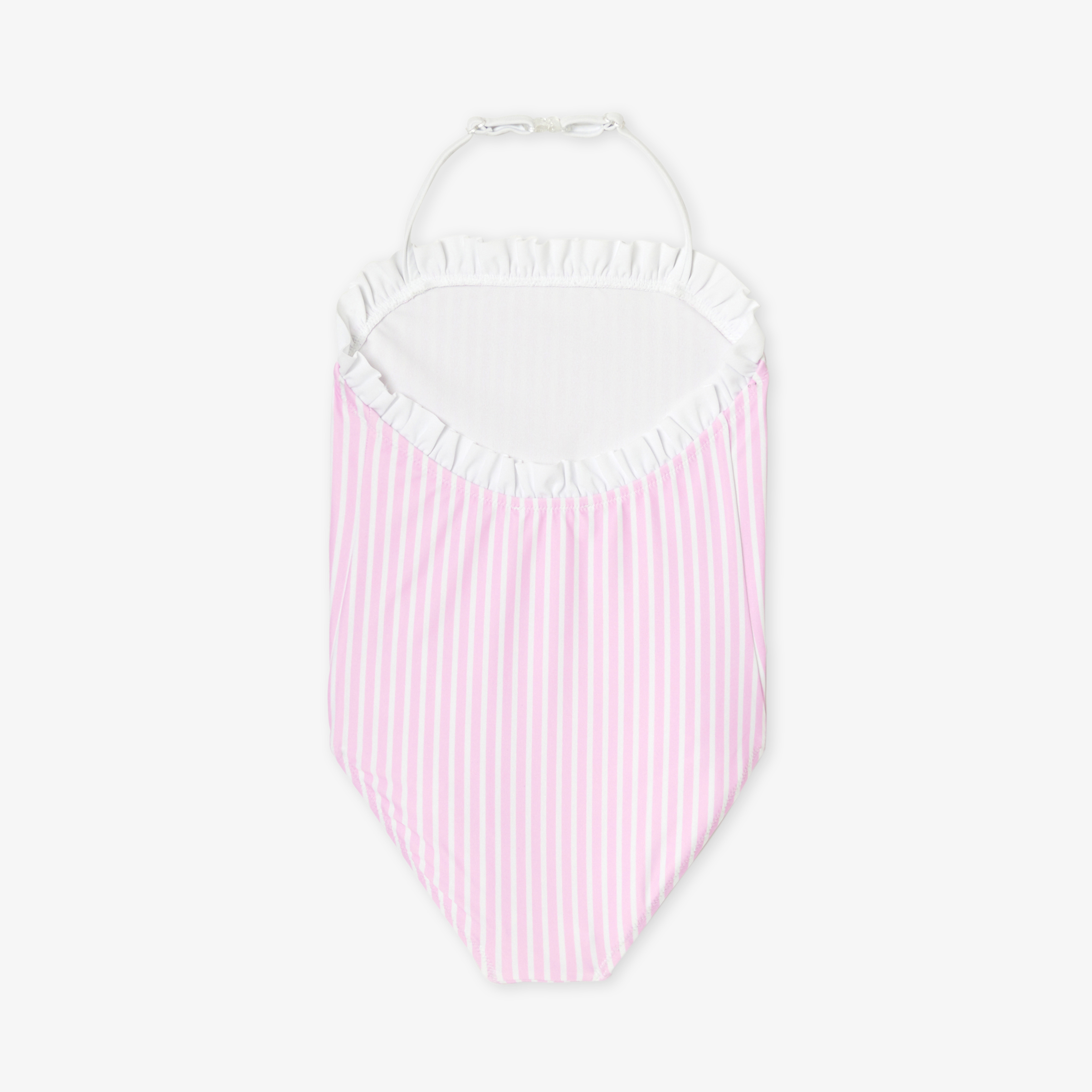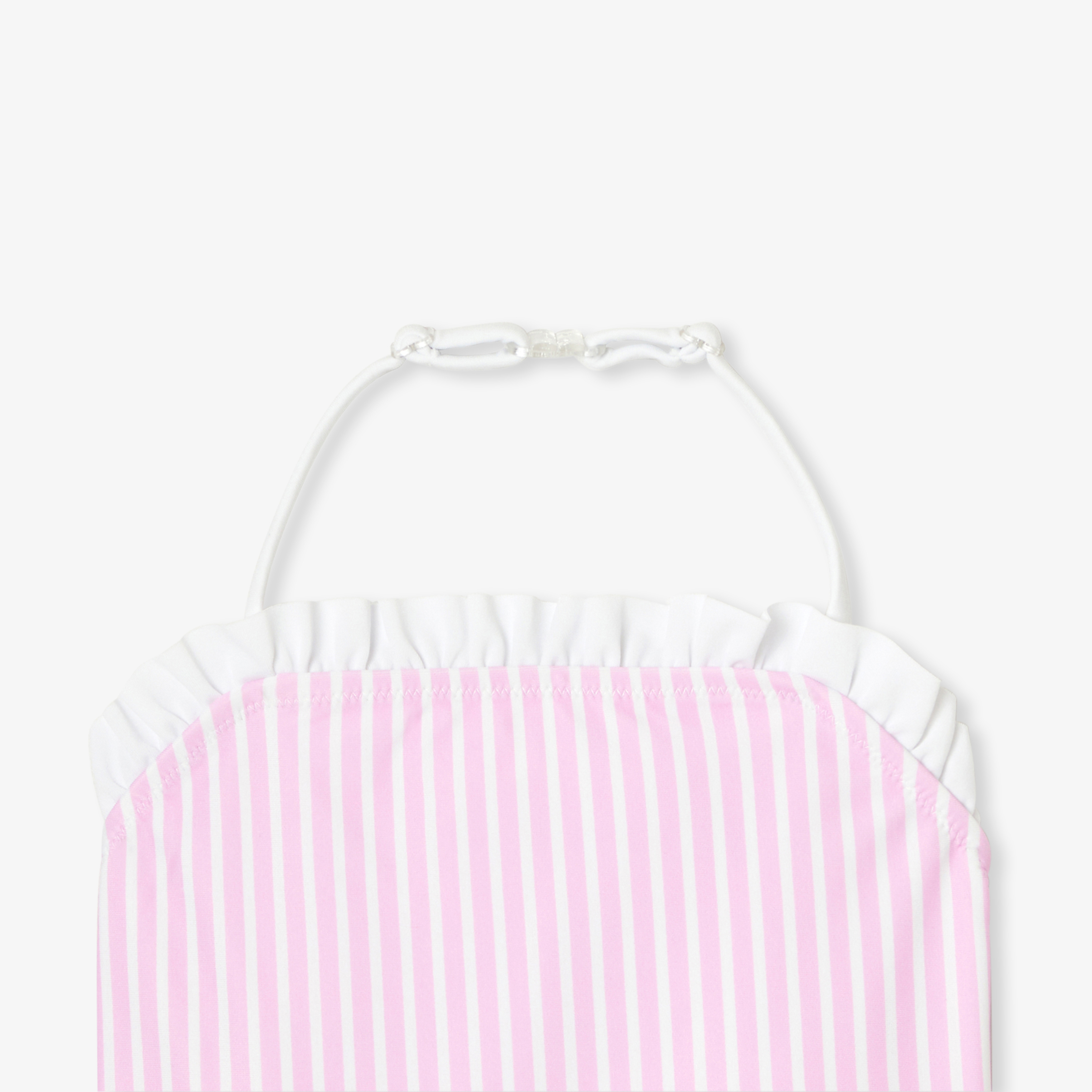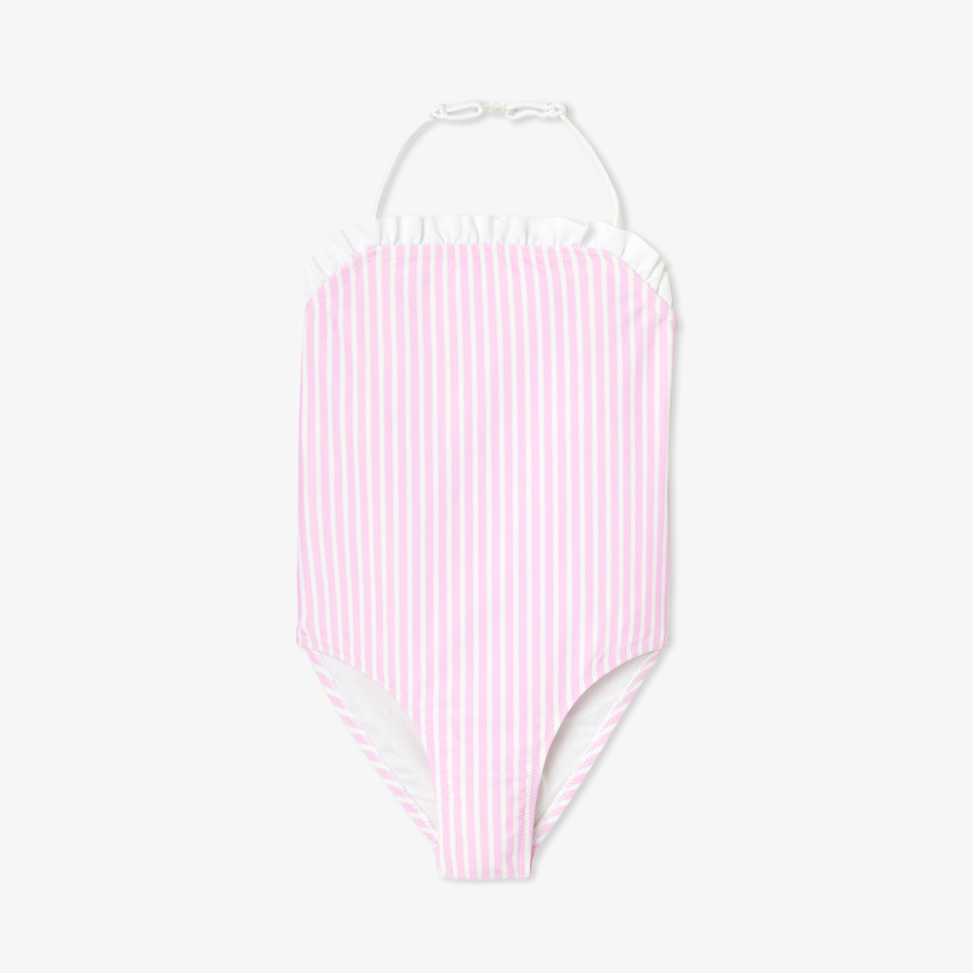 Arriva l'estate accompagnata da quest'elegante costume da bagno bambina. Grafico e raffinato, righe sottili e bei volant a contrasto evidenziano questo modello dalle linee rétro-chic. Da indossare con shorts in spugna e una tote bag per andare in spiaggia o in piscina, piacerà a tutte le bambine.