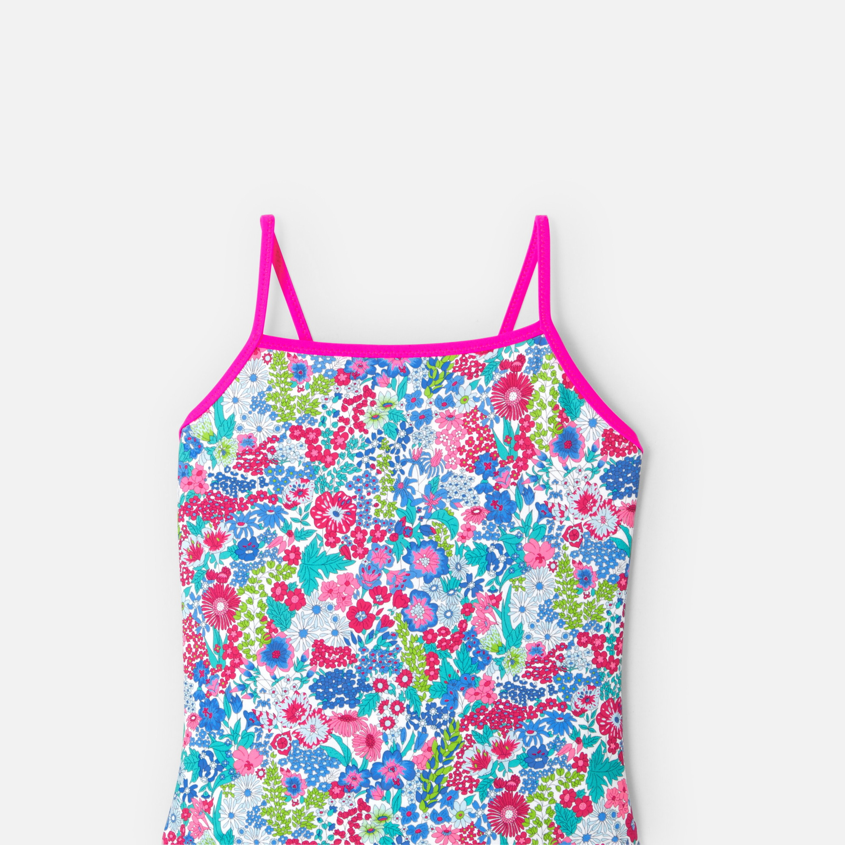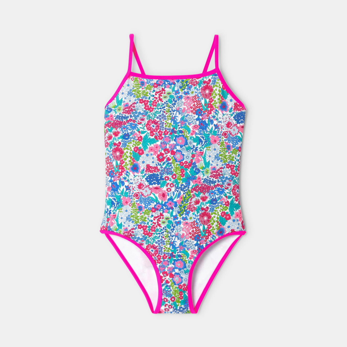 Un bouquet floreale rivitalizzante abbellisce questo costume da bagno bambina in tessuto Liberty. Arricchito da spalline sottili e da profili a contrasto per un look grafico, abbinalo al cappello coordinato per un outfit elegante e colorato.