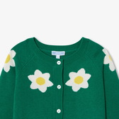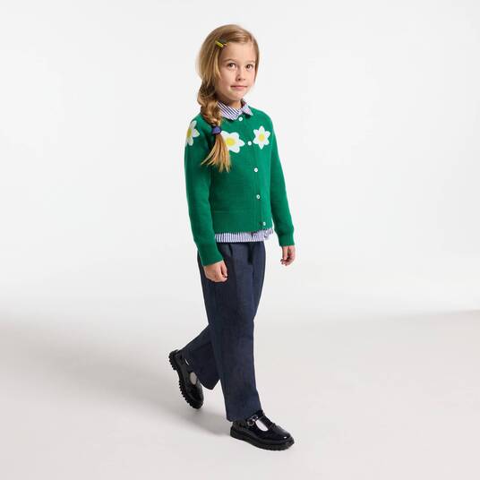 Realizzato in lana e cashmere, questo cardigan bambina presenta è impreziosito da un elegante intarsio floreale sullo scollo. Facile da infilare grazie alla chiusura con bottoni tono su tono, può essere indossato sopra un abito o una t-shirt con colletto per creare un adorabile look chic e preppy.