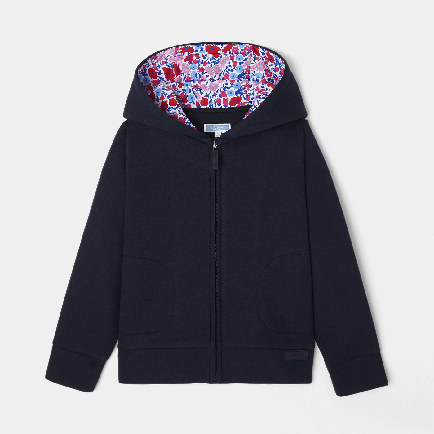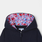 Gli stilisti hanno aggiunto una fodera in tessuto Liberty nel cappuccio di questa felpa bambina per modernizzarla. In jersey accoppiato, zip e tasche nelle cuciture completano questo modello contemporaneo da indossare sopra una t-shirt e graziosi jeans scampanati per il ritorno a scuola.