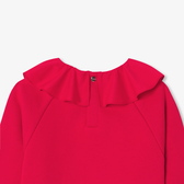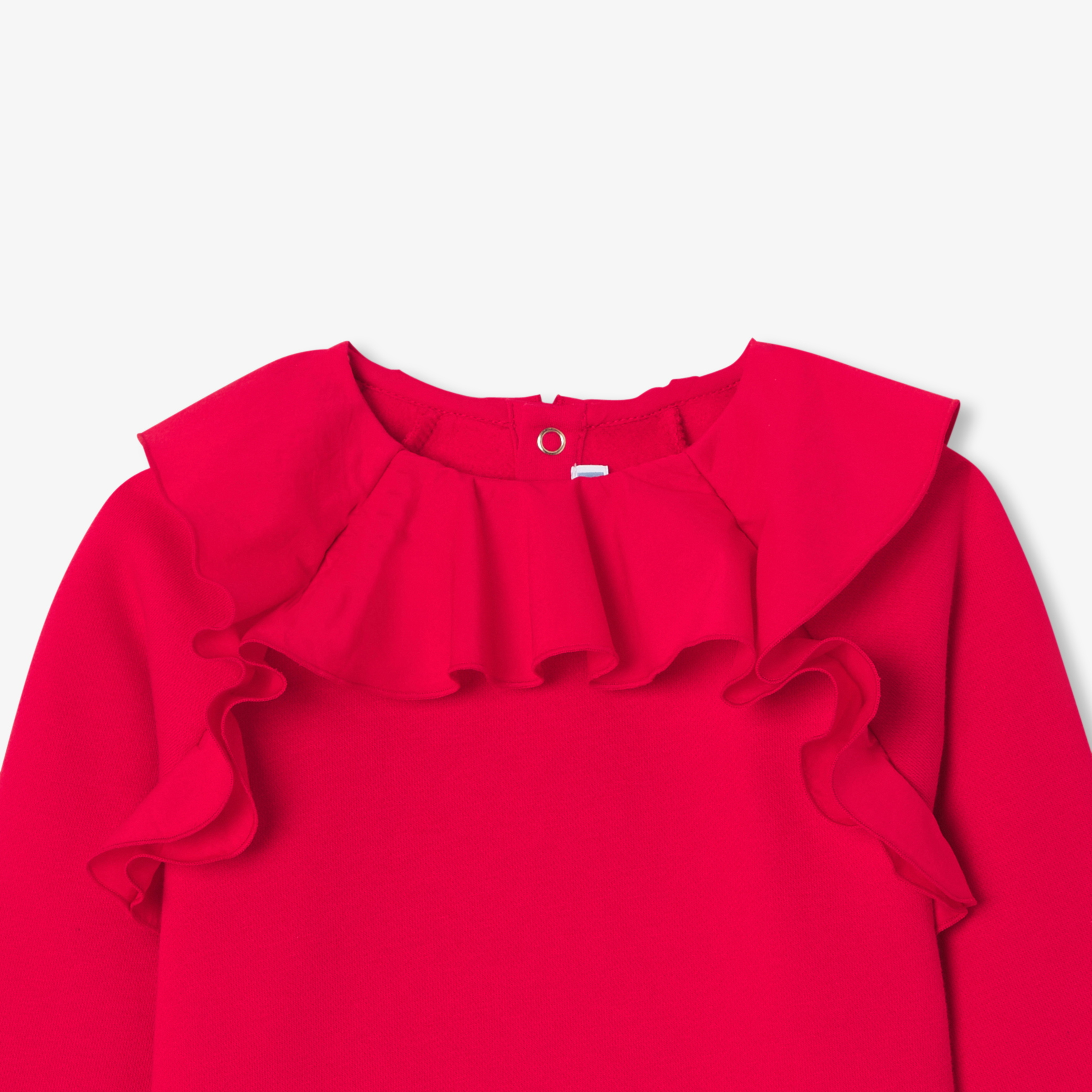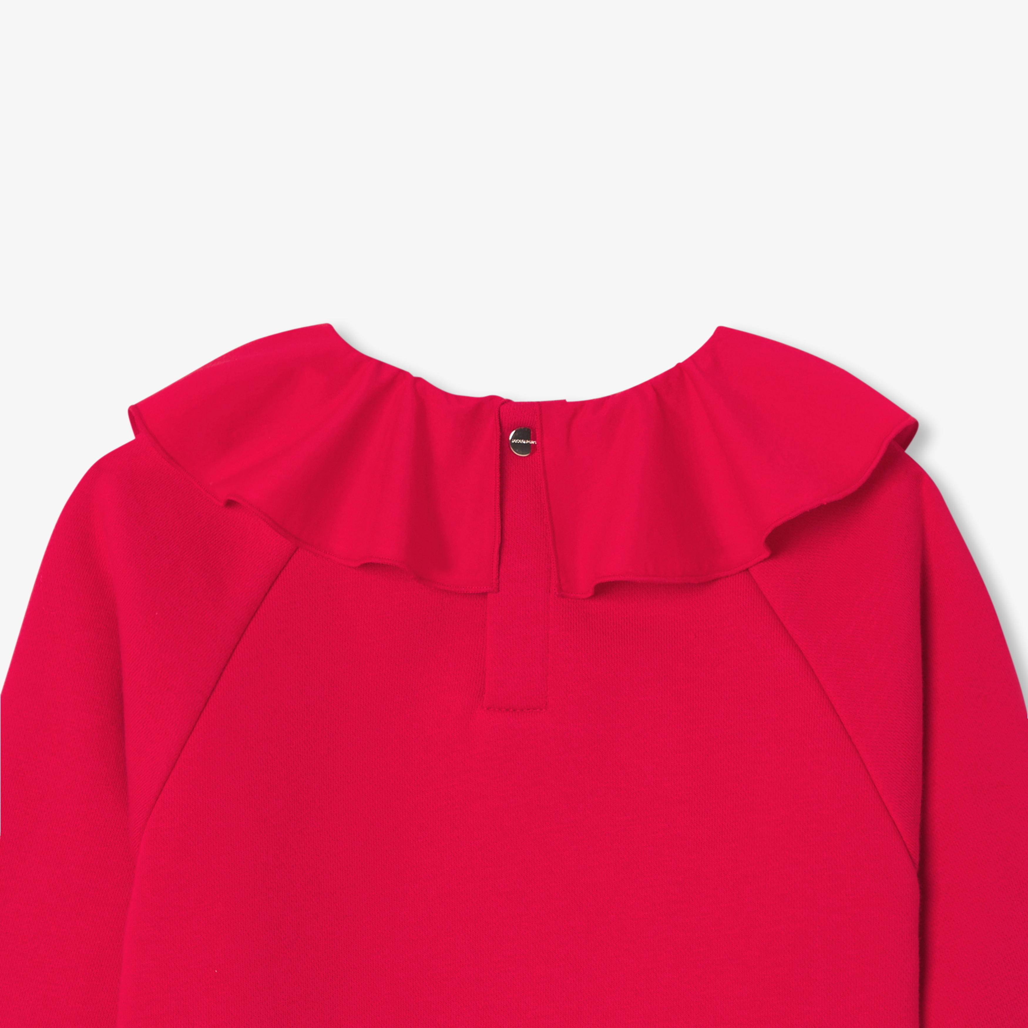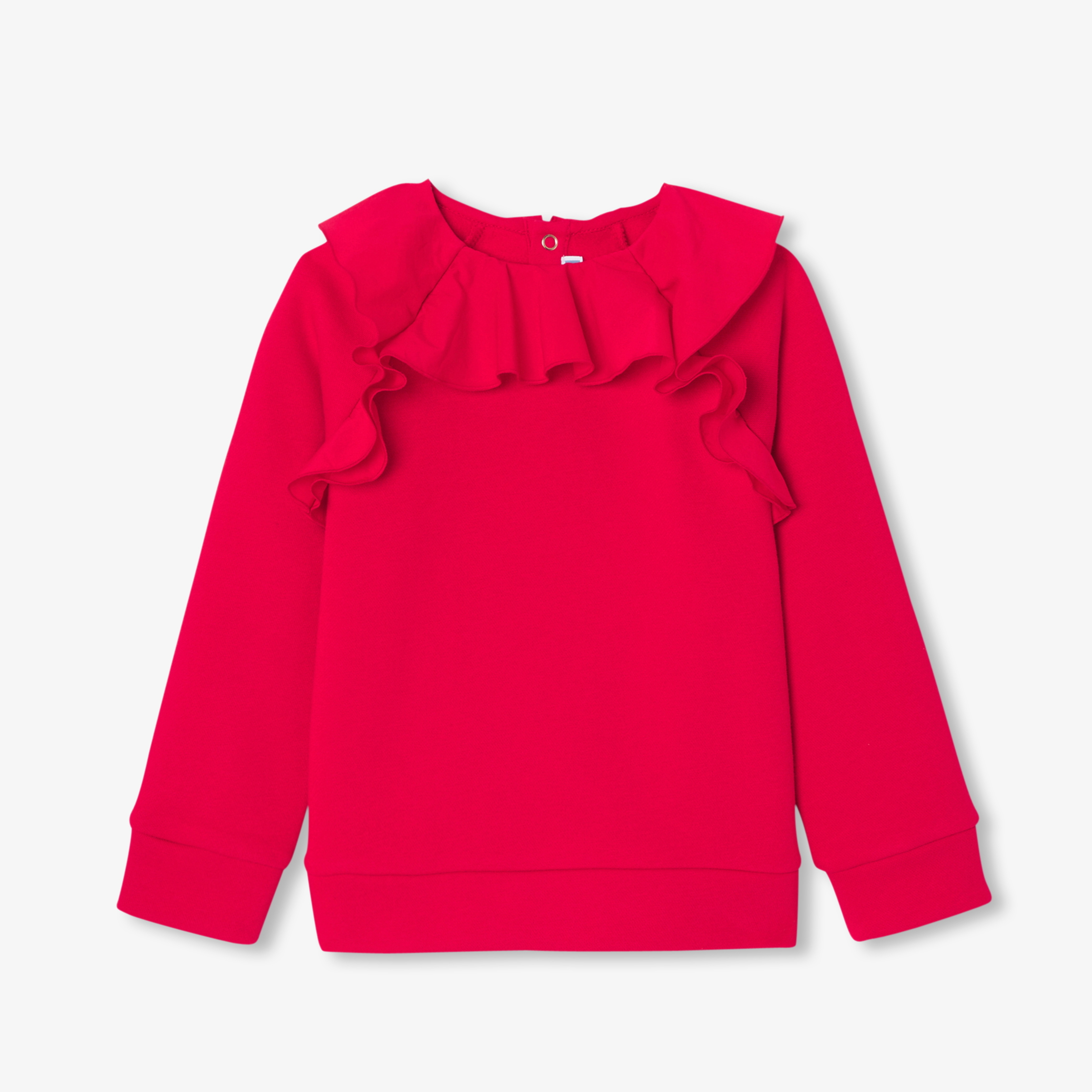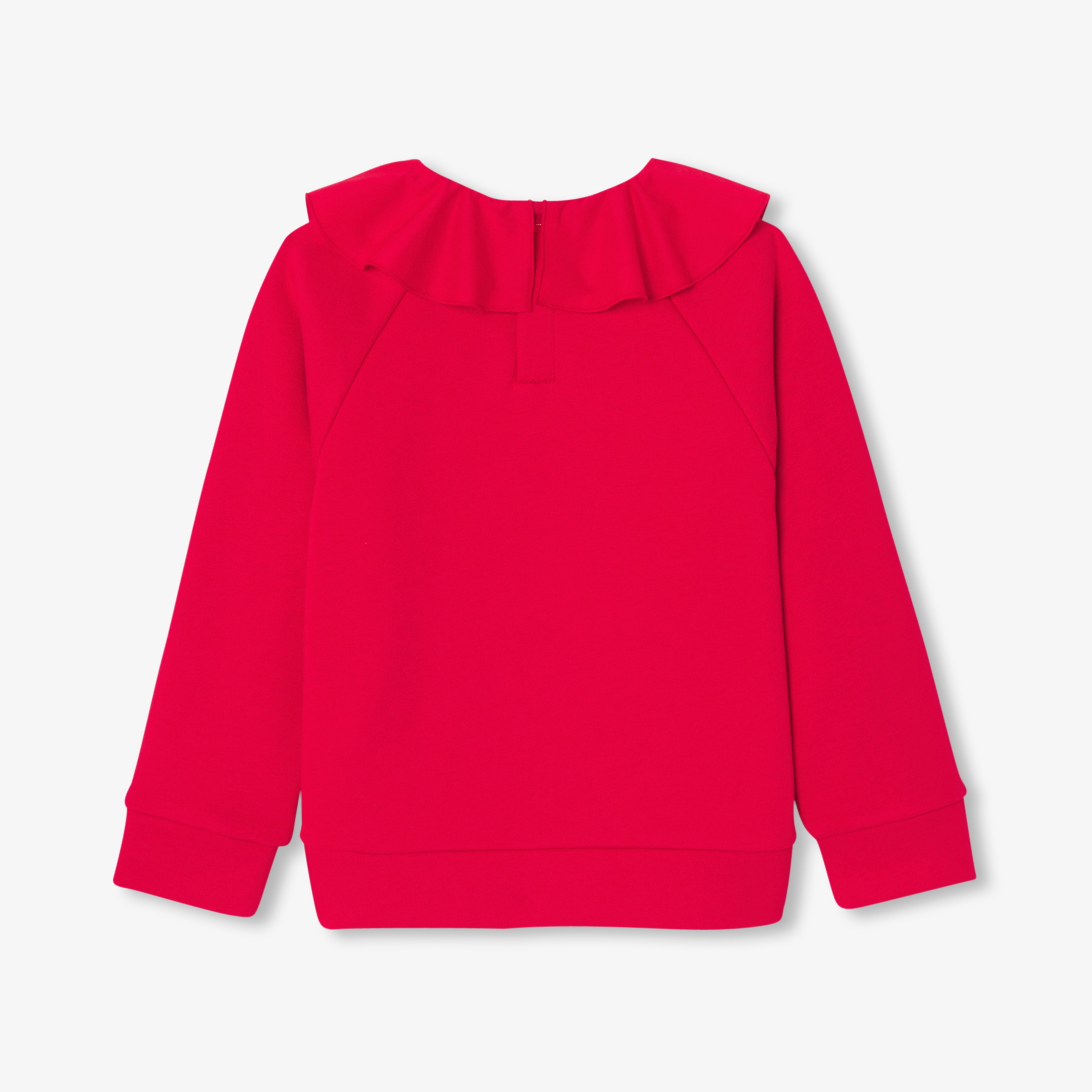 Must-have di ogni guardaroba, la felpa bambina sfoggia tutta la sua eleganza e originalità per il rientro a scuola. In tessuto felpato garzato rosso fiammante con moderni inserti in popeline con volant, si abbina perfettamente con una gonna plissettata o pantaloni ampi e sneakers per un look casual-chic e parigino.