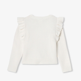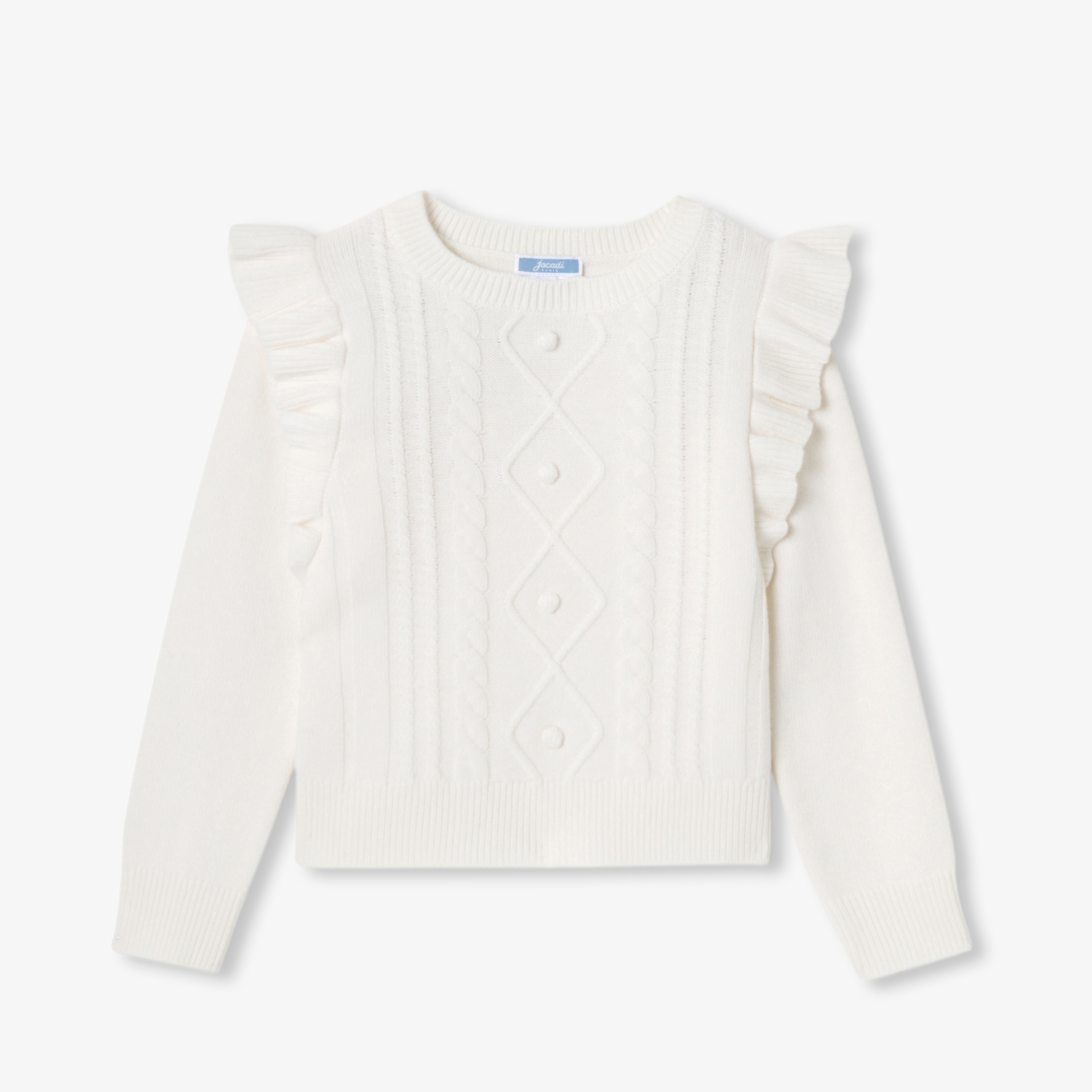 Ispirato all'iconico maglione irlandese e reinterpretato in versione romantica, il modello bambina è realizzato in lana responsabile per l'autunno. Valorizzato da un gioco di trecce sul davanti e da volant sulle maniche per un tocco di modernità, il suo colore bianco si abbinerà perfettamente a pantaloni in velluto rosa e a un paio di stivaletti per un look per tutti i giorni.