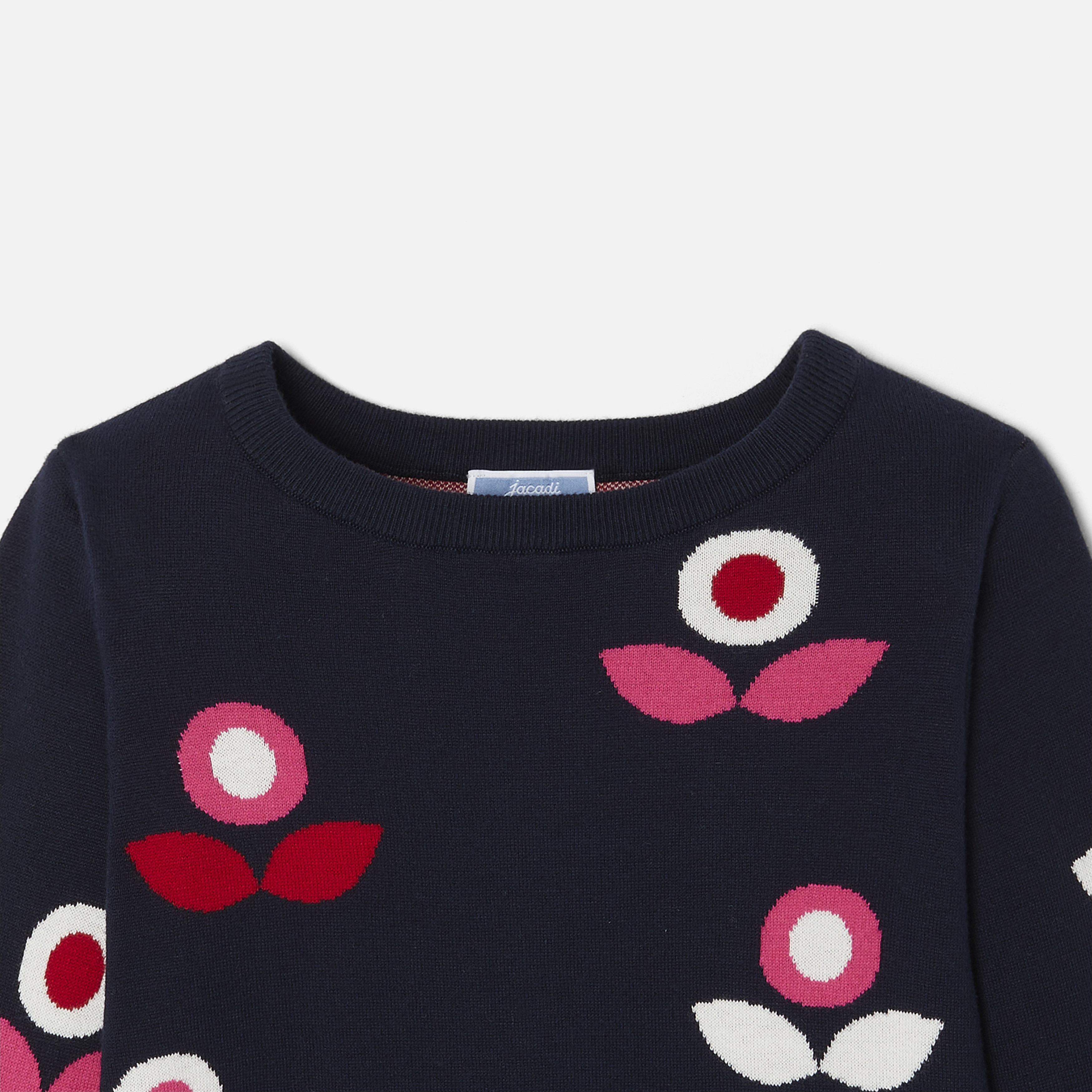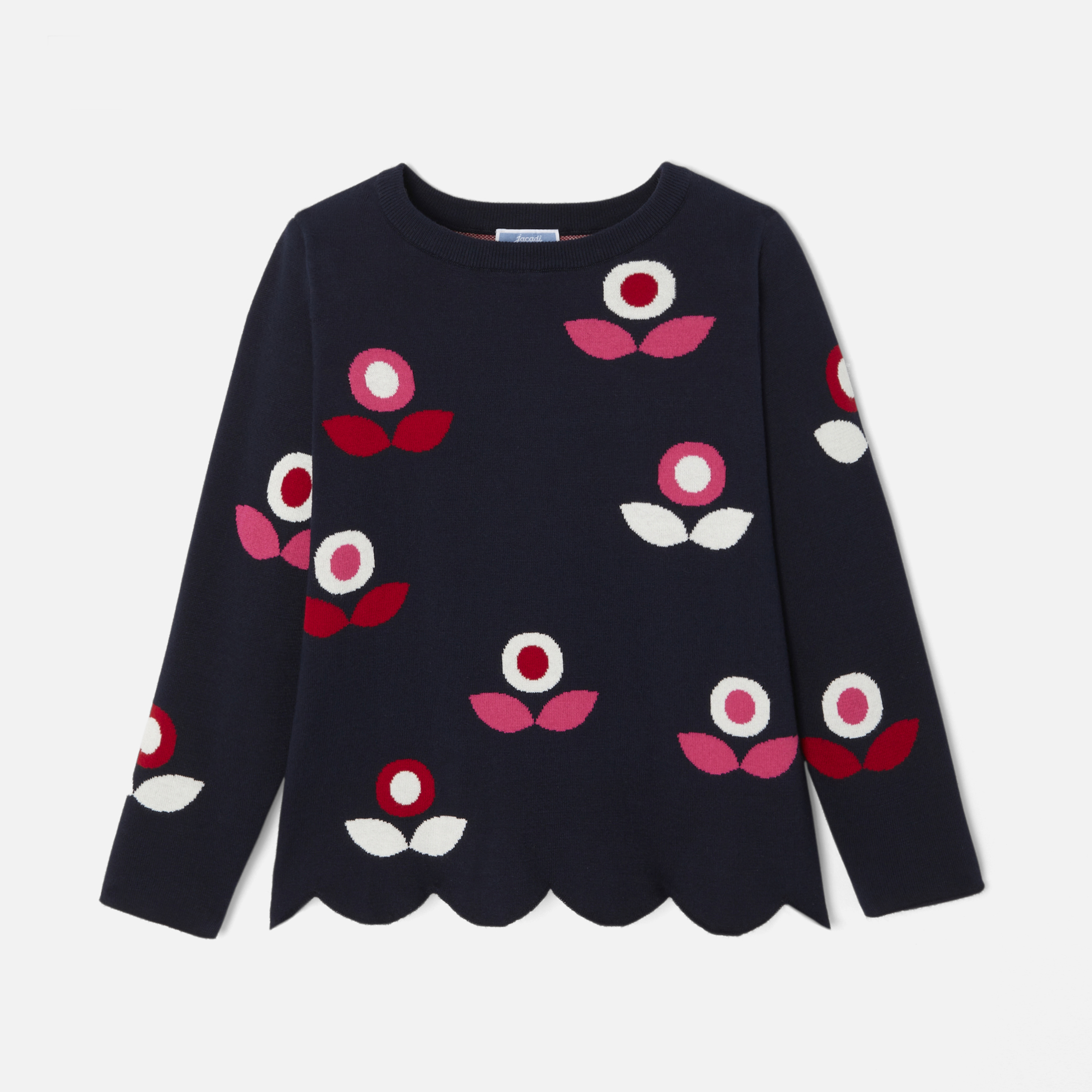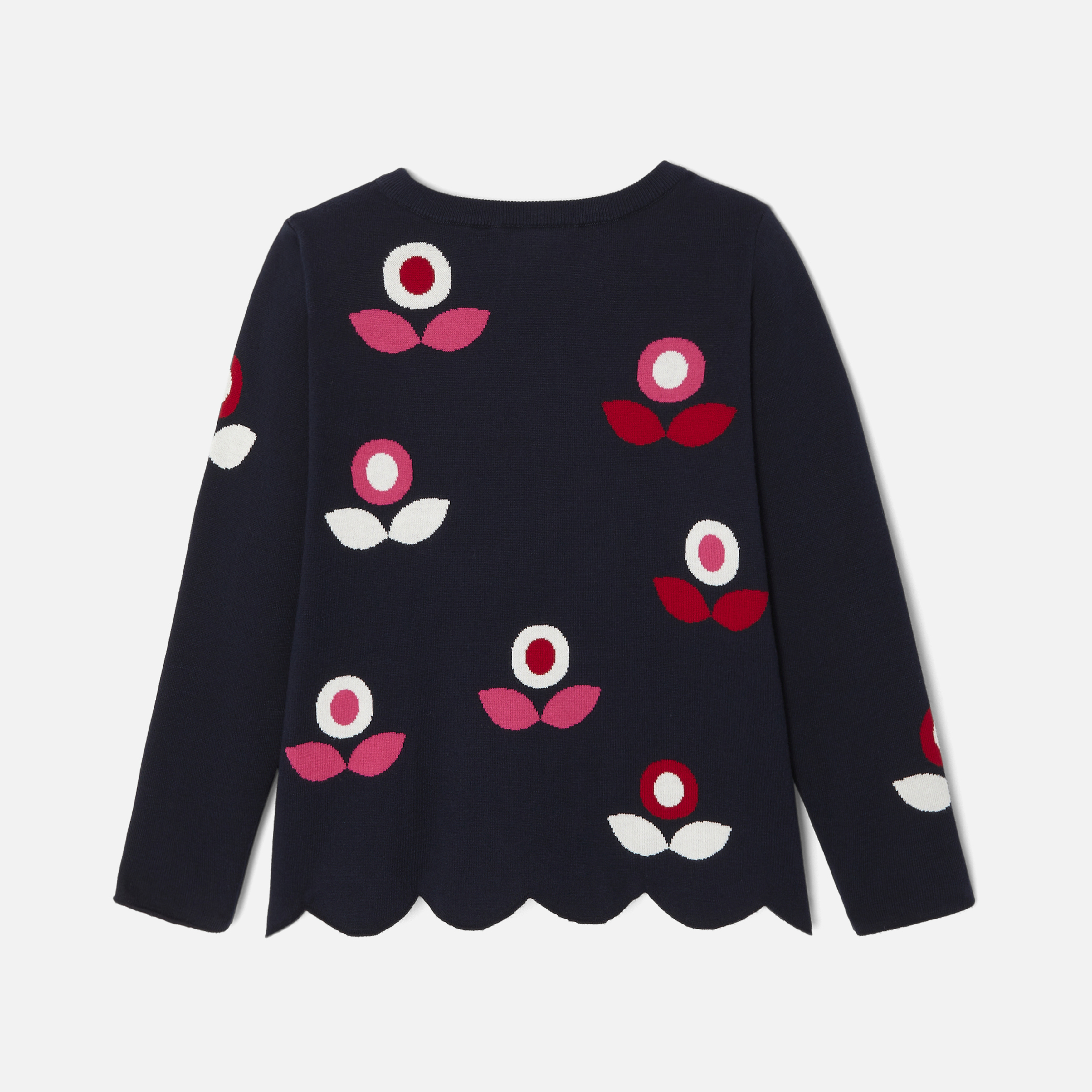 Questo pullover bambina trova il giusto equilibrio tra stile elegante e casual. In morbido cotone, un inedito motivo a fiore da scoprire in tutta la collezione e un fondo smerlato dinamizzano questo modello rétro da indossare a scuola con shorts o jeans scampanati per un look dal fascino francese.