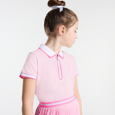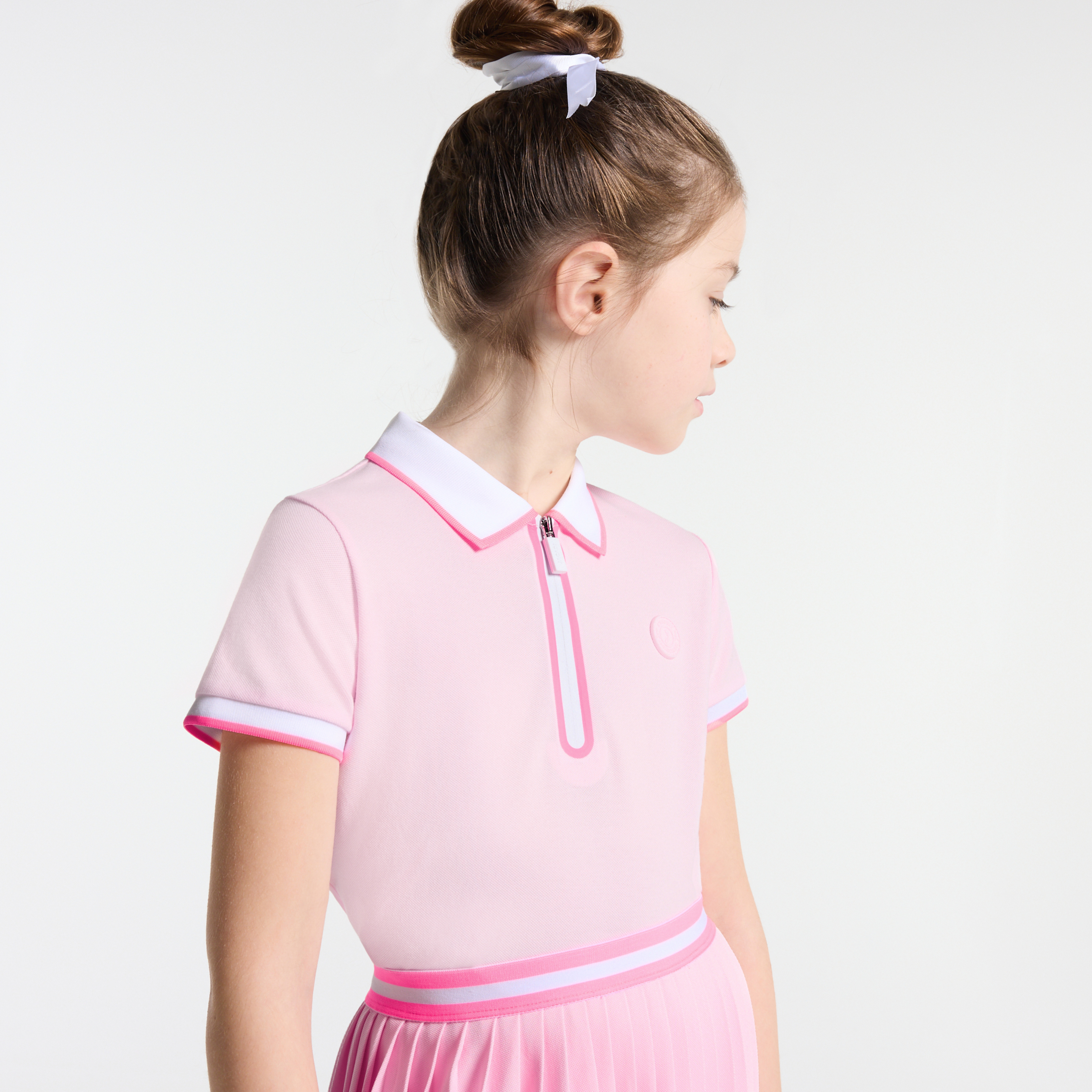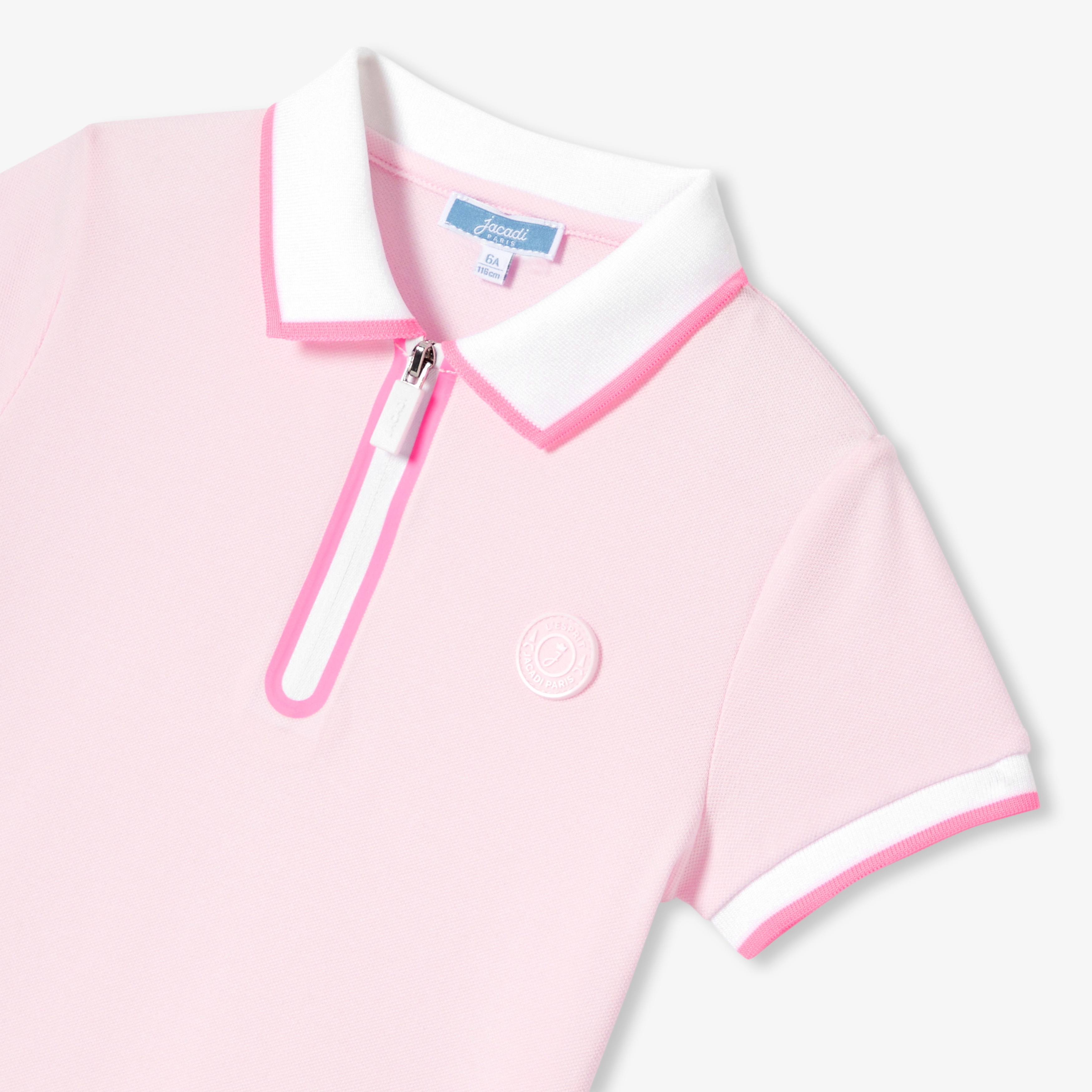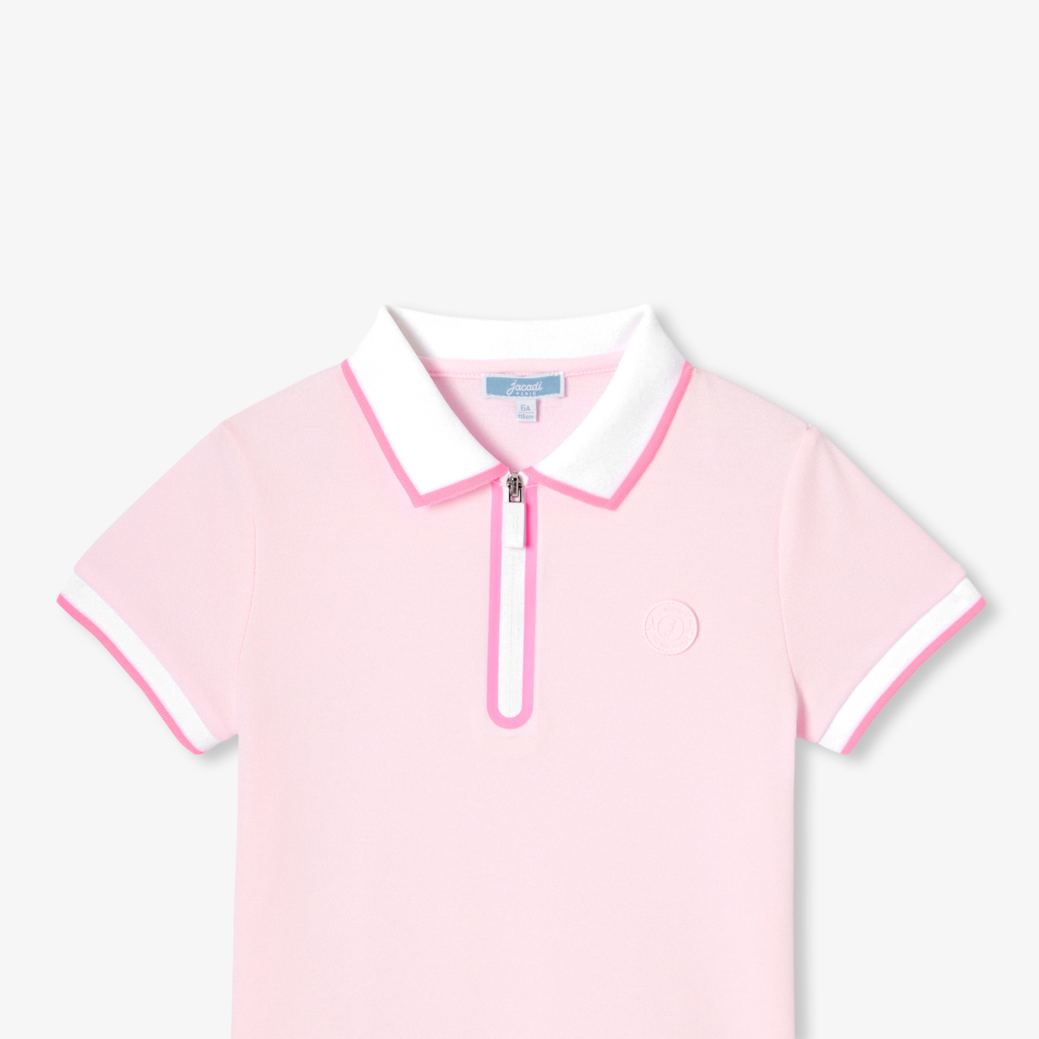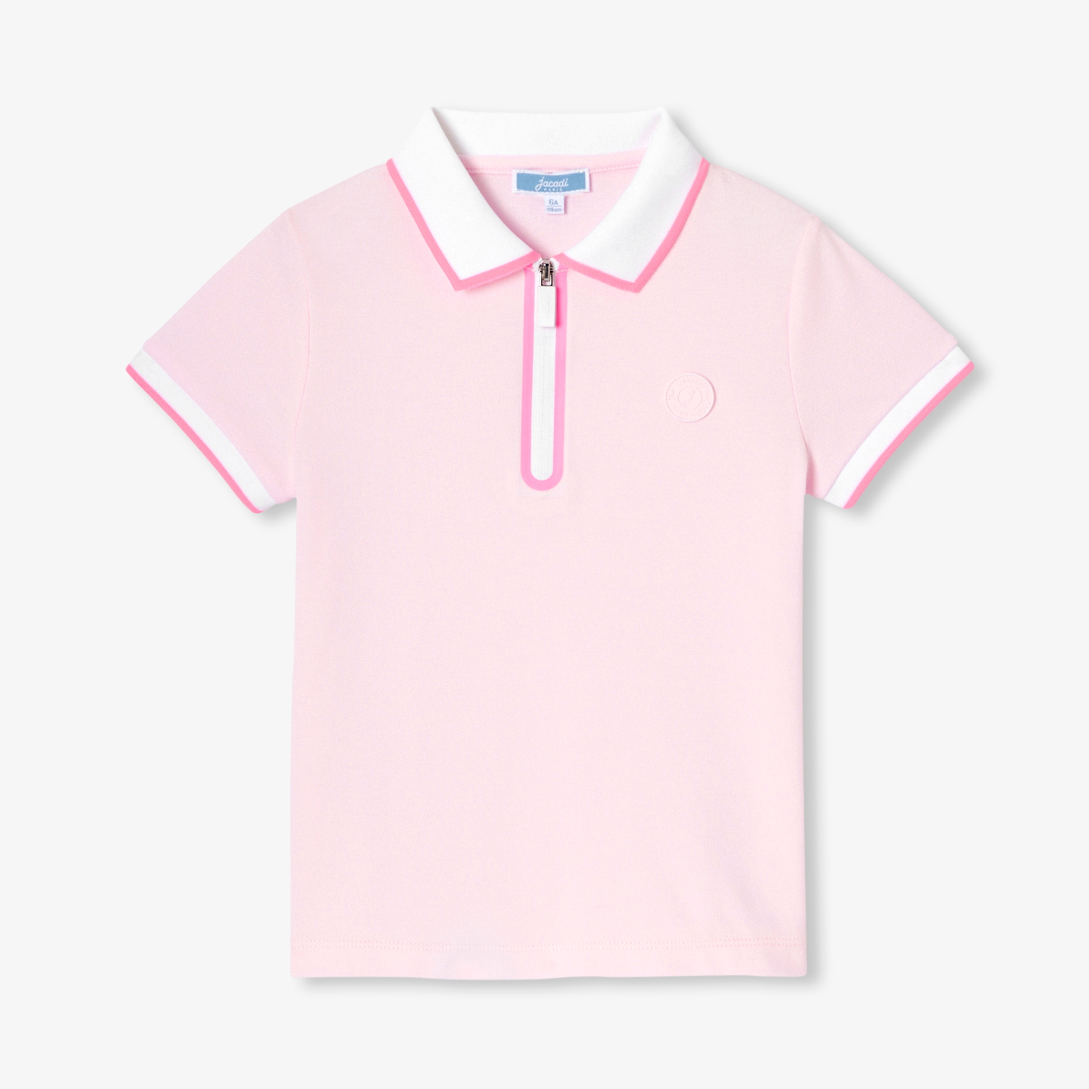 Un outfit quotidiano comodo e sporty-chic con questa incantevole polo bambina. In maglia piqué, bordo a coste su colletto e fondo manica e apertura con zip strutturano questo modello da indossare con una gonna a pieghe o una gonna pantalone in jeans e scarpe con cinturino a T per un look moderno e city.
