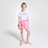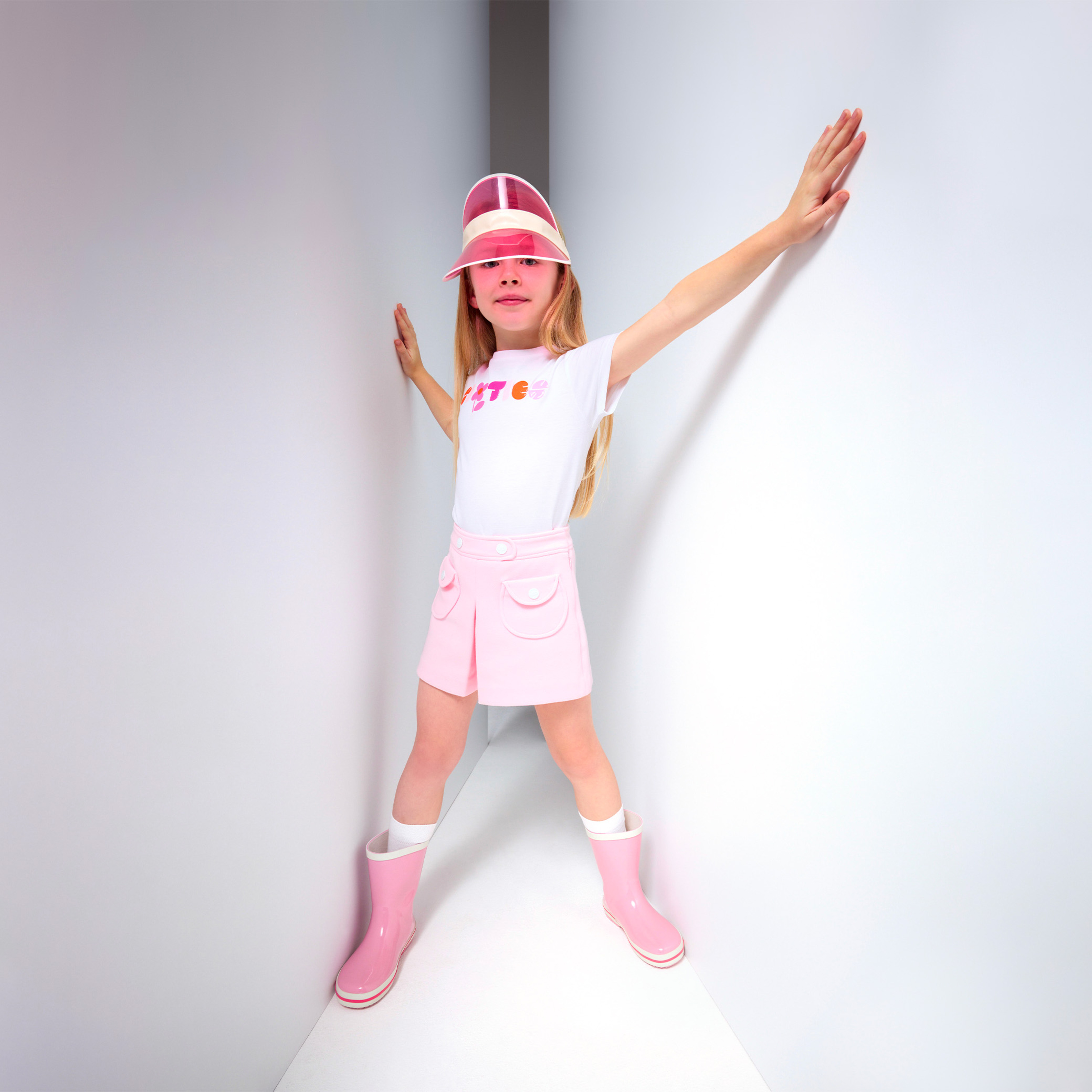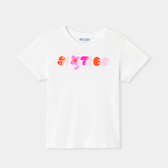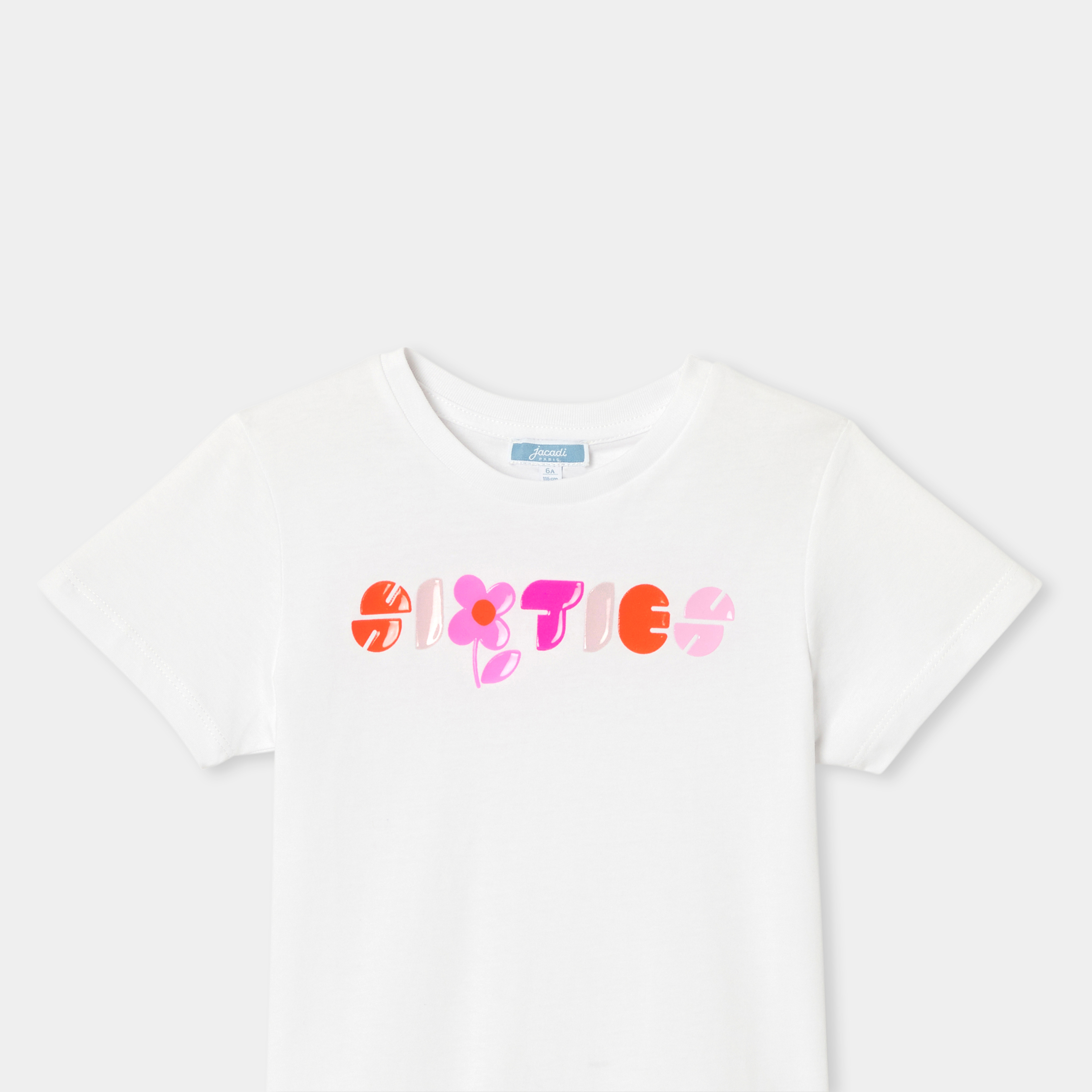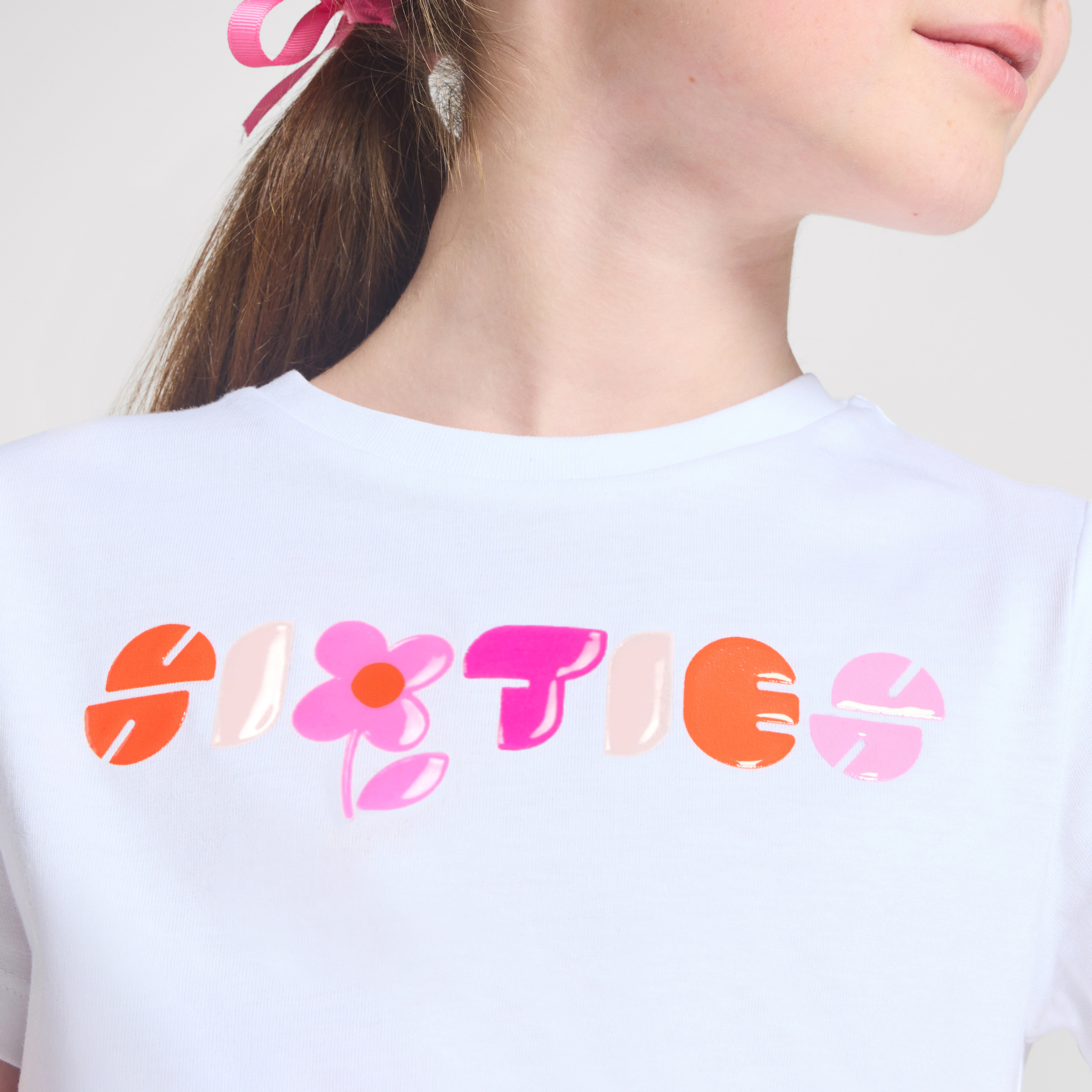 In cotone biologico e impreziosita dalla scritta stampata "Sixties" con effetto laccato, la t-shirt bambina sfoggia un look rétro per la primavera. Indossata con pantaloni ampi e una giacca bianca in tessuto felpato o una gonna in taffetà, accompagnerà le bambine fino al ritorno a scuola.