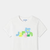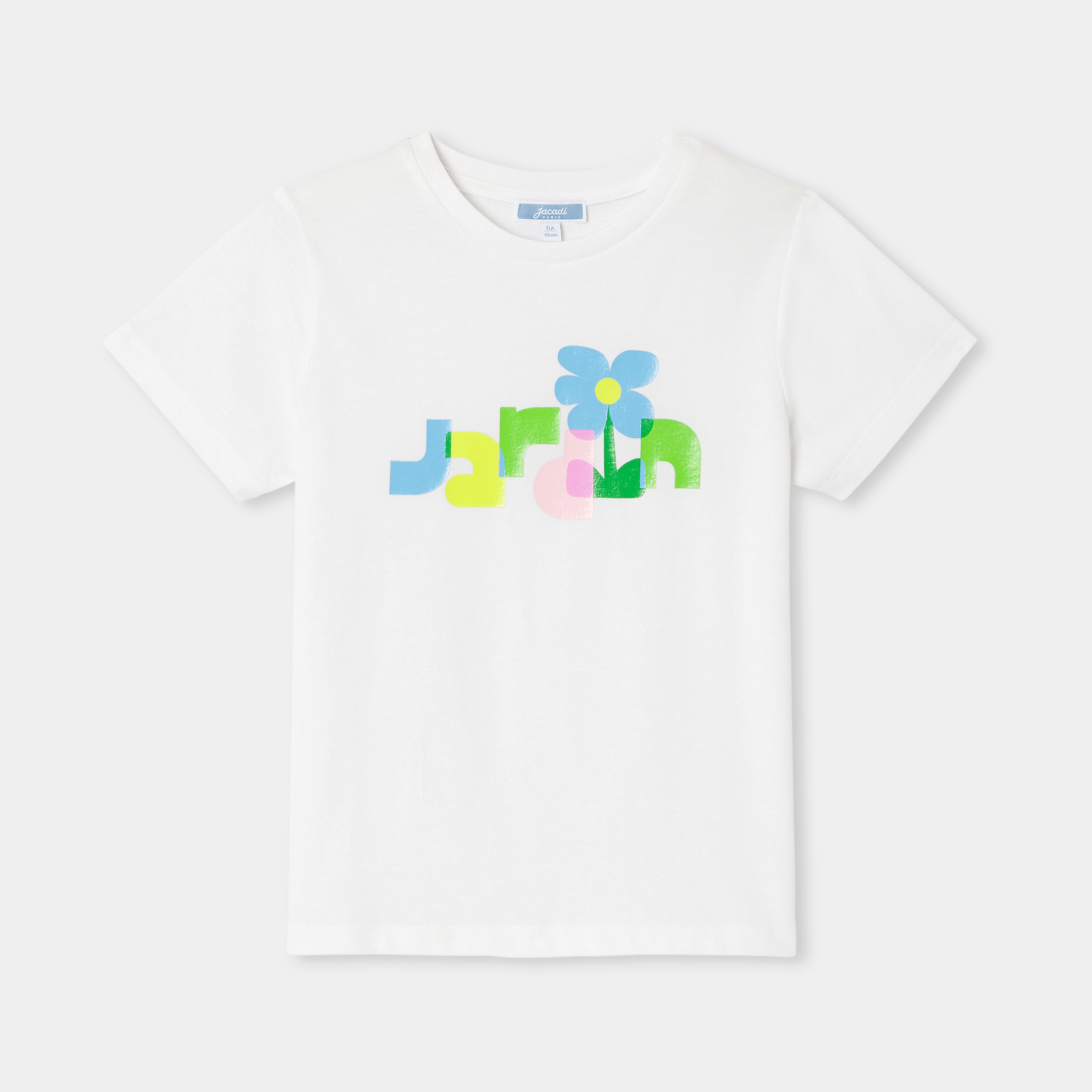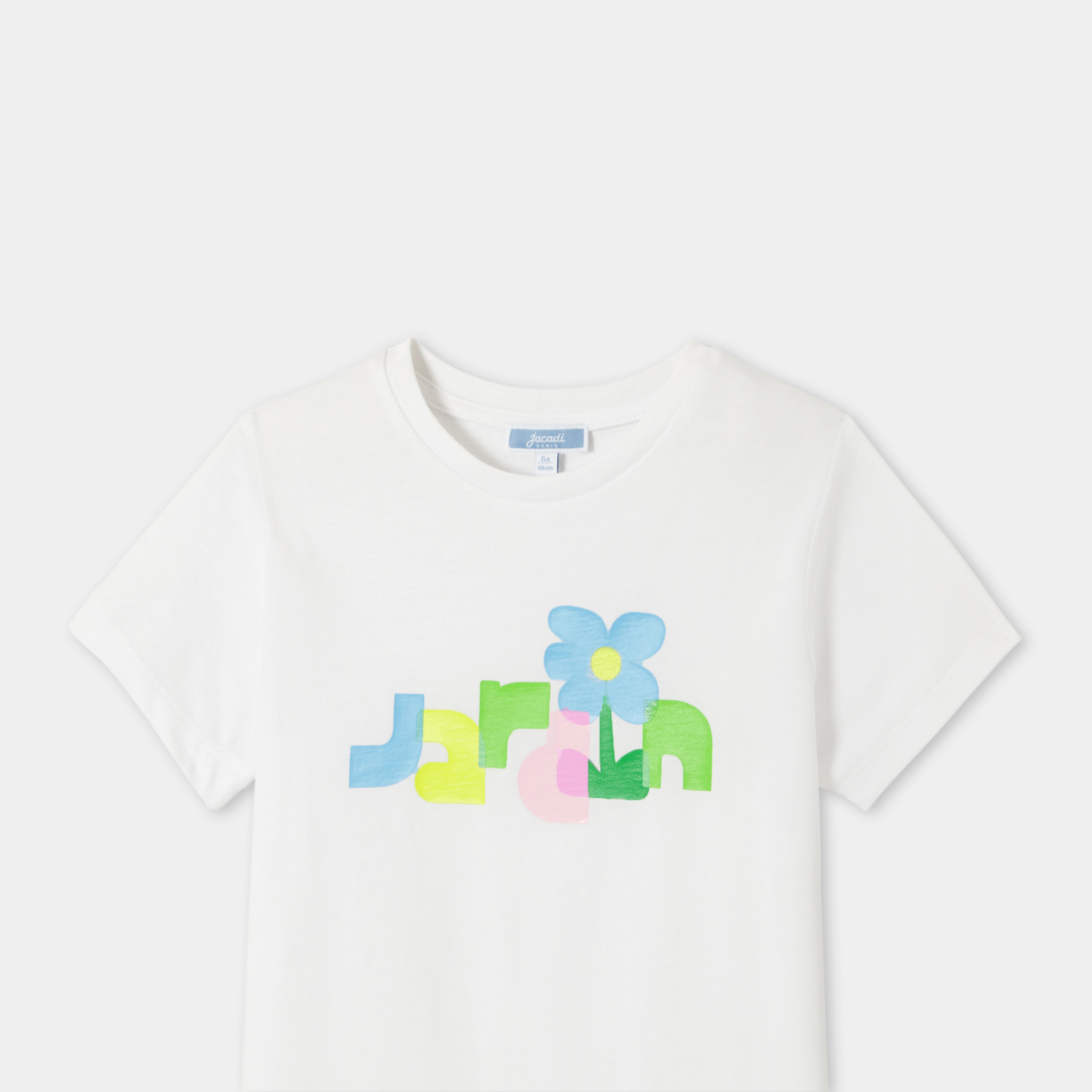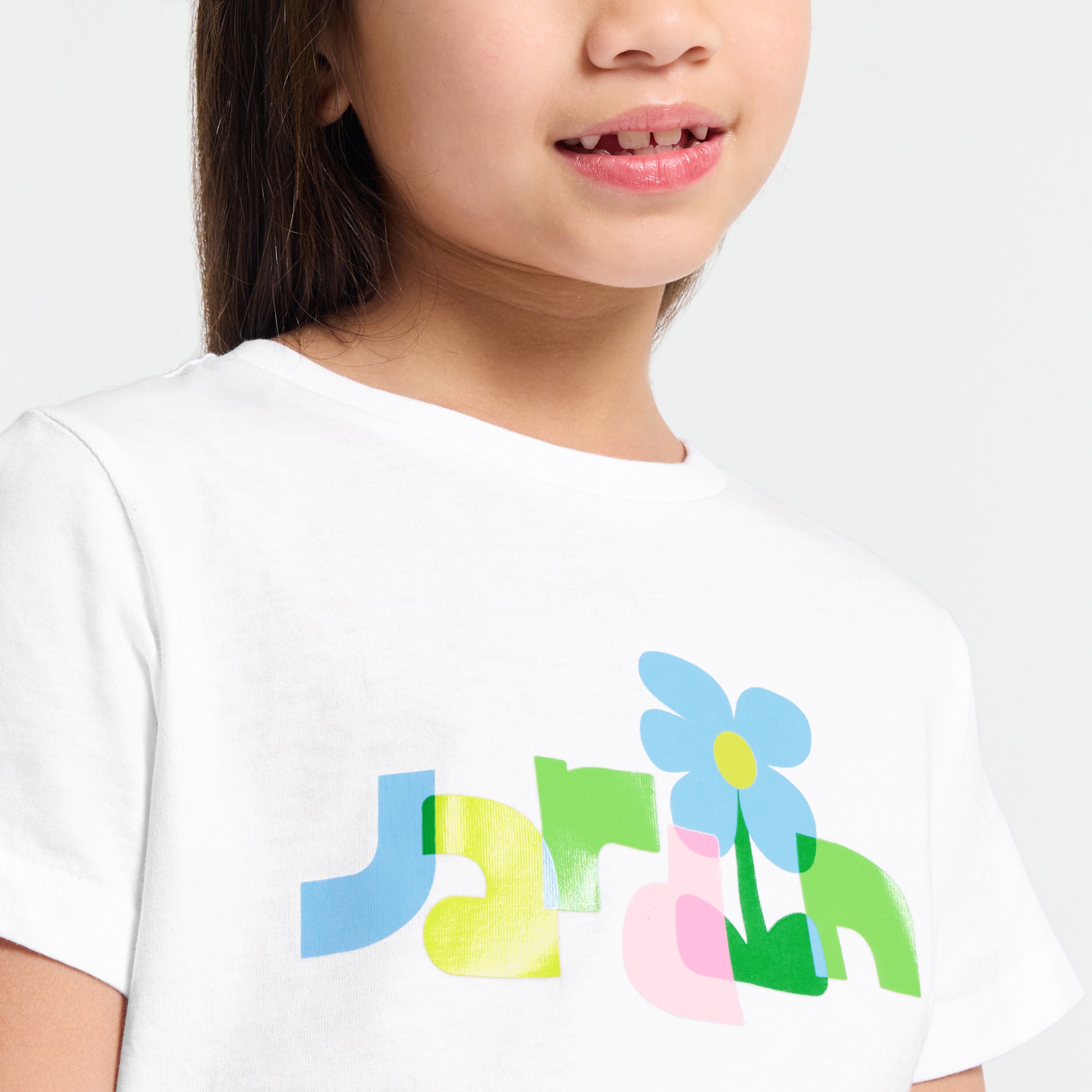 Ideale per l'outfit quotidiano e facile da coordinare, la t-shirt bambina di questa stagione ci invita a una passeggiata nel cuore di un giardino pop e colorato. Arricchita dalla scritta "Jardin" stampata e da un fiore blu, abbinala alla gonna a pieghe coordinata e a una giacca in seersucker per un look ultra contemporaneo.