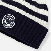 Cavalca la tendenza marinière con questo elegante berretto a costine. Morbido e coprente grazie alla maglia a doppio spessore, proteggerà i bambini per tutto l'autunno. Questo berretto può essere abbinato allo snood coordinato.