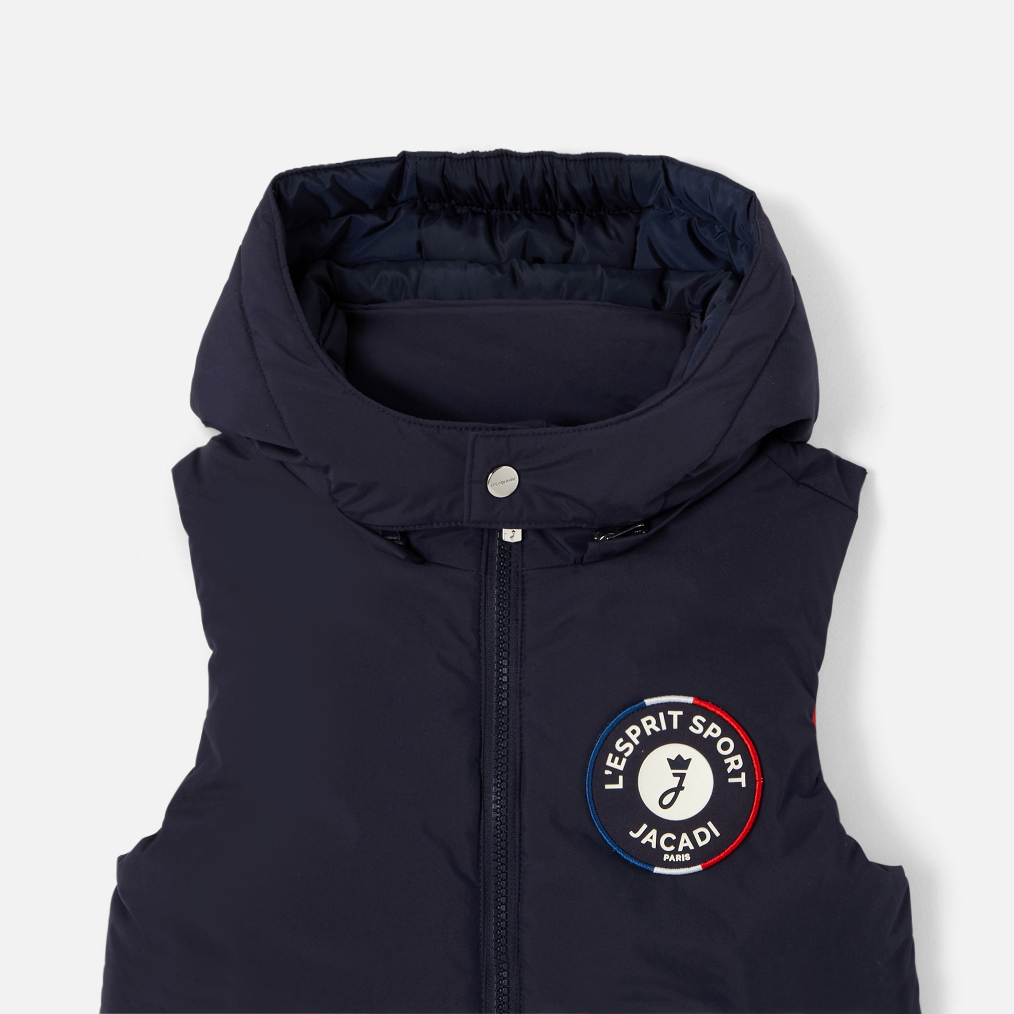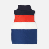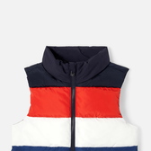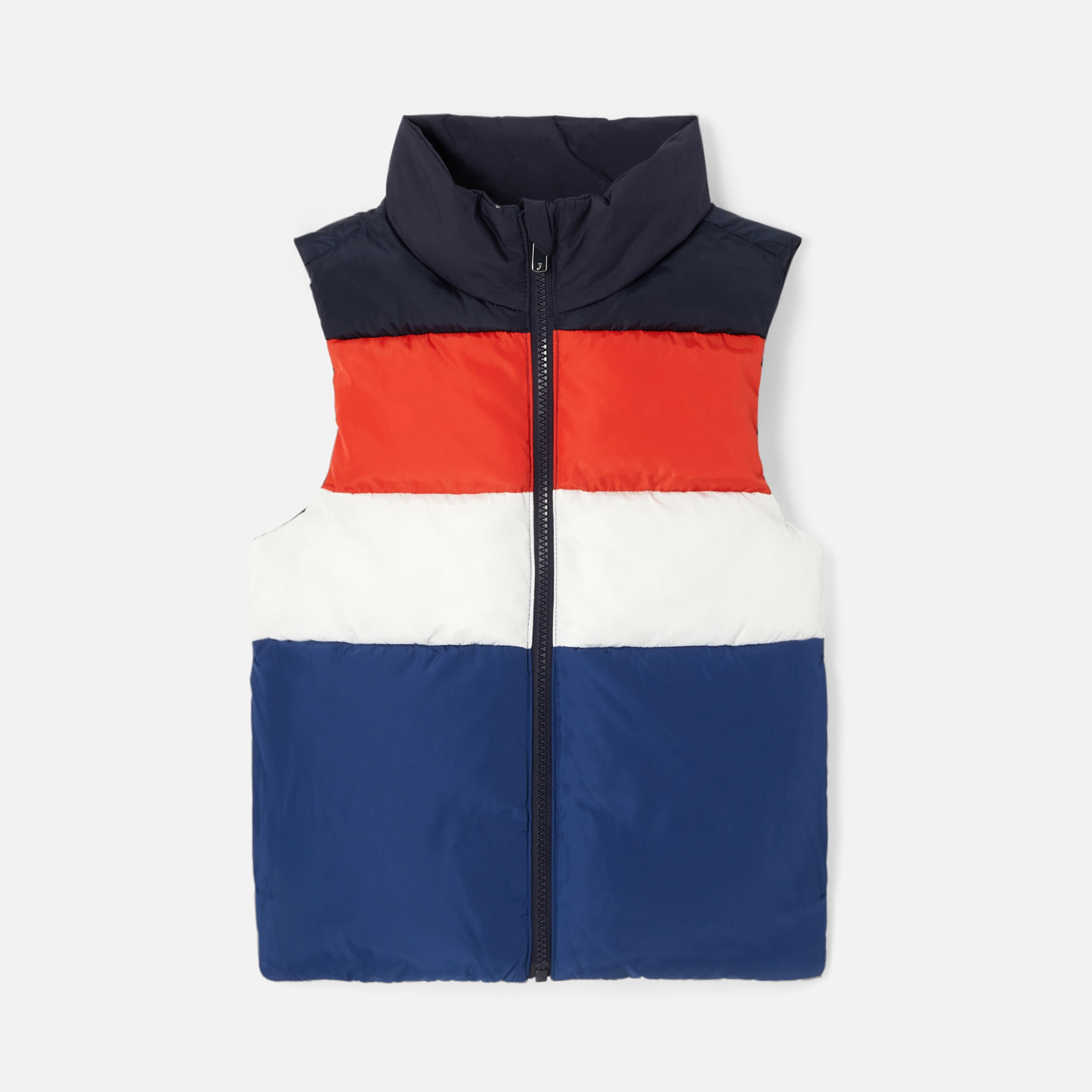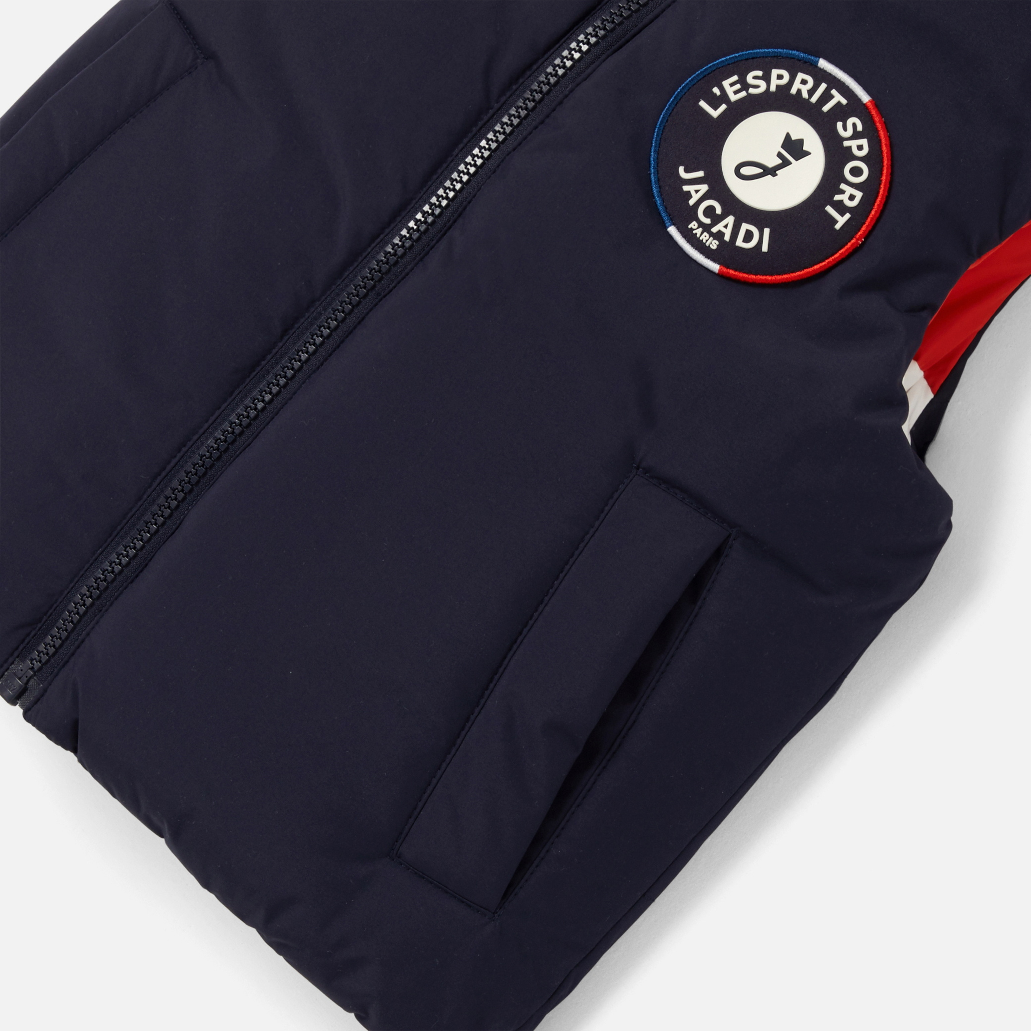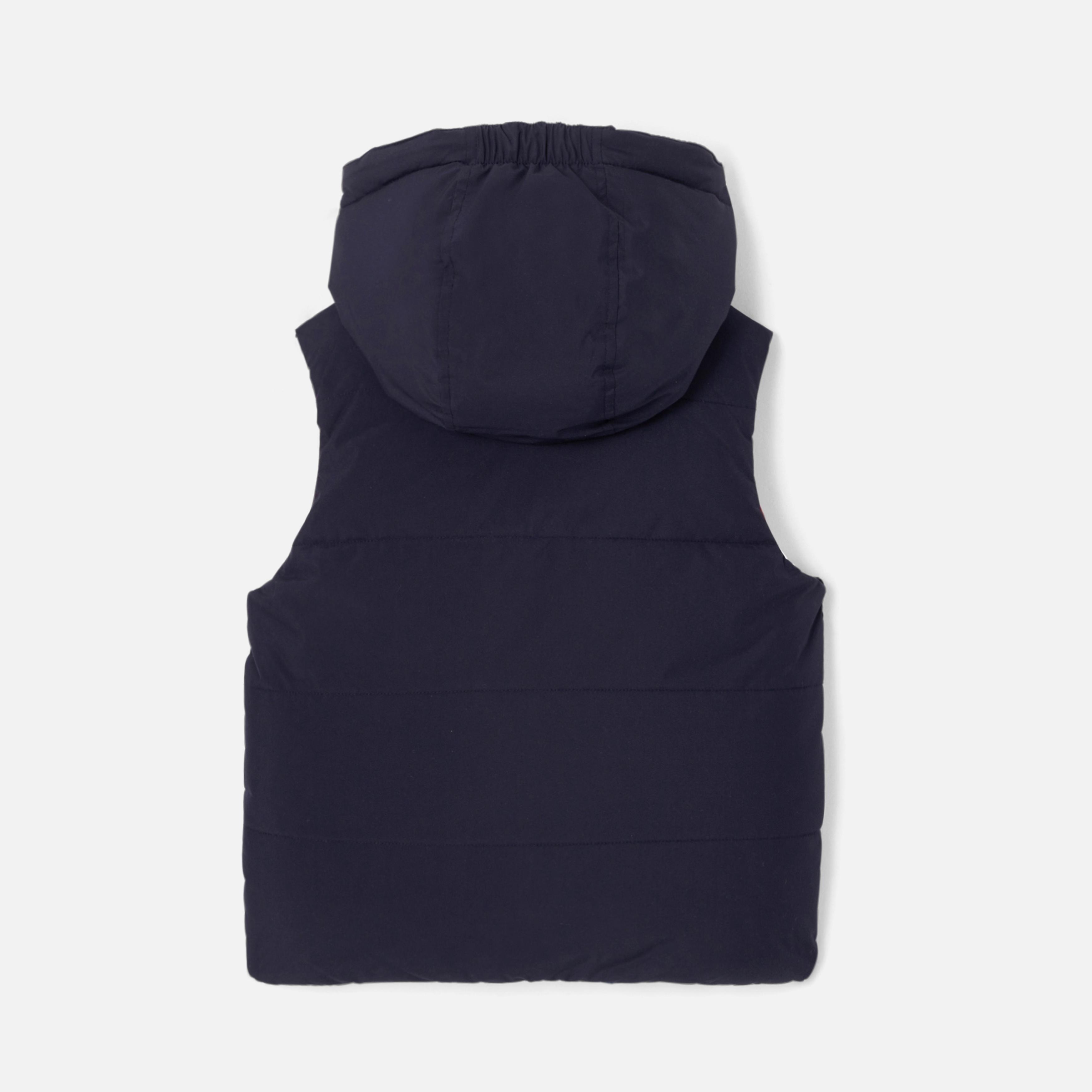 Per un outfit quotidiano sporty-chic e urban, gli stilisti hanno creato questo incantevole piumino bambino. Pratico e ingegnoso grazie alla sua funzione reversibile, è disponibile in nylon idrorepellente, un materiale molto resistente, e imbottito in poliestere riciclato. Arricchito da un cappuccio staccabile e dotato di un collo con bordo a coste, i bambini potranno indossarlo dal lato in tinta unita o da quello tricolore, sopra una felpa, per un look city.