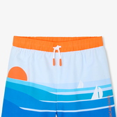 Abbelliti da linee grafiche che disegnano un tramonto su un fondo blu oceano, i pantaloncini da bagno di questa stagione offrono un tuffo nel cuore di un universo estivo e rilassante. Dotato un elastico in vita a contrasto da annodare, questo modello accompagnerà i bambini per splendide nuotate.