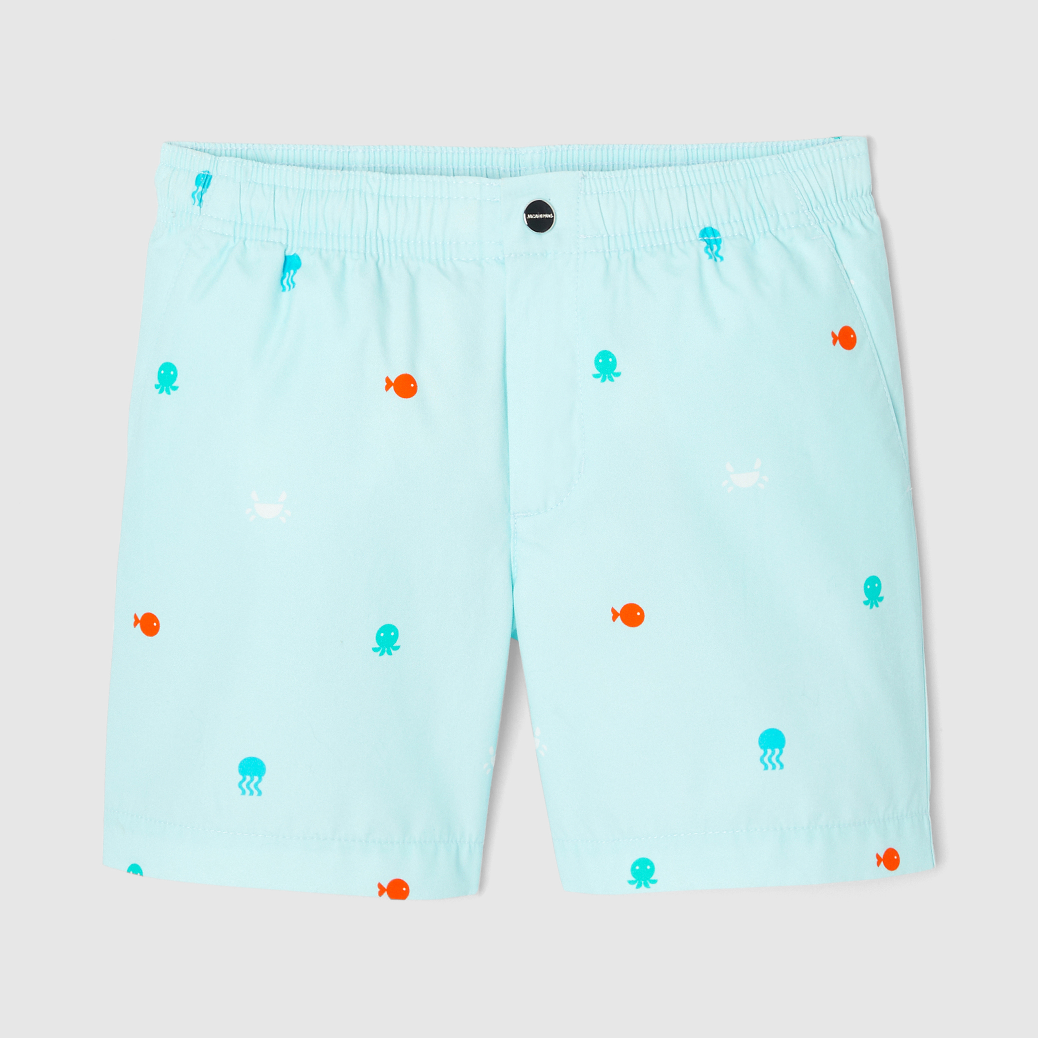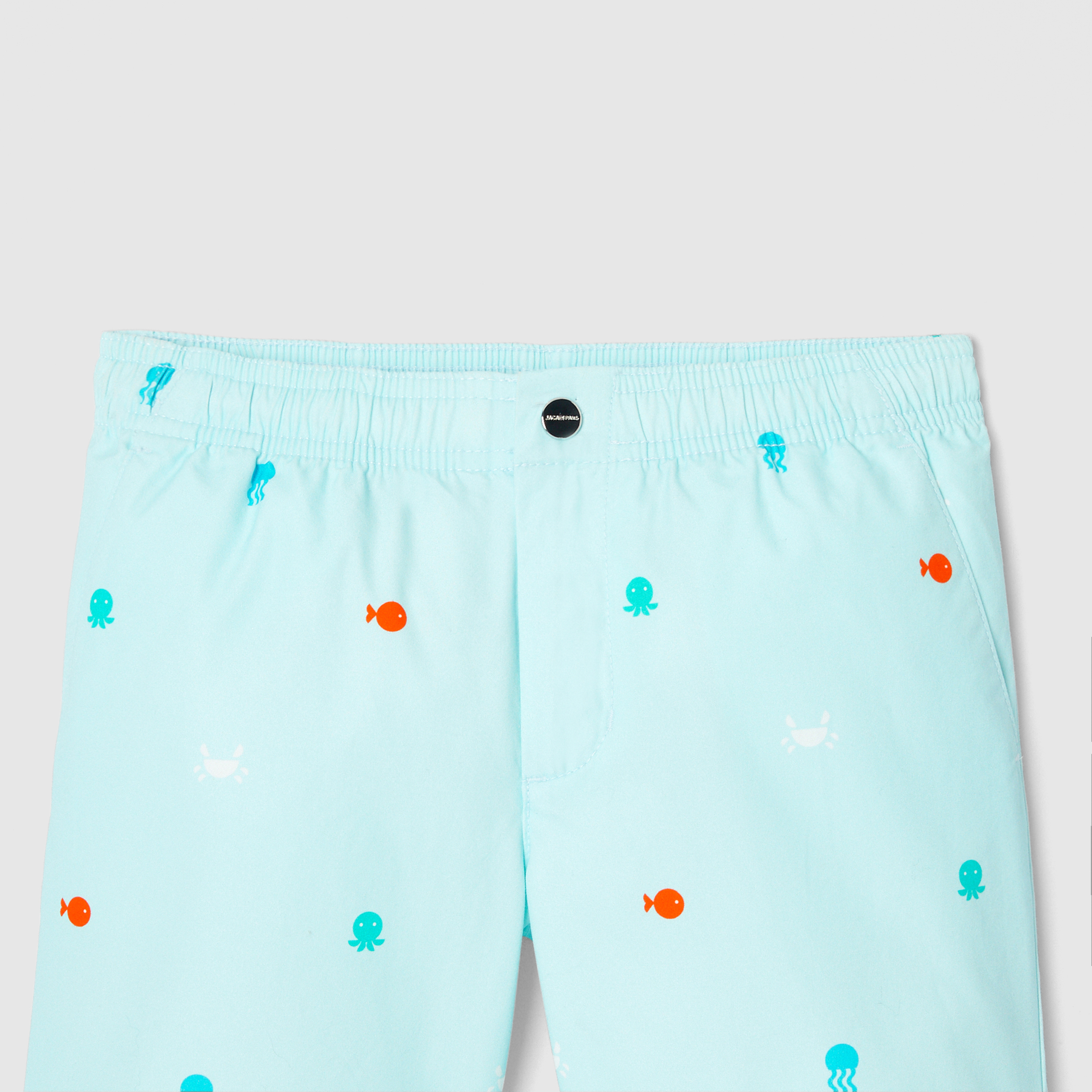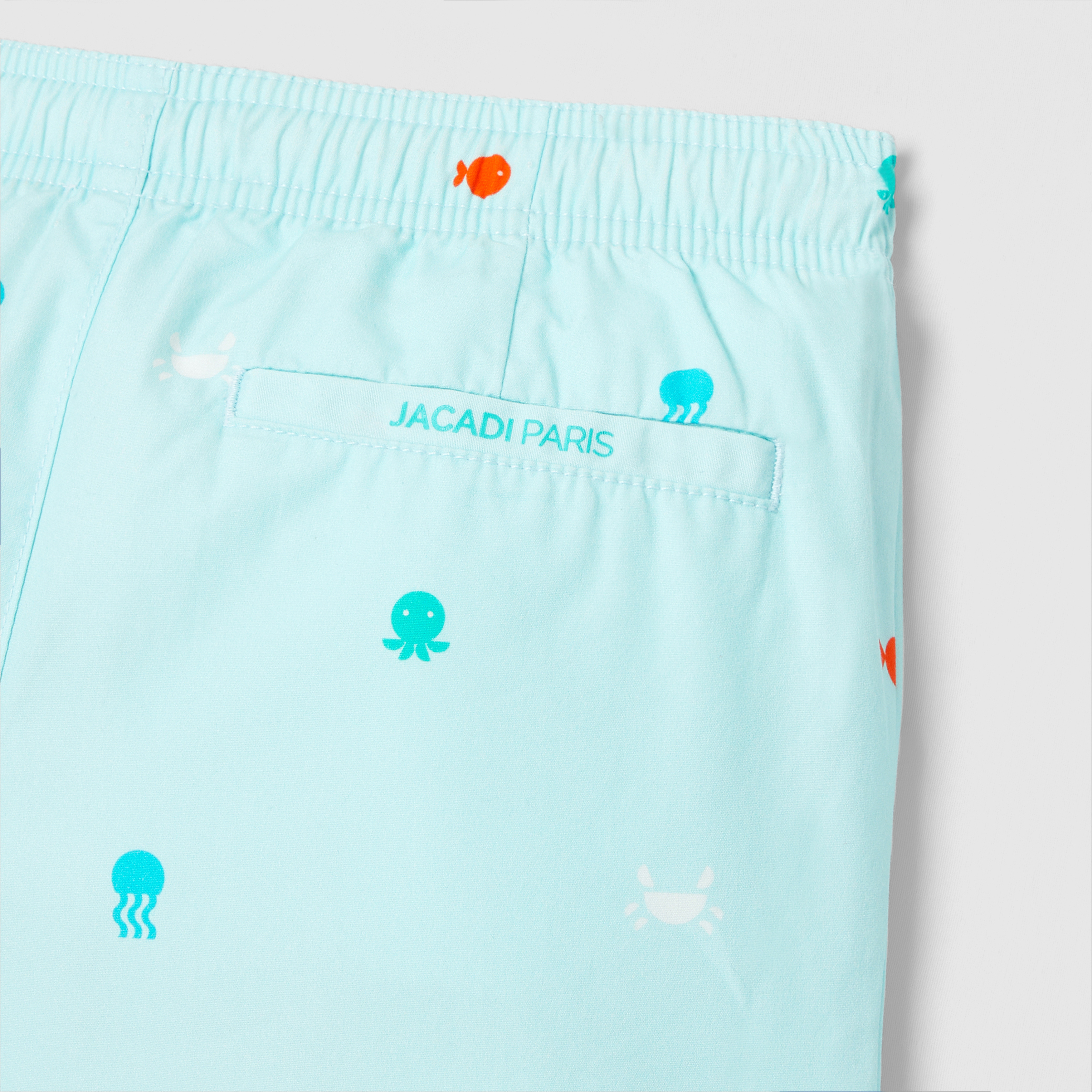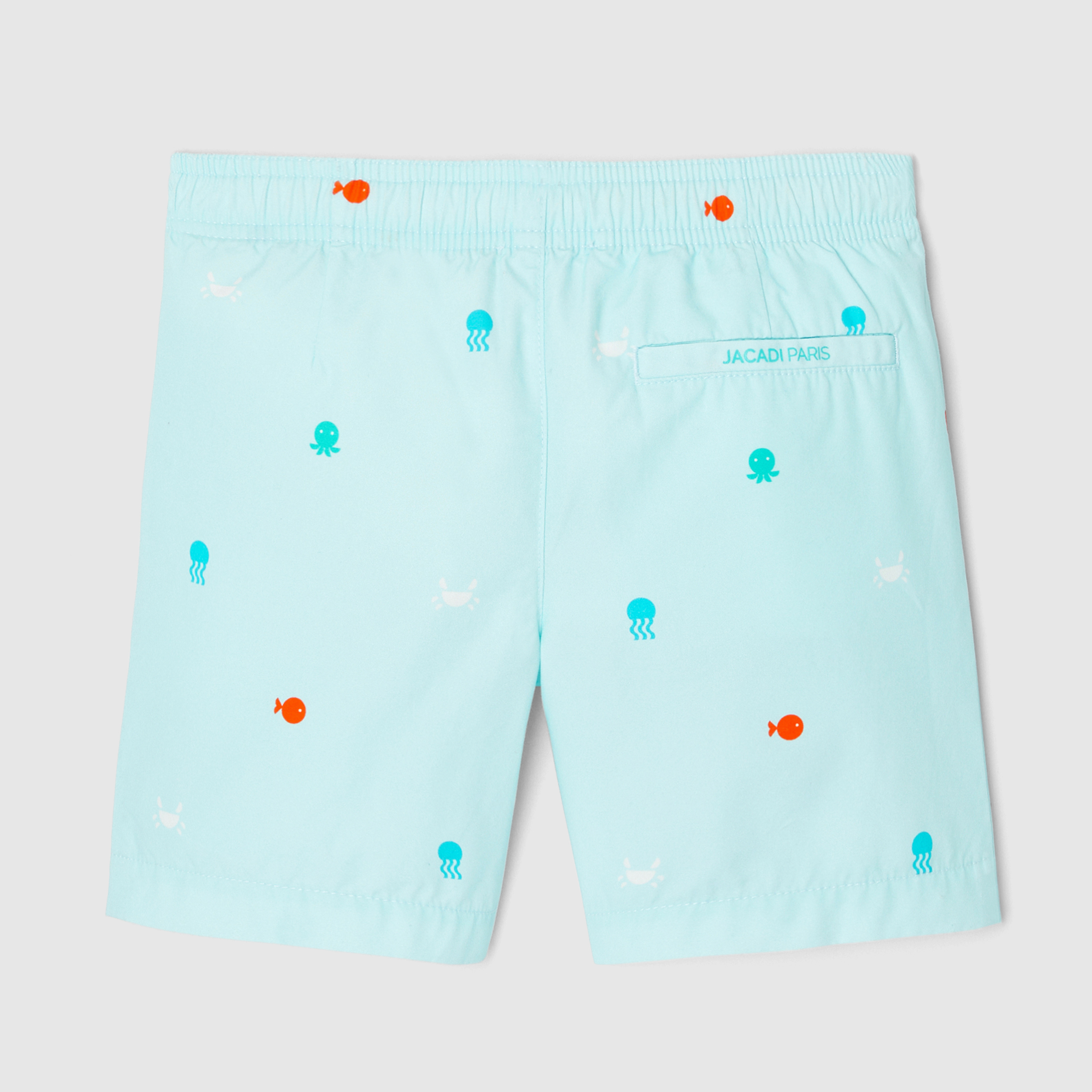 Pesci, granchi e piccole piovre dinamizzano i bermuda bambino di questa stagione. In twill di cotone biologico, sono dotati di tasche slack e si chiudono con zip e bottone.