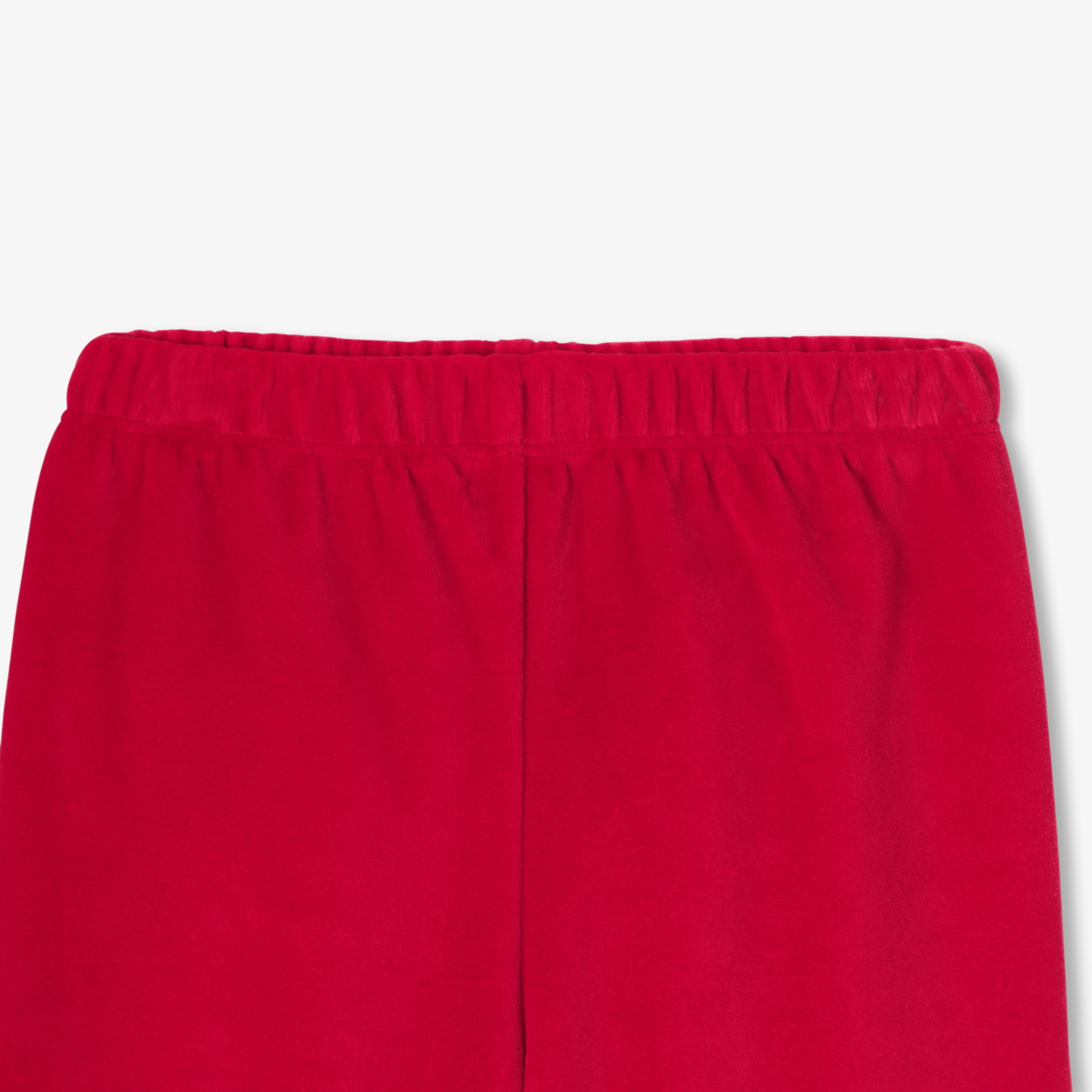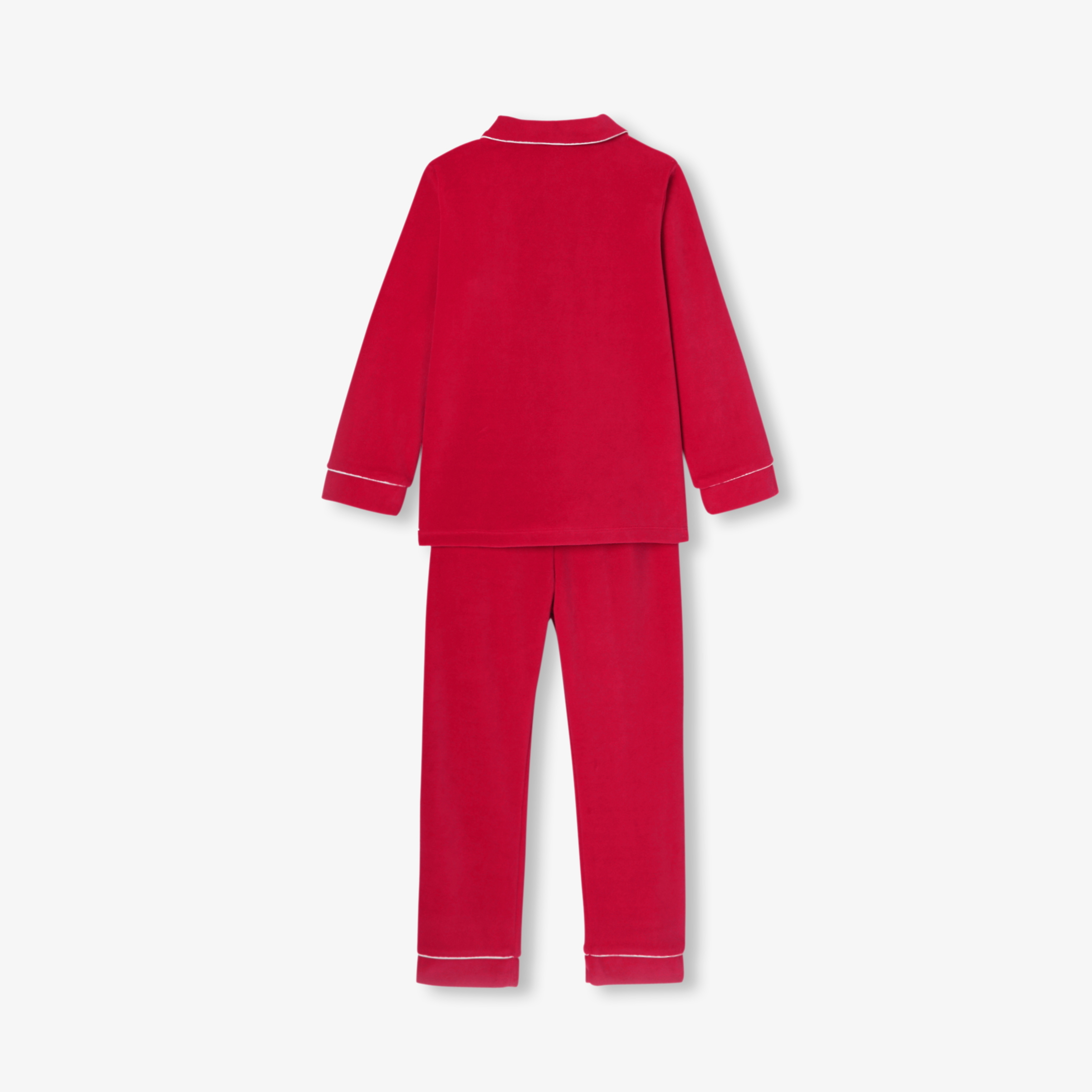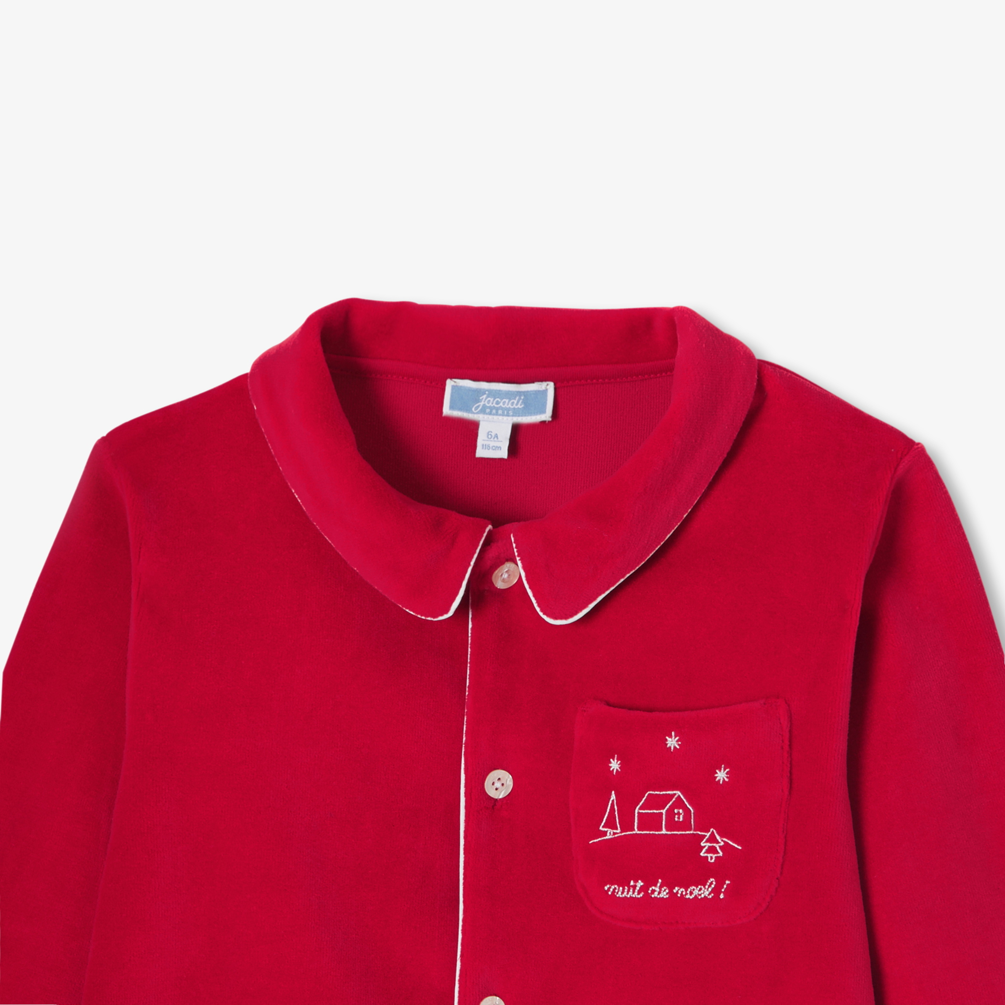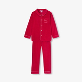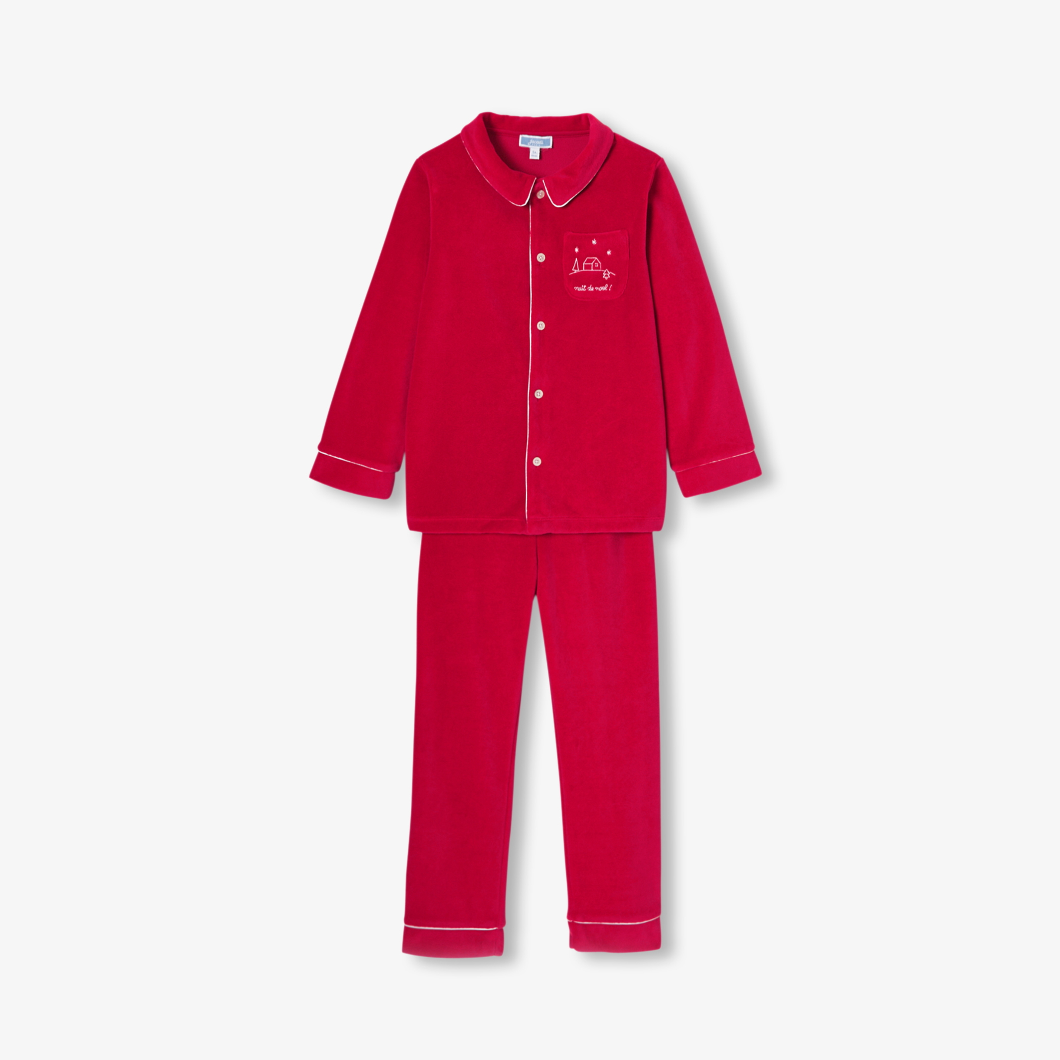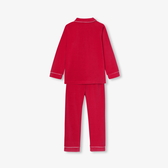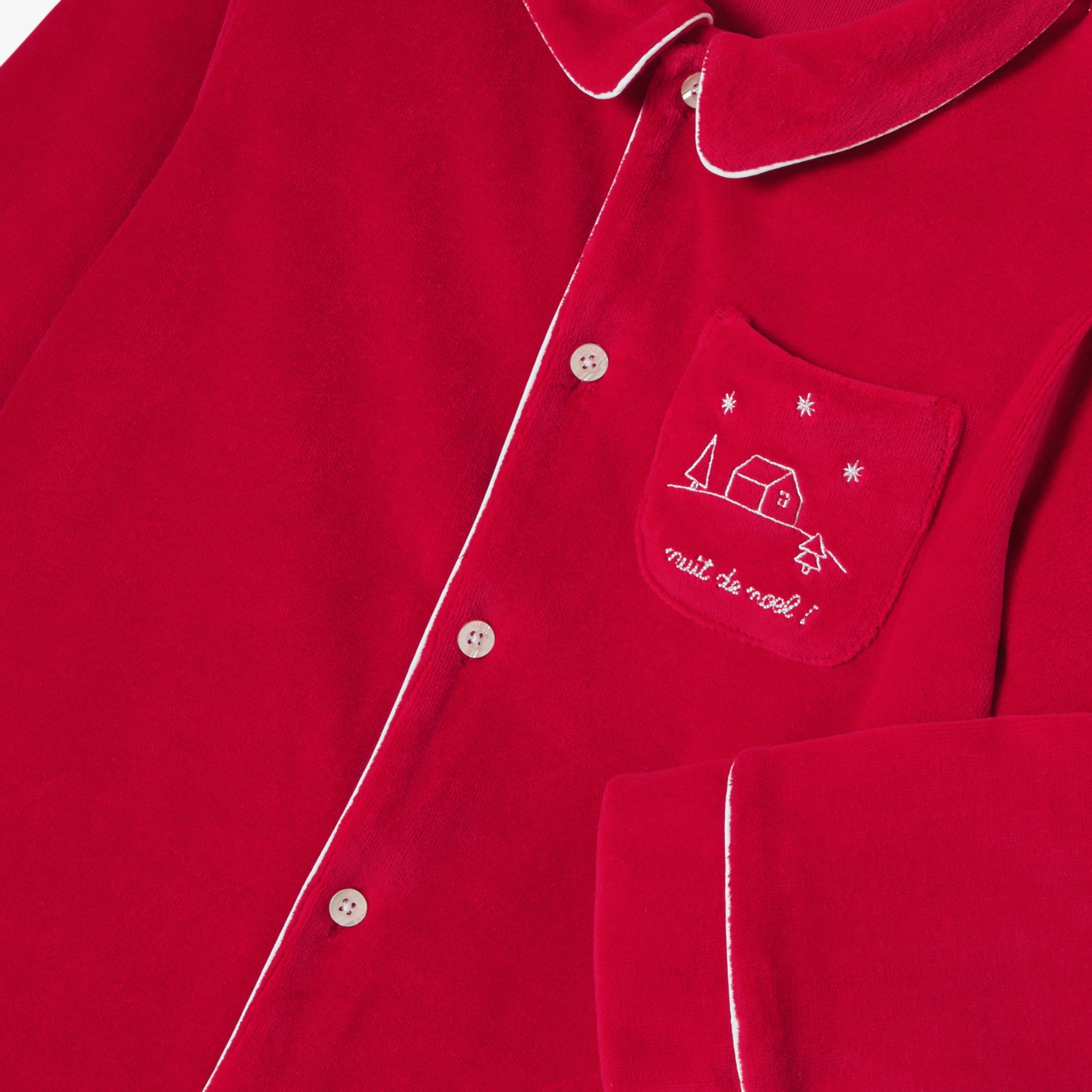 L'atmosfera natalizia conquista il guardaroba notte dei bambini con questo elegante pigiama. In ciniglia rossa con bordi bianchi per un look che unisce eleganza e tradizione, è composto da una camicia a maniche lunghe con taschino ricamato e pantaloni con elastico in vita. Perfetto per aspettare il grande giorno, i bambini lo indosseranno la mattina di Natale per aprire i regali ai piedi dell'albero.