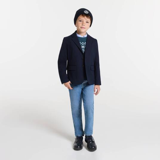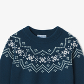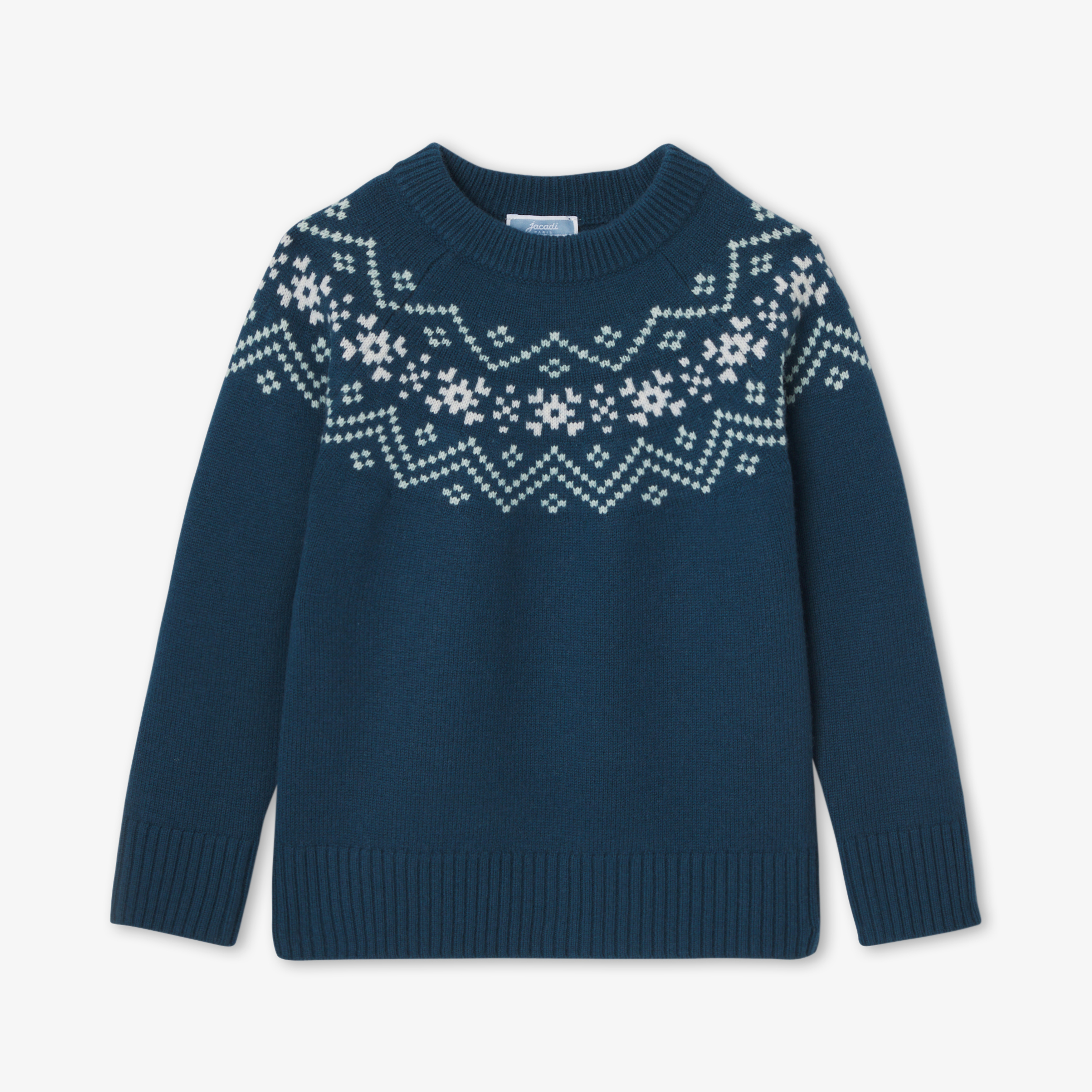 Jacadi rivisita il tradizionale maglione jacquard trasformandolo in un modello chic e confortevole. Realizzato in lana e cashmere e ravvivato da uno scollo jacquard con motivo a fiocchi stilizzati, indossato con pantaloni e un parka sarà perfetto per affrontare il freddo in città e sulle piste da sci.