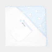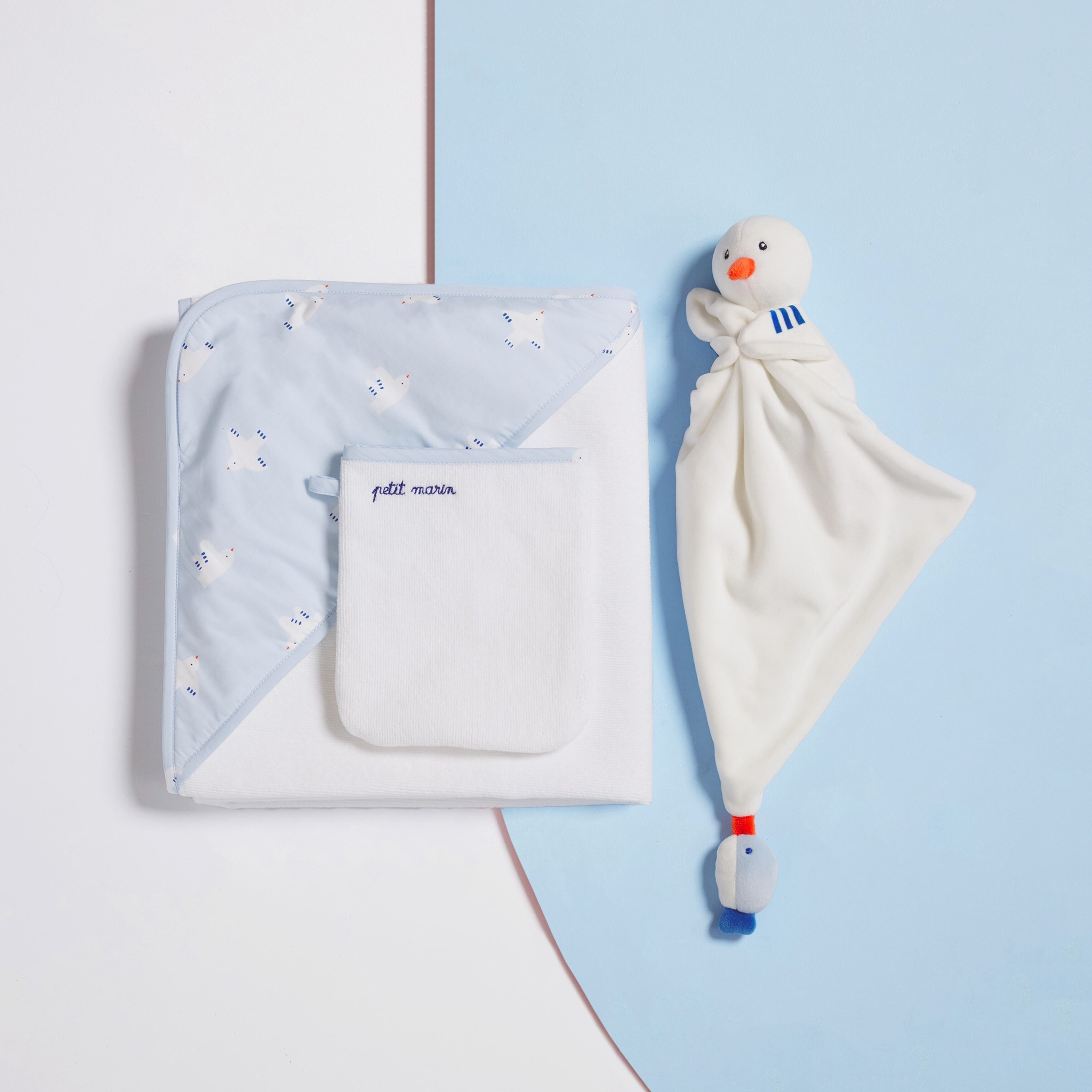 Dopo il bagnetto, avvolgi il tuo bimbo in questa morbida mantellina da bagno in spugna. Dotata di un cappuccio decorato con gabbiani, è coordinata a un guanto da bagno ricamato per lavare il neonato. Bella idea regalo per la nascita di un bambino, questa parure da bagno non può mancare nella valigia per il parto.