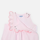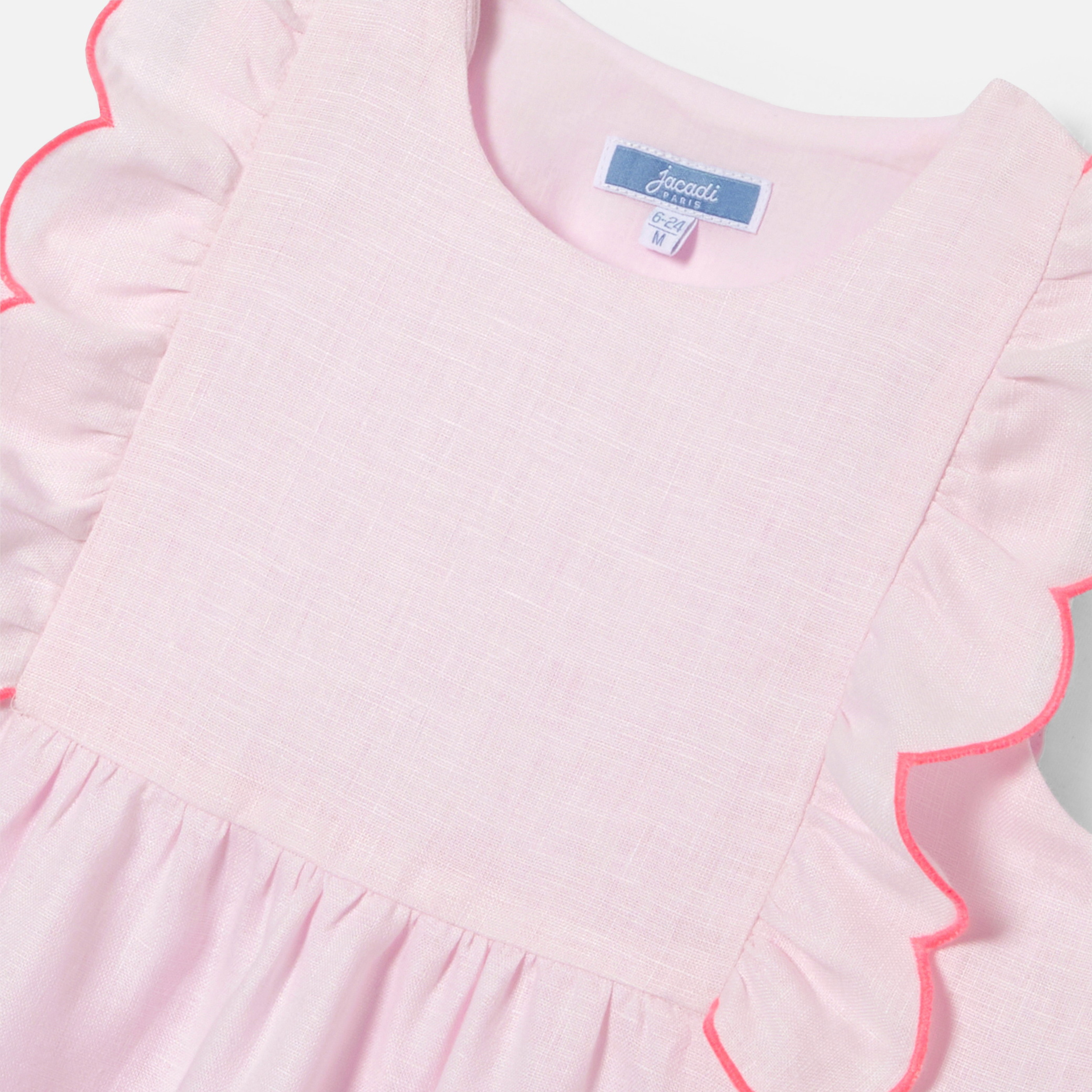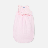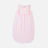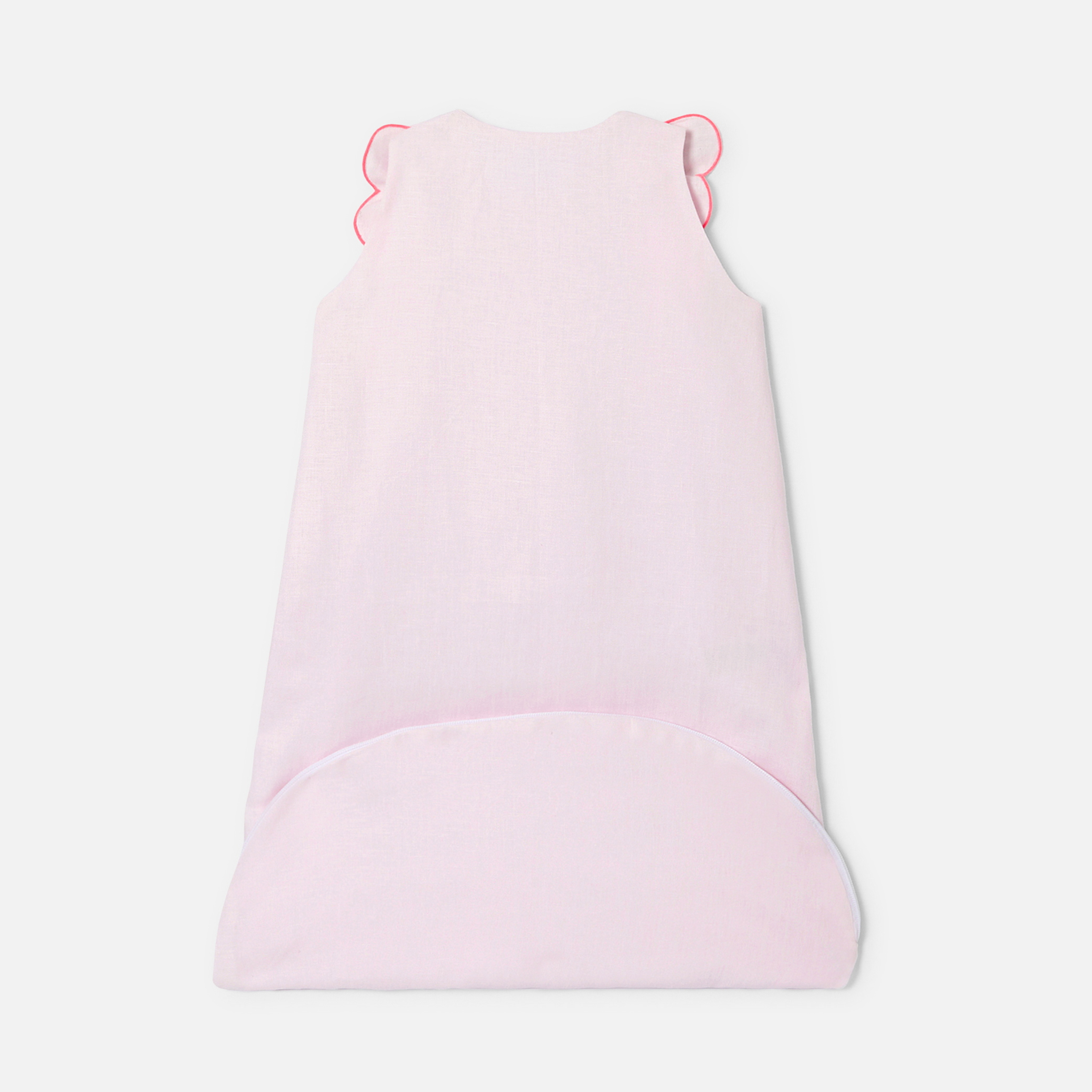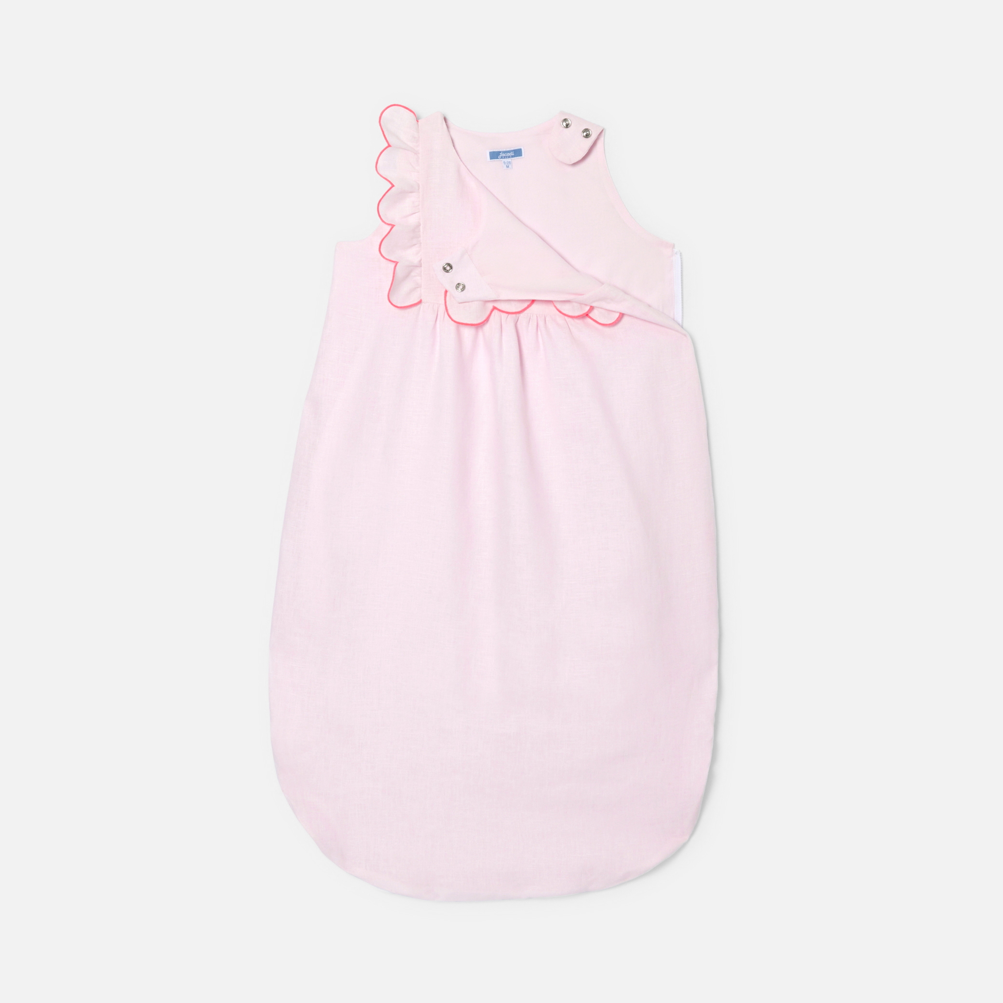 Notti estive all'insegna dell'eleganza con questo delizioso sacco nanna evolutivo. In lino morbido e leggero e foderato in voile di cotone tono su tono, i bei volant evidenziati da un punto bourdon fluo donano un tocco di modernità al modello. Pensato per accompagnare il neonato fino a 24 mesi, si regola facilmente grazie al pratico bottone automatico sul retro. Bella idea regalo nascita per la primavera-estate.