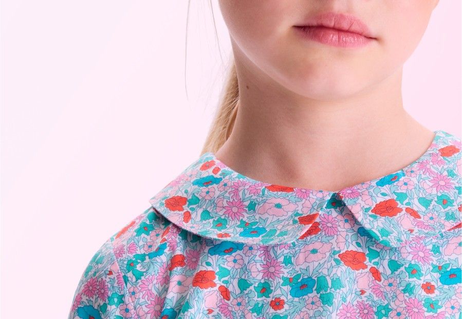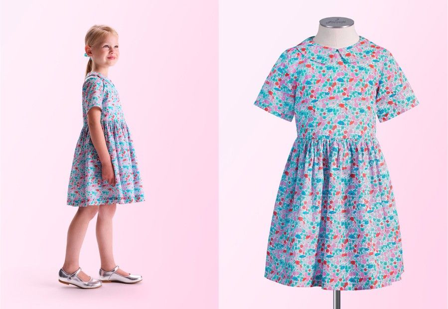 Disegno floreale stampato su un tessuto di cotone fine, a 12 colori, il motivo Liberty inventato da Sir Arthur Lasenby nel 1875 divenne un classico della moda per bambini negli anni Trenta. Veniva utilizzato per realizzare camicette, abiti e grembiuli.