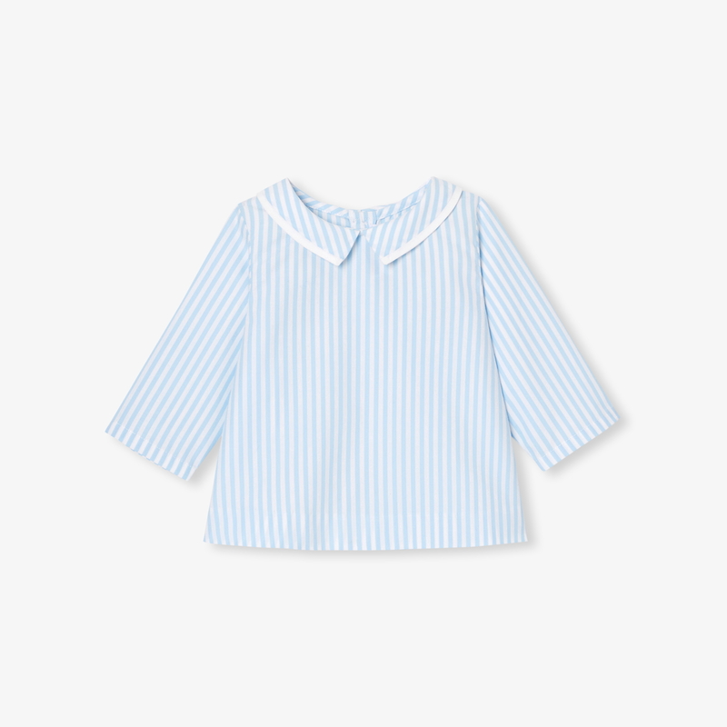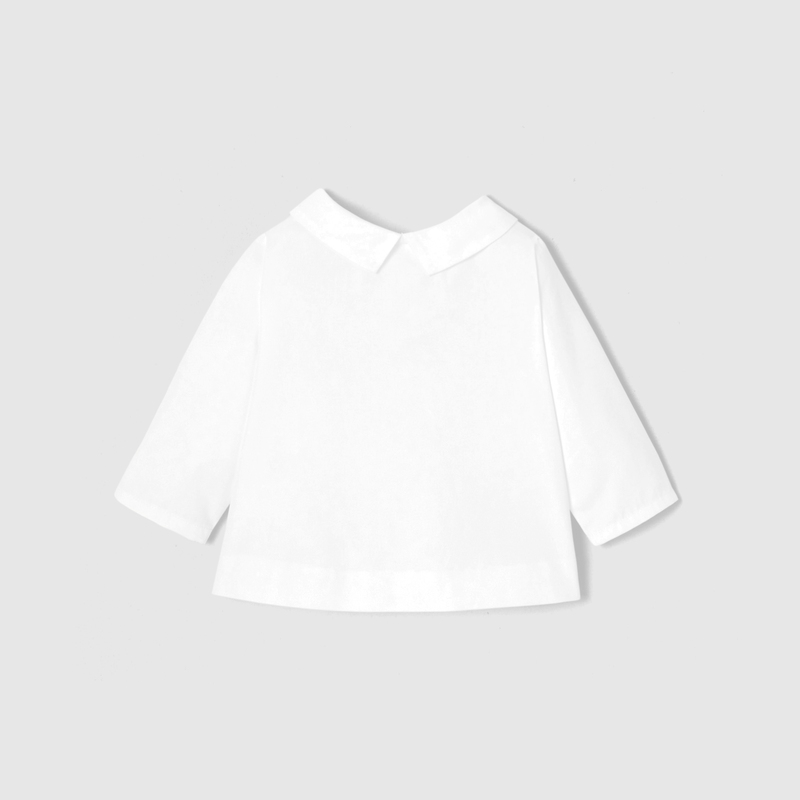 Colpo di fulmine per le camicette per neonati in cotone e seta, due materiali naturali con numerosi vantaggi. Mescolati insieme, danno origine a un tessuto sottile e leggero, ma resistente. Caldo e estremamente morbido al tatto, è anche un tessuto delicato e traspirante. Colletto a festone in popeline per le bambine, colletto Claudine per i bambini: tutto è nei dettagli, per un look sofisticato, senza esagerare.