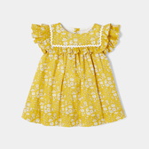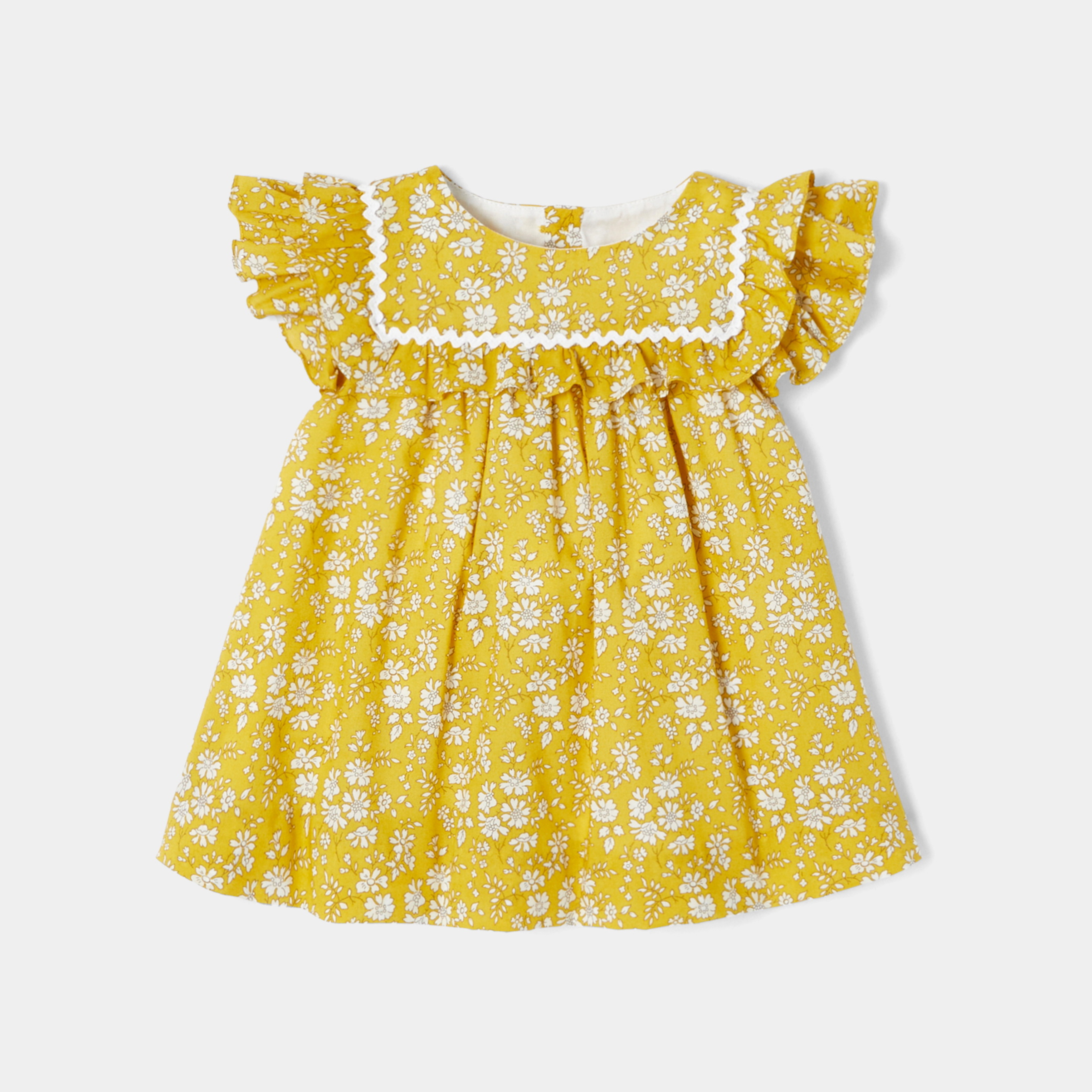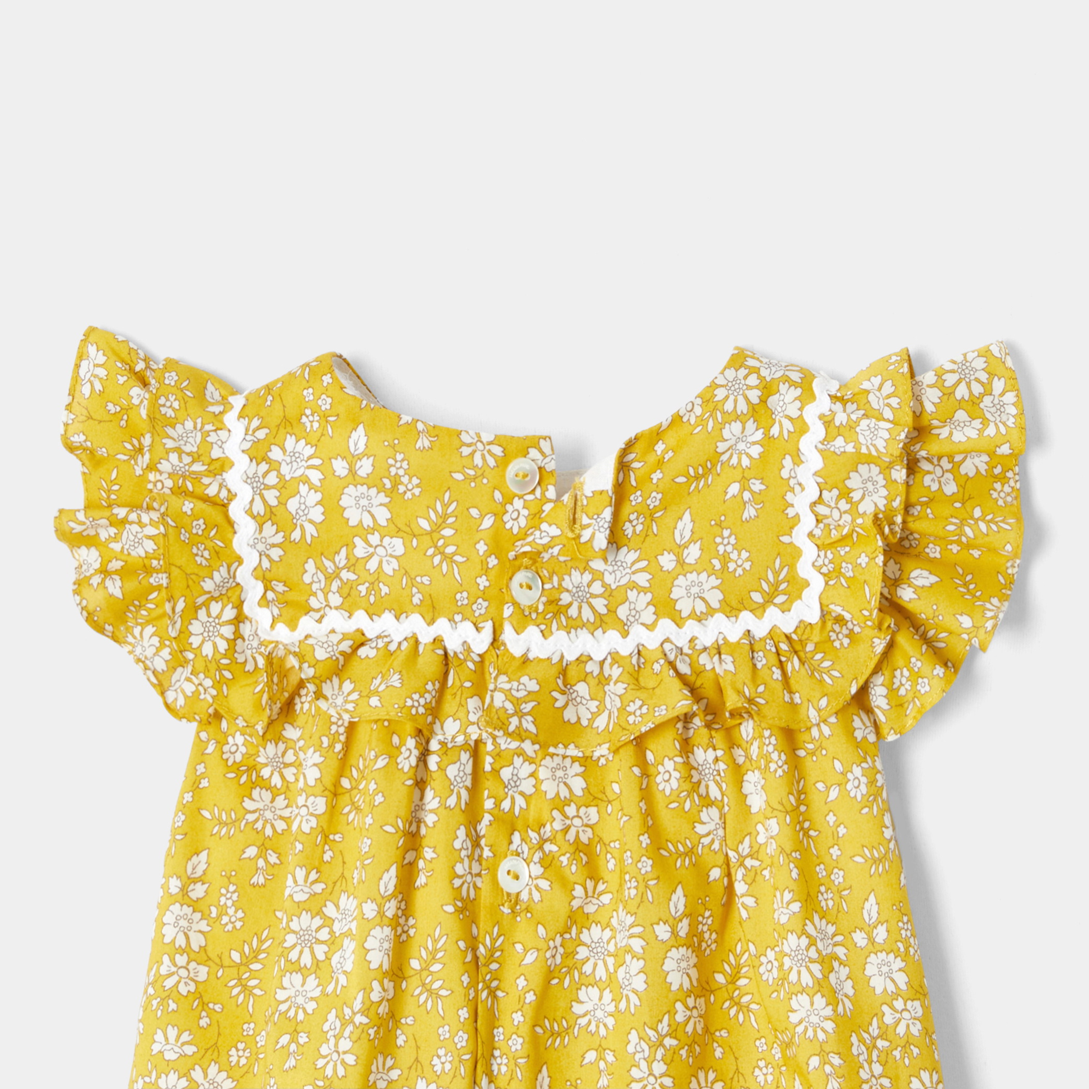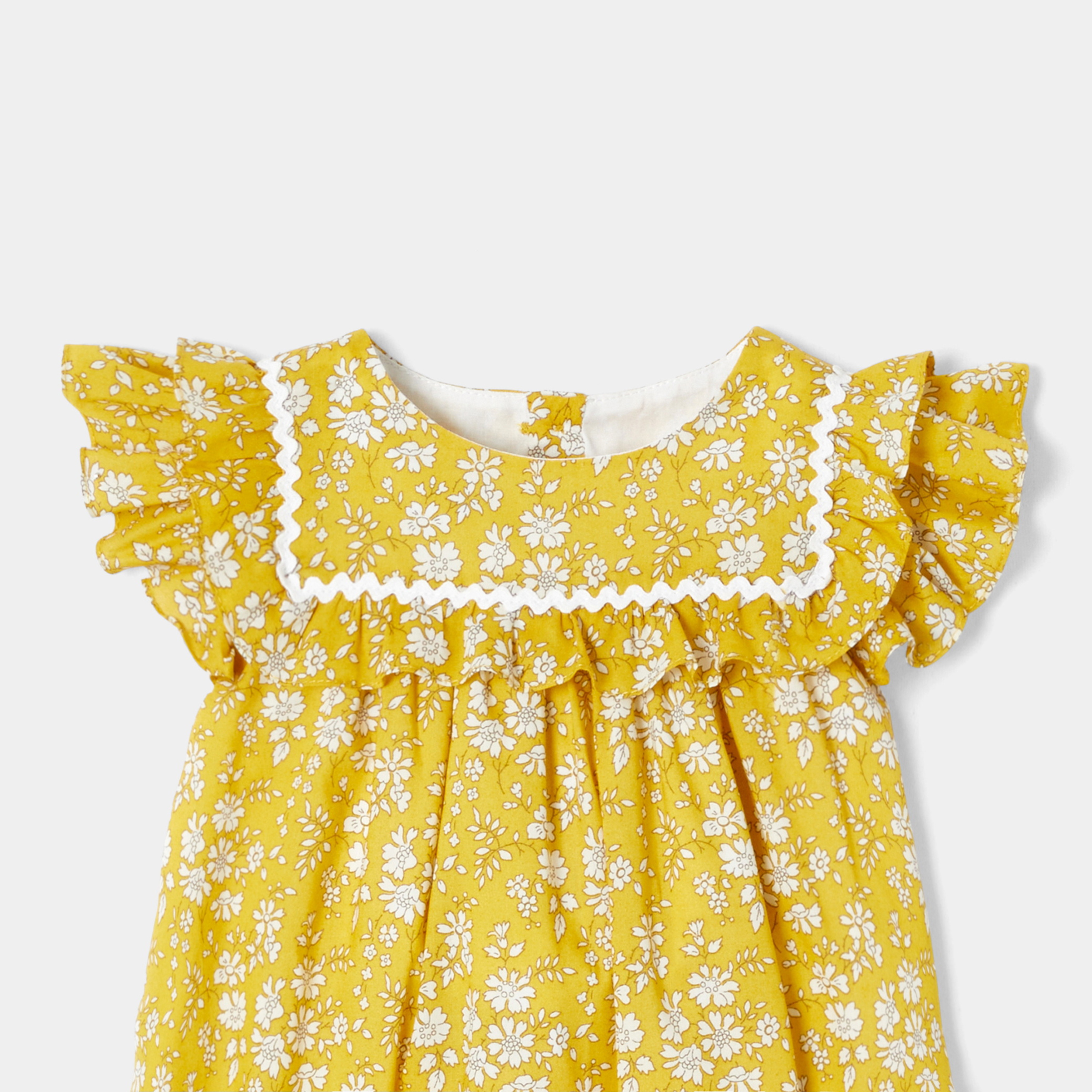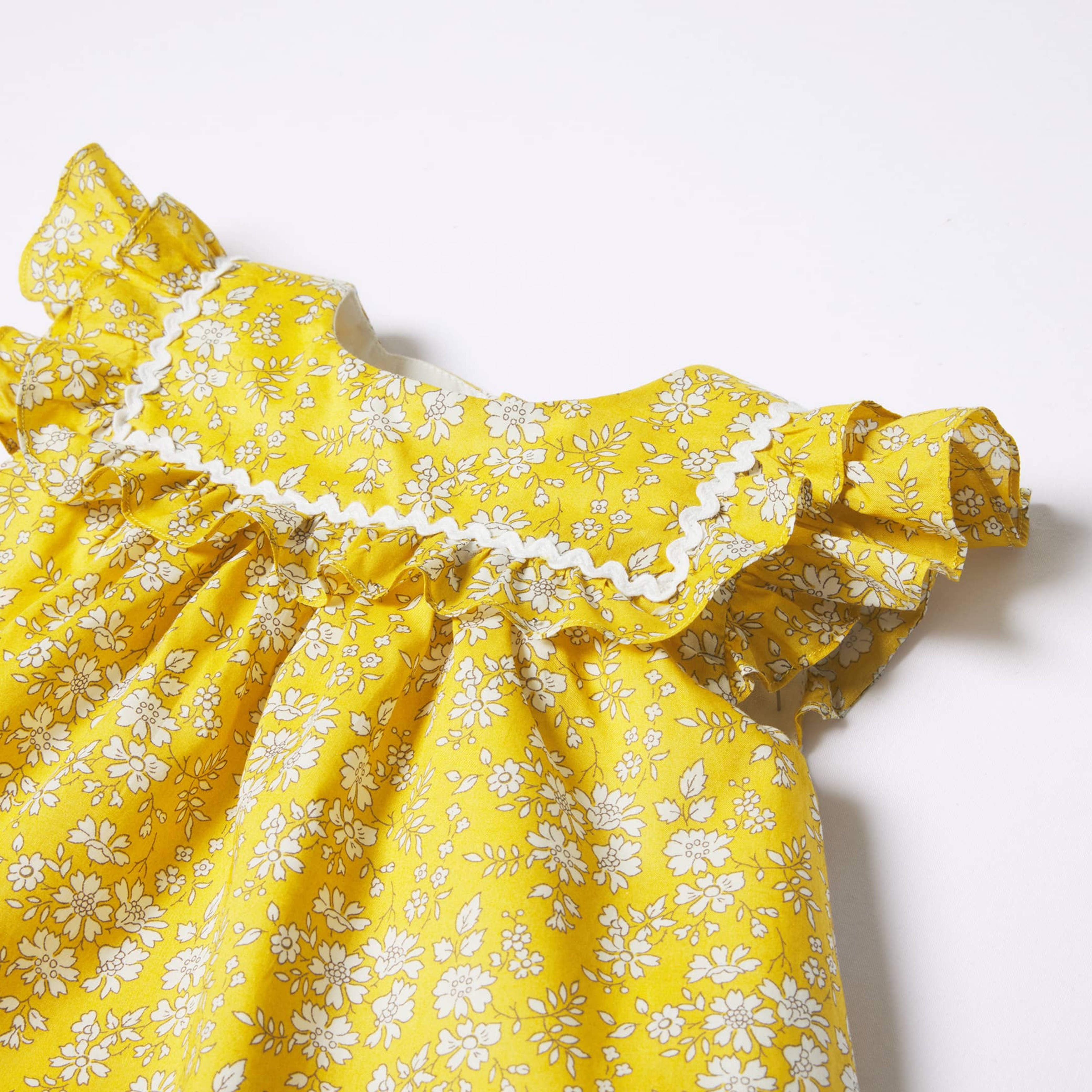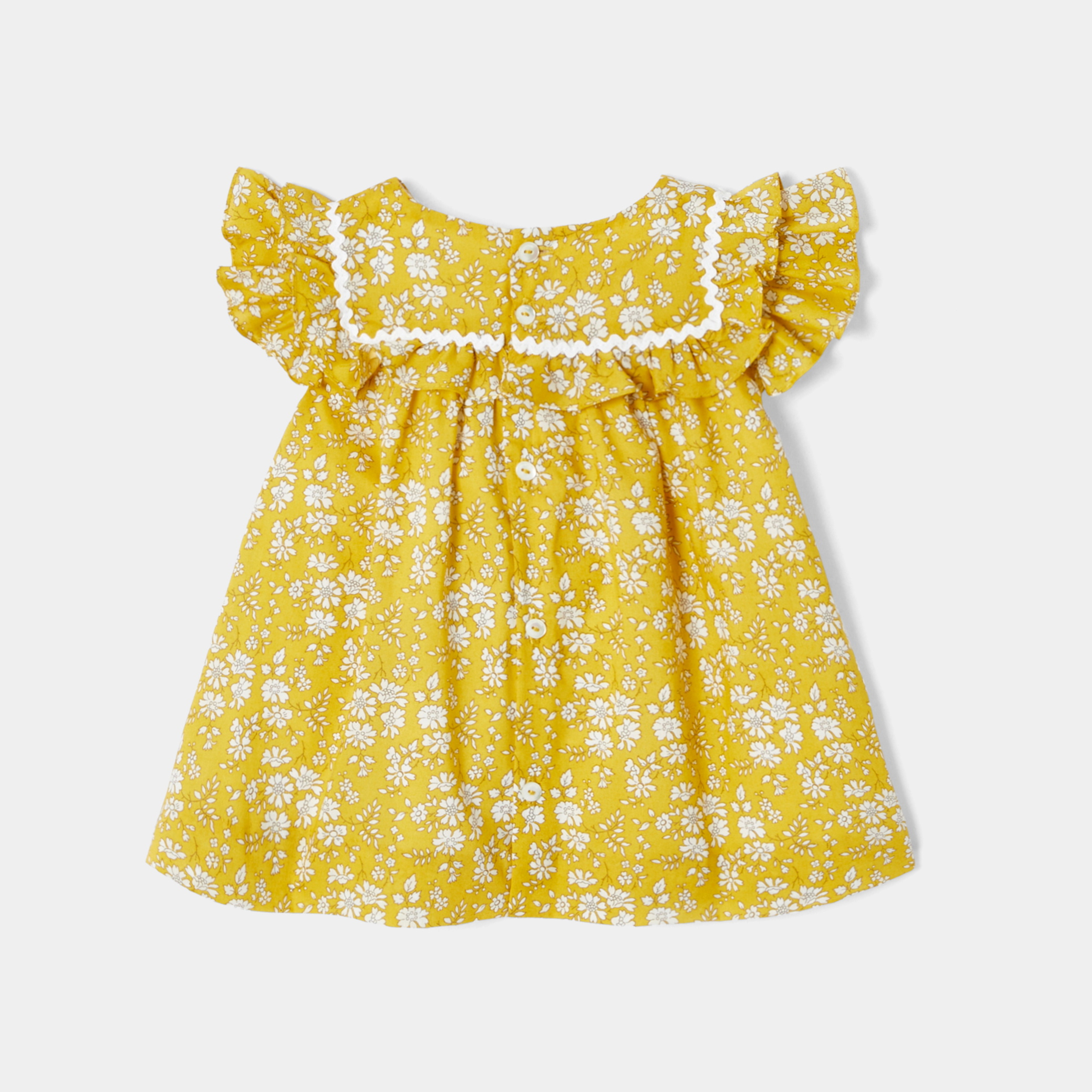 Un modello lavorato e il fascino di un tessuto Liberty per questo incantevole abito bimba. Ornato di uno scollo con volant e serpentine, questo modello foderato in popeline è dotato di una chiusura sul retro con bottoni in madreperla naturale. Abbinalo alle mutandine coordinate per l'estate.
