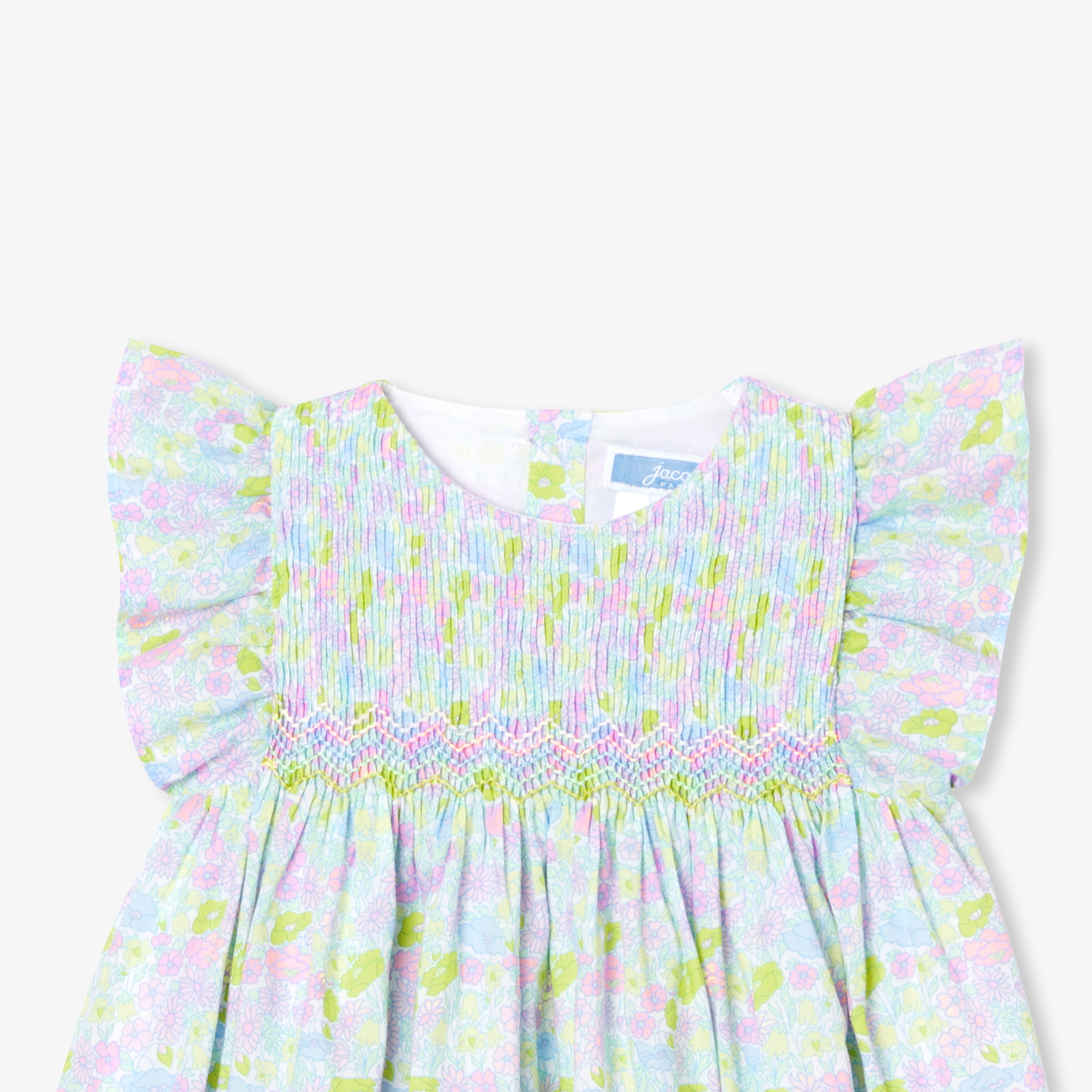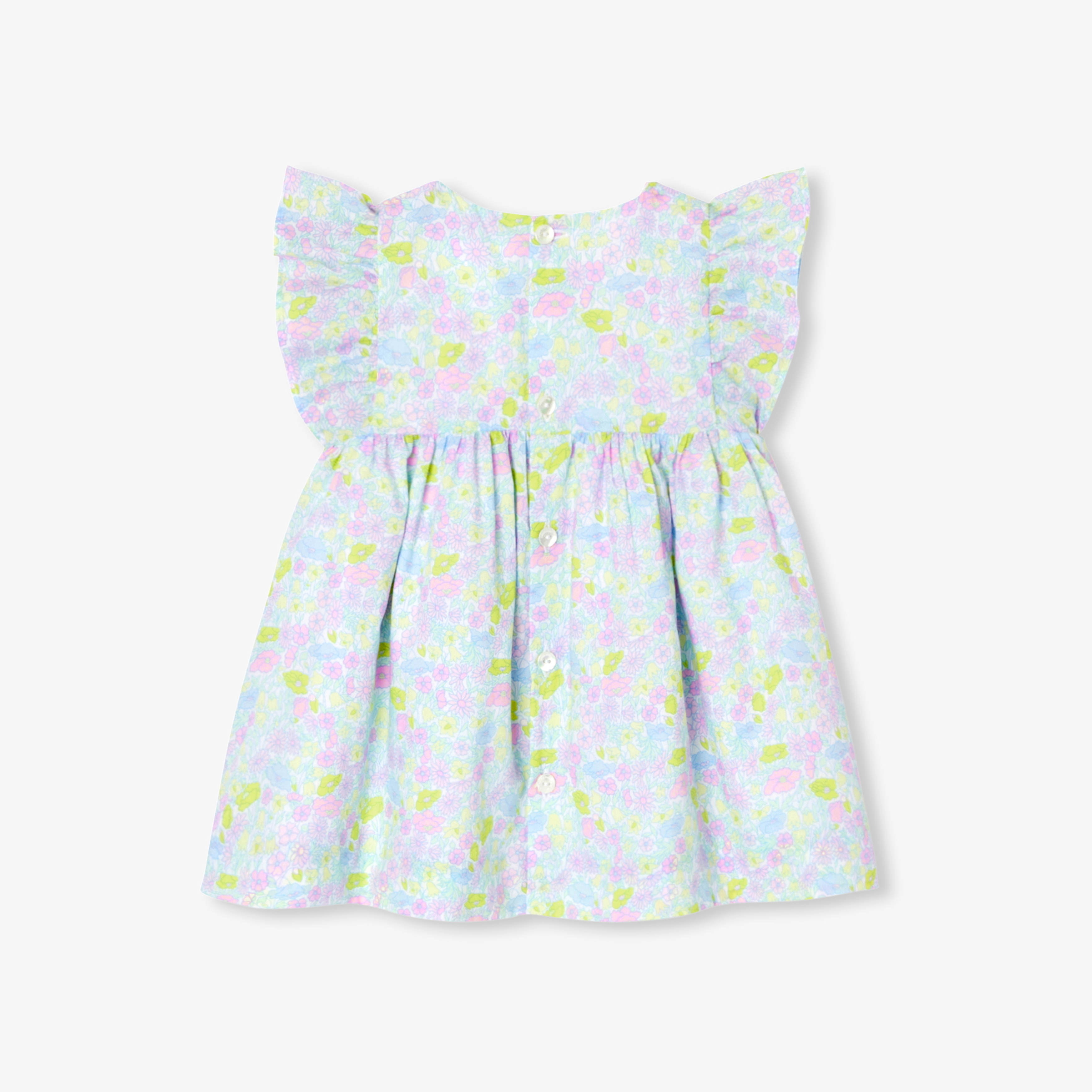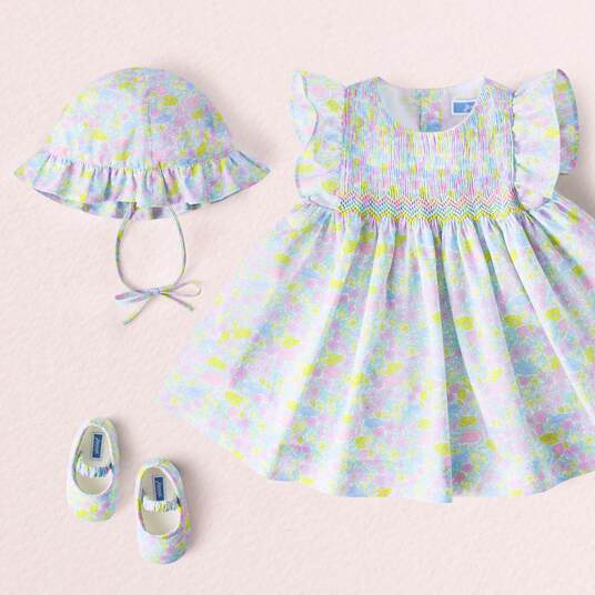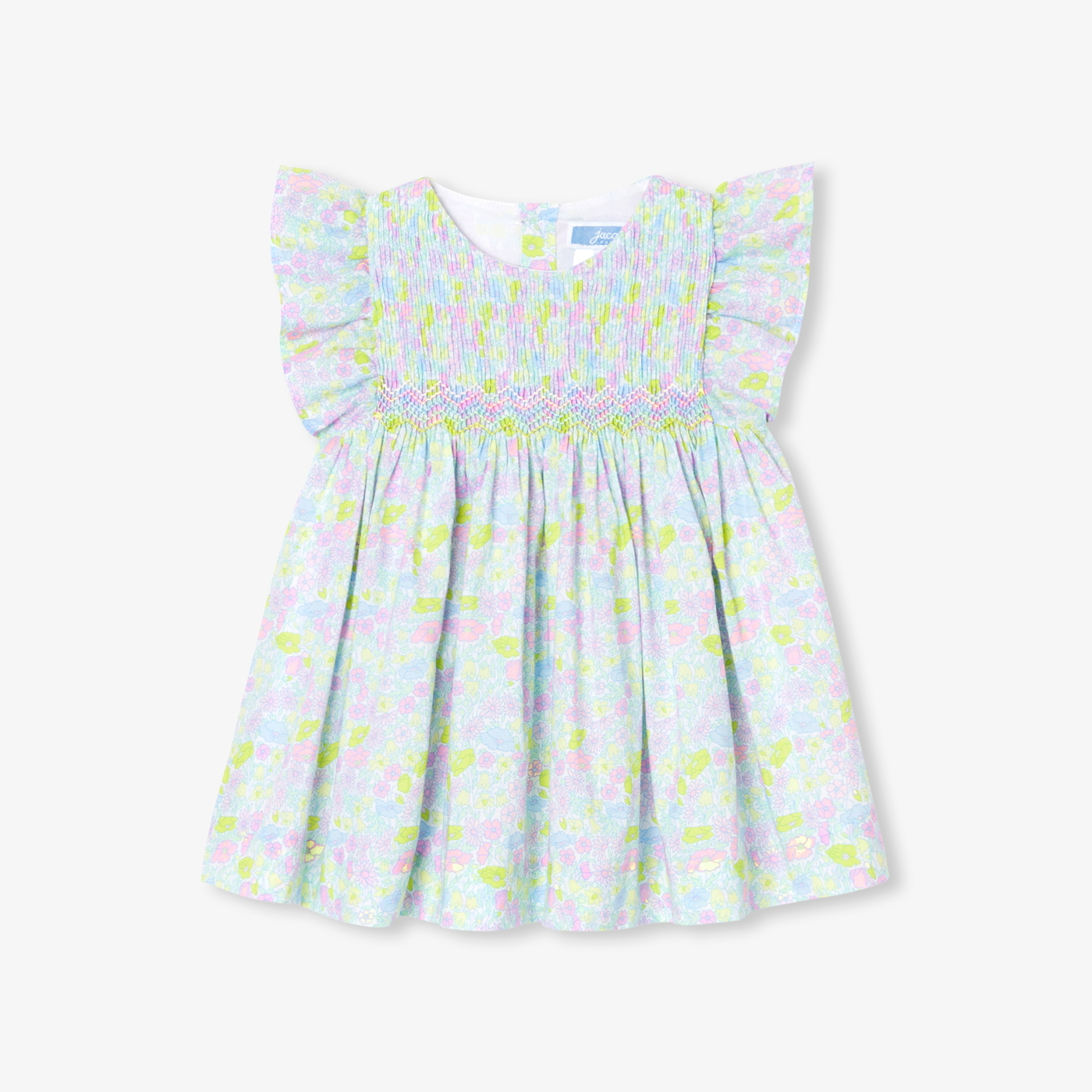 Con il fascino di un tessuto Liberty dalle tonalità tenui e la modernità di un taglio lavorato, quest'abito da bambina ha un taglio contemporaneo con il giromanica con volant e la pettorina in punto smock. Indossalo con sandali e cappello e gli troverai sicuramente un posto nel guardaroba e nella vostra valigia per le vacanze.