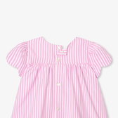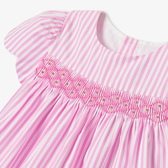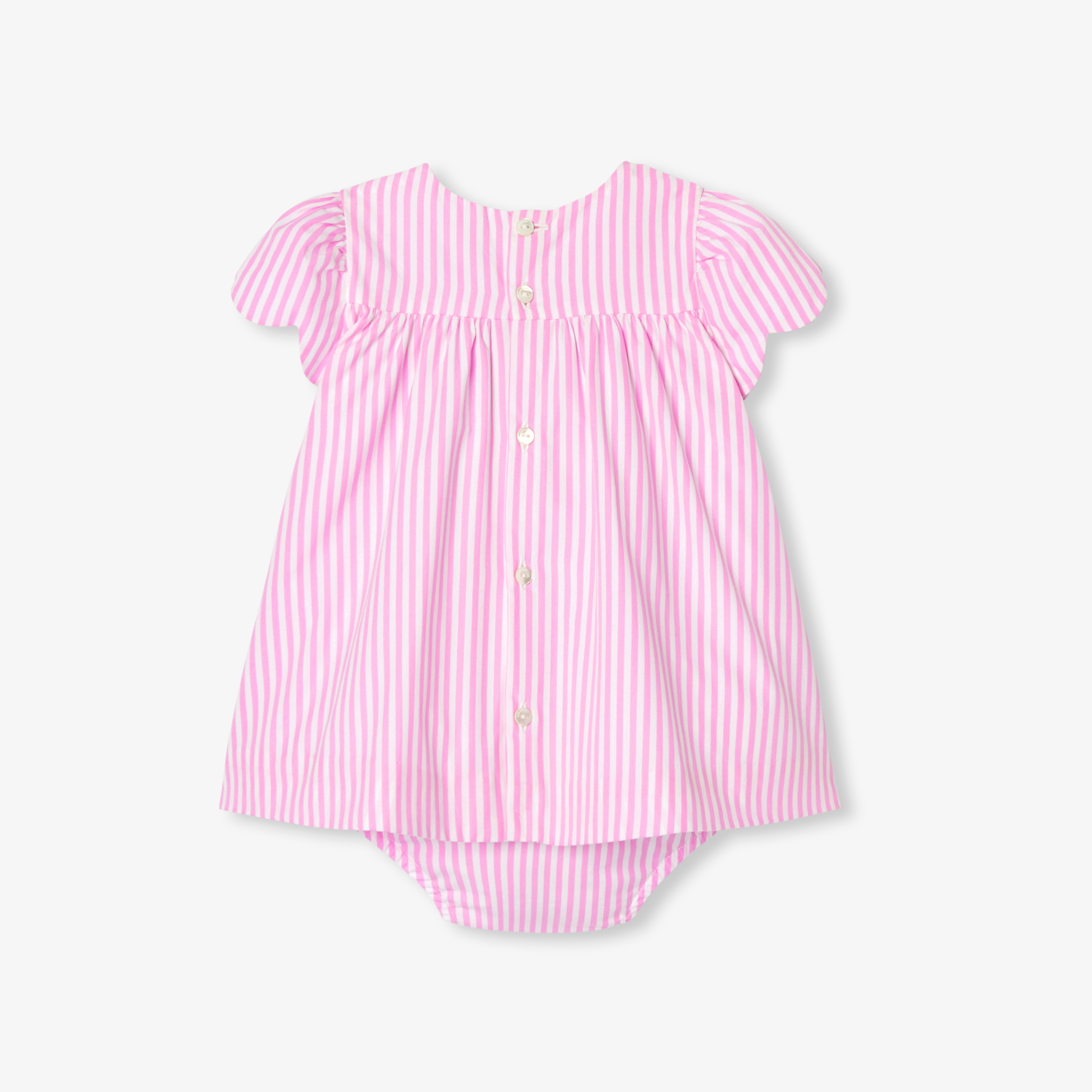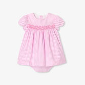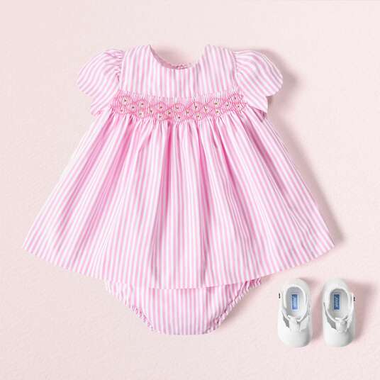 Questo vestito da neonata conferisce un aspetto raffinato e autentico. In popeline di cotone a righe, l'elegante punto smock e i ricami fatti a mano sulla scollatura e sulle maniche a palloncino valorizzano questo capo, perfetto per l'inizio della stagione. Foderato in voile di cotone e facile da indossare grazie alla chiusura a bottoni dietro, unisce il savoir-faire al comfort quotidiano.
