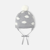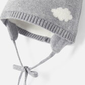 In morbido cotone biologico e lana sostenibile, il berretto bimbo di questa stagione punta sull'originalità di un adorabile motivo a nuvola. Grafico e poetico, pompon, paraorecchie e laccetti da annodare completano questo berretto che proteggerà la testolina del neonato per andare al nido o a passeggio.