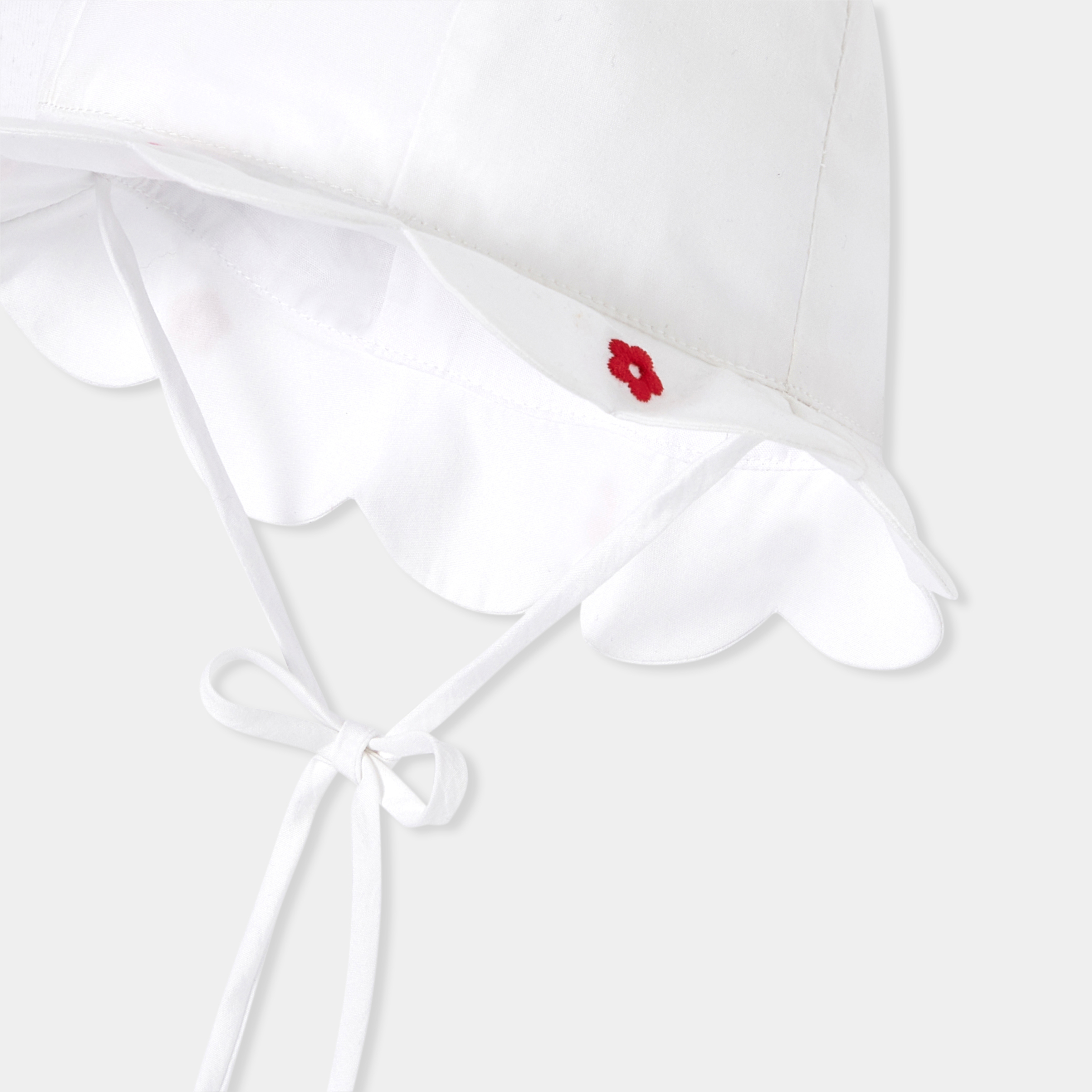 Realizzato in morbido e leggero popeline di cotone con graziosi fiori ricamati, questo delizioso cappello proteggerà la tua piccola dalla primavera alla fine dell'estate. Dotato di laccetti da annodare, si abbinerà a meraviglia ai capi della stessa collezione.
