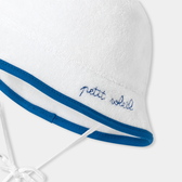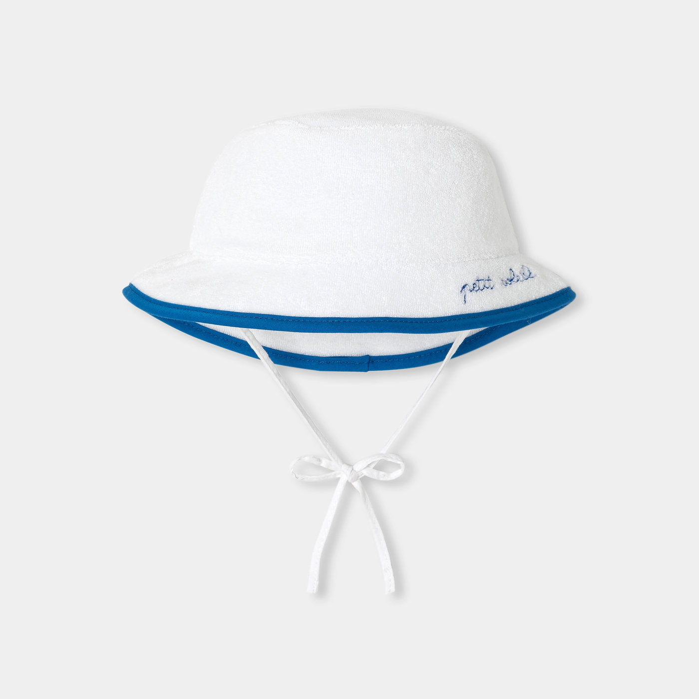 Questa stagione, il cappellino da pescatore neonato è realizzato in morbida e confortevole spugna. Valorizzato da un profilo blu e la scritta ricamata "petit soleil", questo must-have minimalista proteggerà la testa del bambino per tutta l'estate.