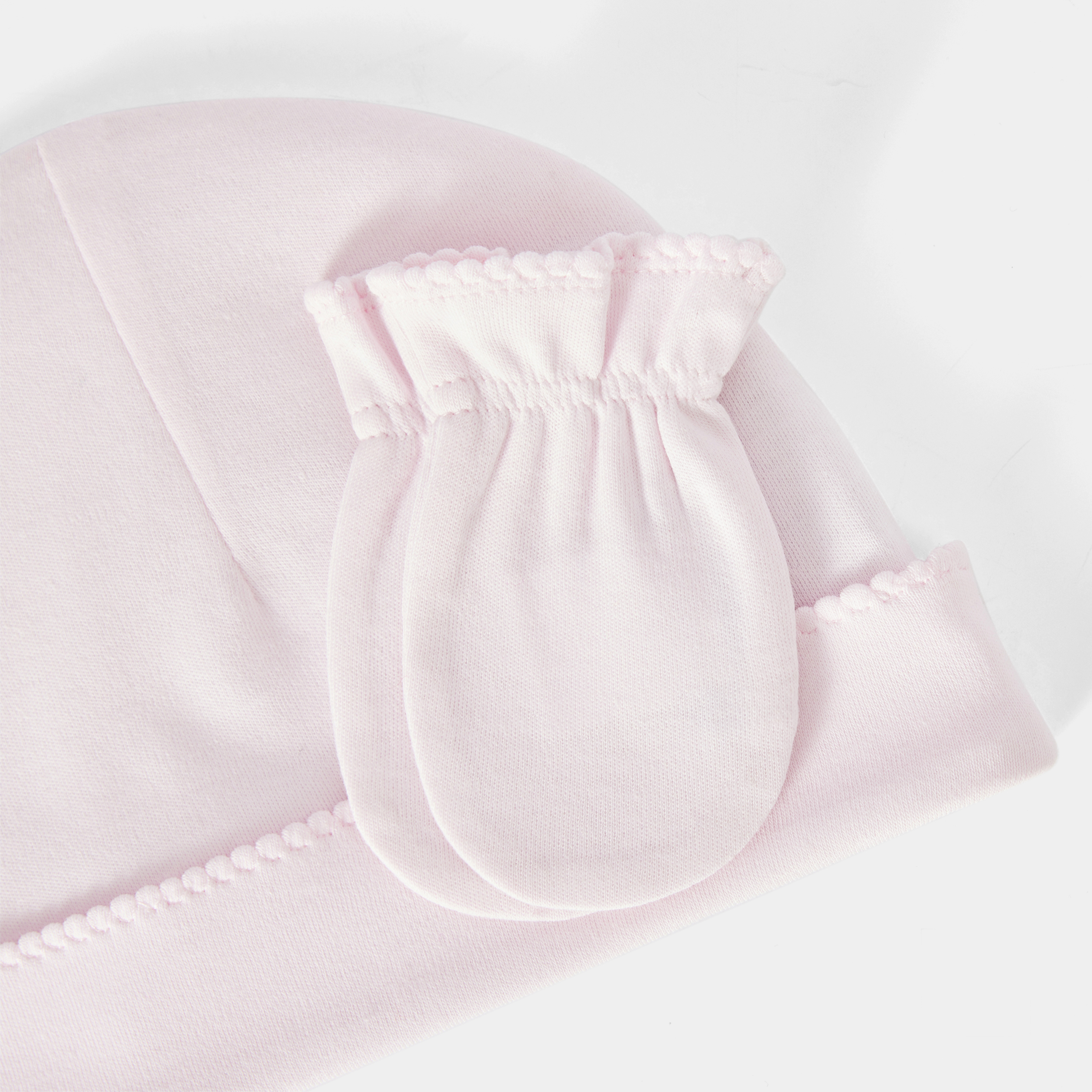 Composto da un berretto e da muffole coordinate, questo completino punta sulla morbidezza di una morbida maglia in cotone biologico. Immancabile nella valigia per il parto per coprire il neonato e proteggerlo dai piccoli graffi, sarà una bella idea regalo per i futuri genitori.
