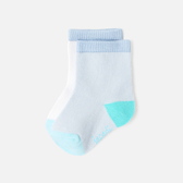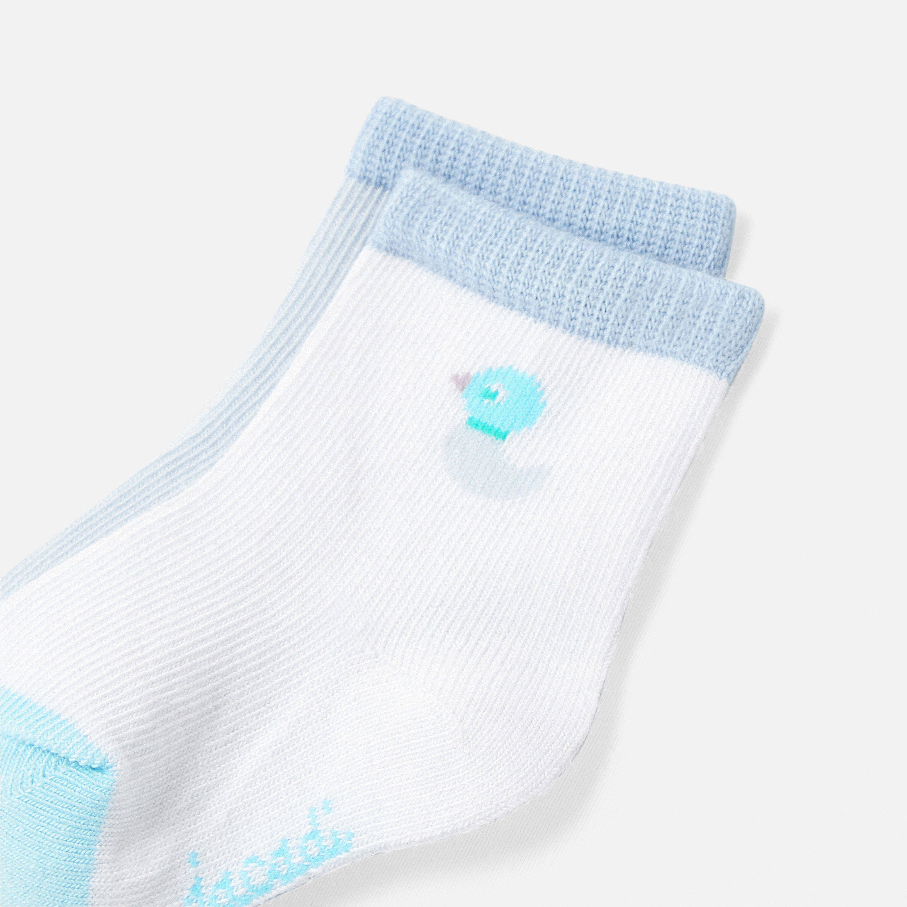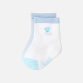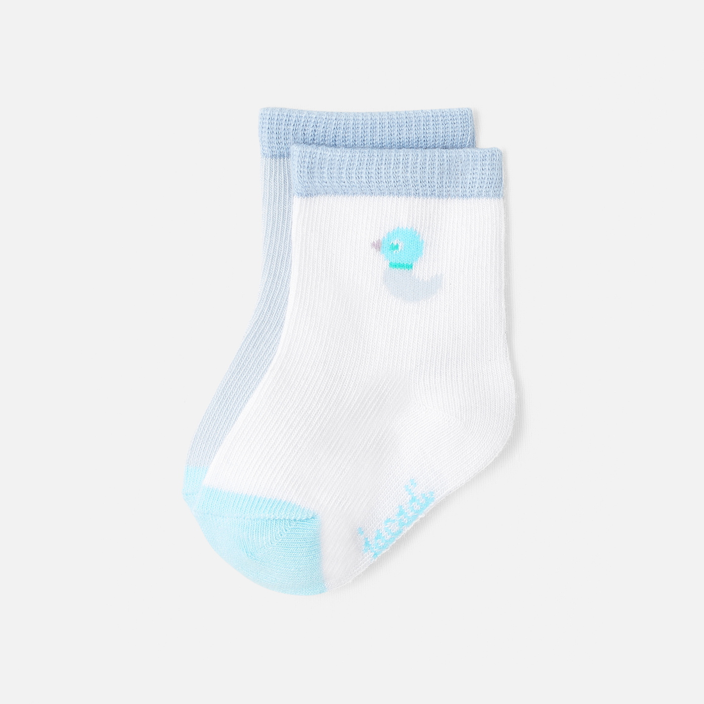 Un modello corto e facile da infilare, i calzini bimbo di questa stagione sfoggiano colori luminosi. Un paio abbellito da un effetto color block e l'altro ornato di un anatroccolo a intarsio, sono coordinati alla collezione di abbigliamento.