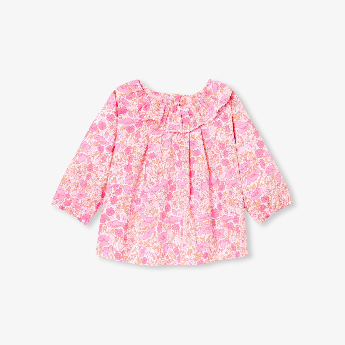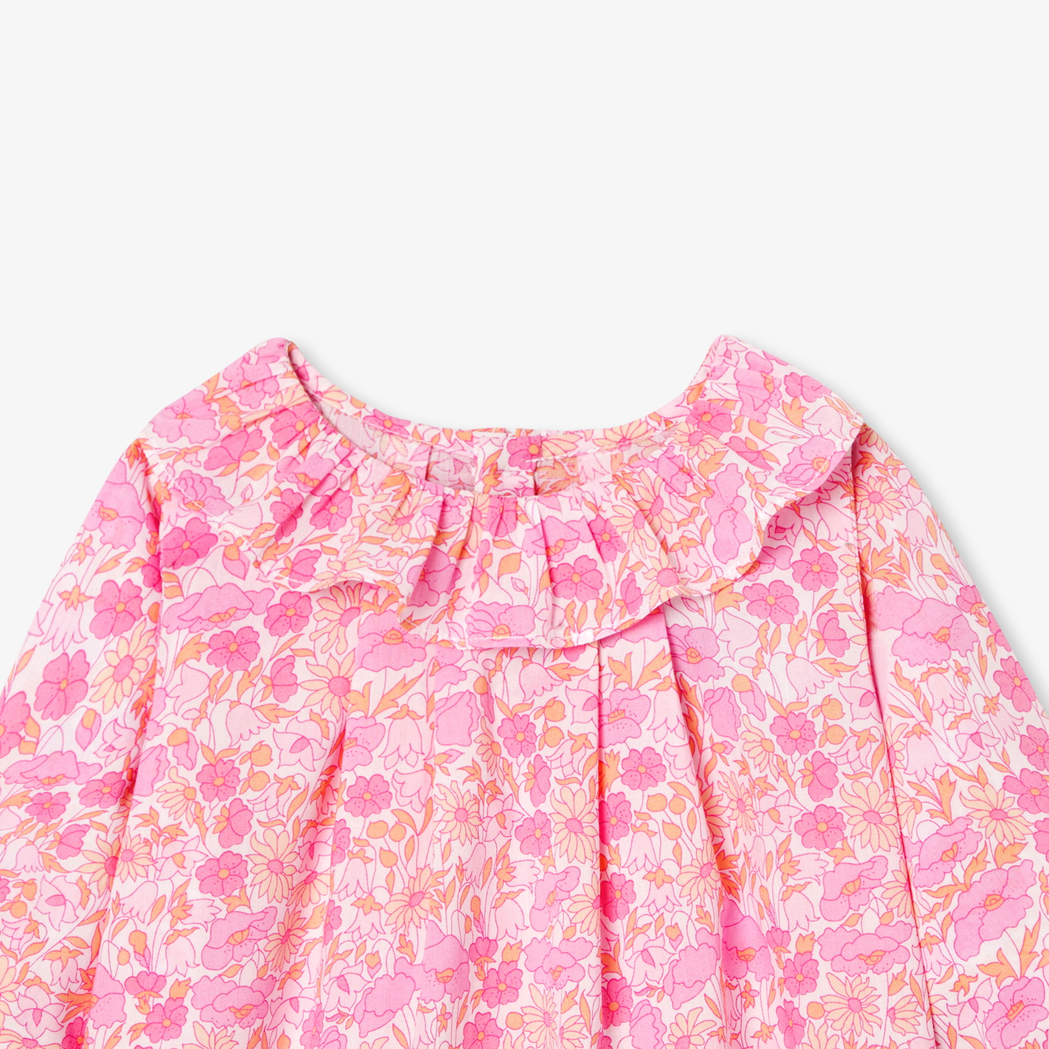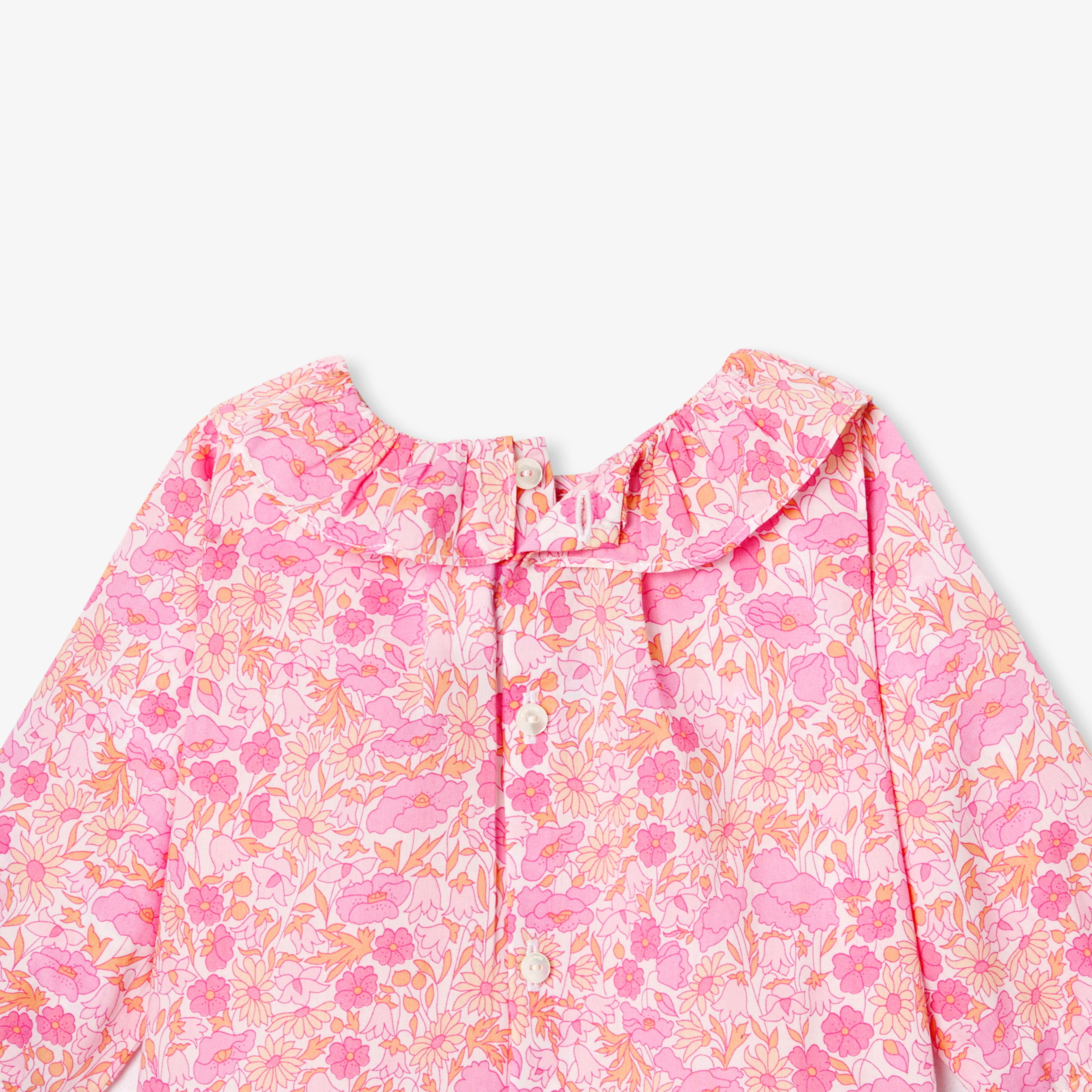 Questa blusa da neonata in tessuto Liberty unisce l'eleganza senza tempo di un incredibile motivo floreale al comfort di un morbido popeline. Impreziosito da un colletto con volant, le pieghe sul davanti e sulla schiena conferiscono un bel movimento. Facile da indossare grazie ai bottoni in madreperla naturale sulla schiena, aggiungerà un tocco poetico agli outfit di tutti i giorni.